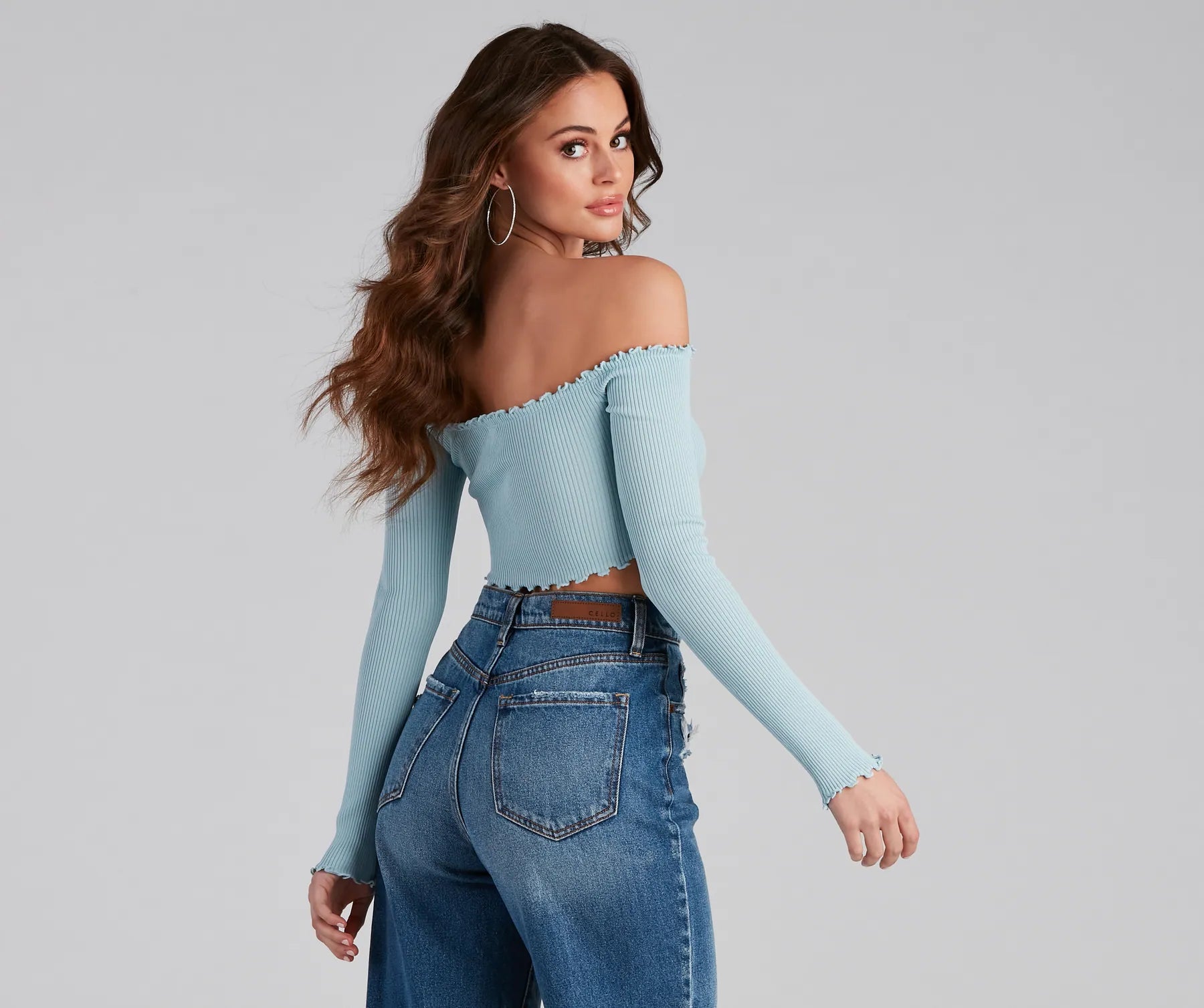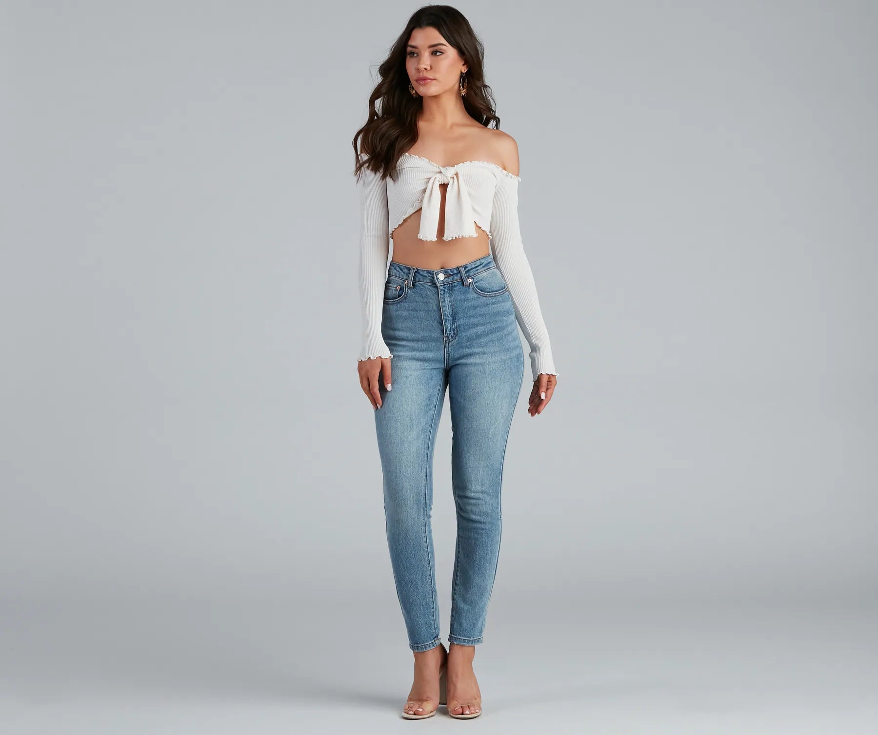 Get a trendy look for the season with this adorable crop top. Featuring an off-the-shoulder sweetheart neckline, long fitted sleeves, a tie-front detail, and a cropped, form-hugging fit, this top is perf for every day. Style with high waist jeans and mules.