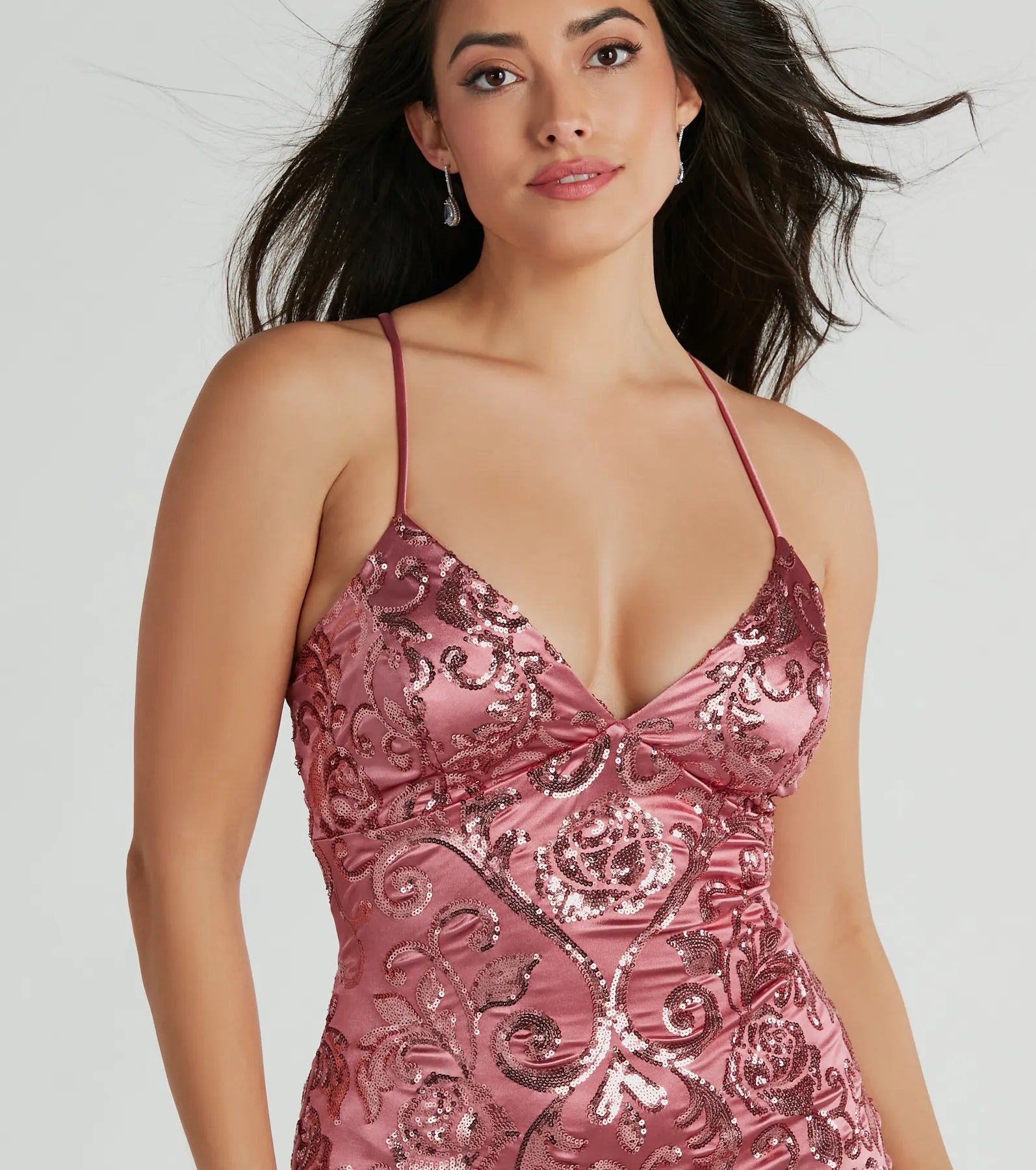 Gorgeous sequins shine on the Abby satin party dress with daring sultry details sure to turn heads at bachelorettes or parties! Be a showstopper in her sexy plunge V-neckline and mini-length bodycon silhouette that enhances your curves, while the padded bra cups provide support. The lace-up back adds a touch of sophistication, complementing the satin fabric and intricate sequin scroll pattern. Complete the look in platform heels, jewelry, and a clutch for an unforgettable night!