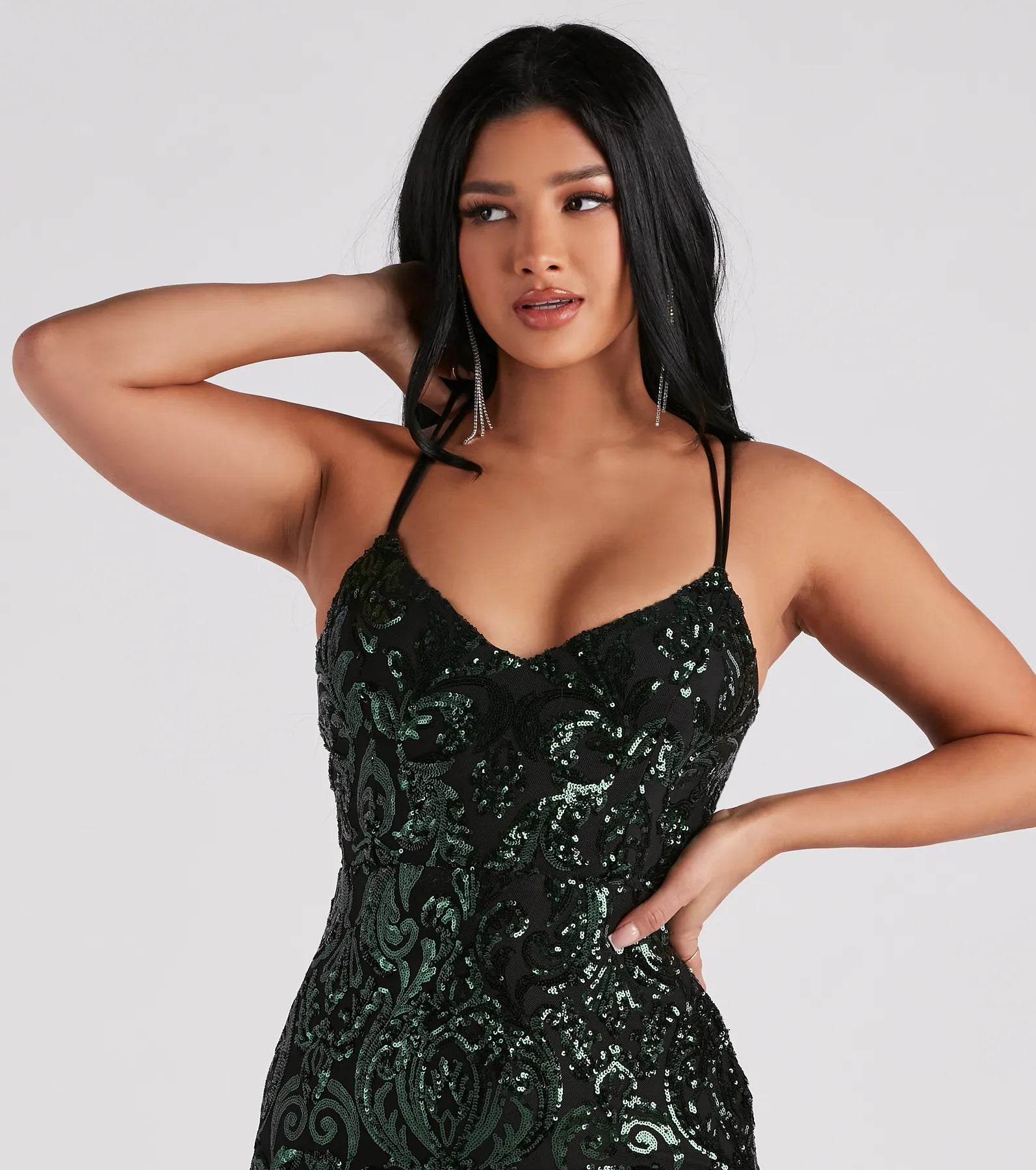 Bring the glitz and shine to your evening with a formal dress that illuminates the night! Adora features a plunging V-neckline with padded cups, a double row of adjustable spaghetti straps, a cross-back design, a sequin scroll pattern, and a midi-length silhouette. The dress is composed of a lined mesh fabric that offers a form-hugging fit with minimal stretch. Complete the look with chrome heels and door-knocker earrings for ultimate glam!