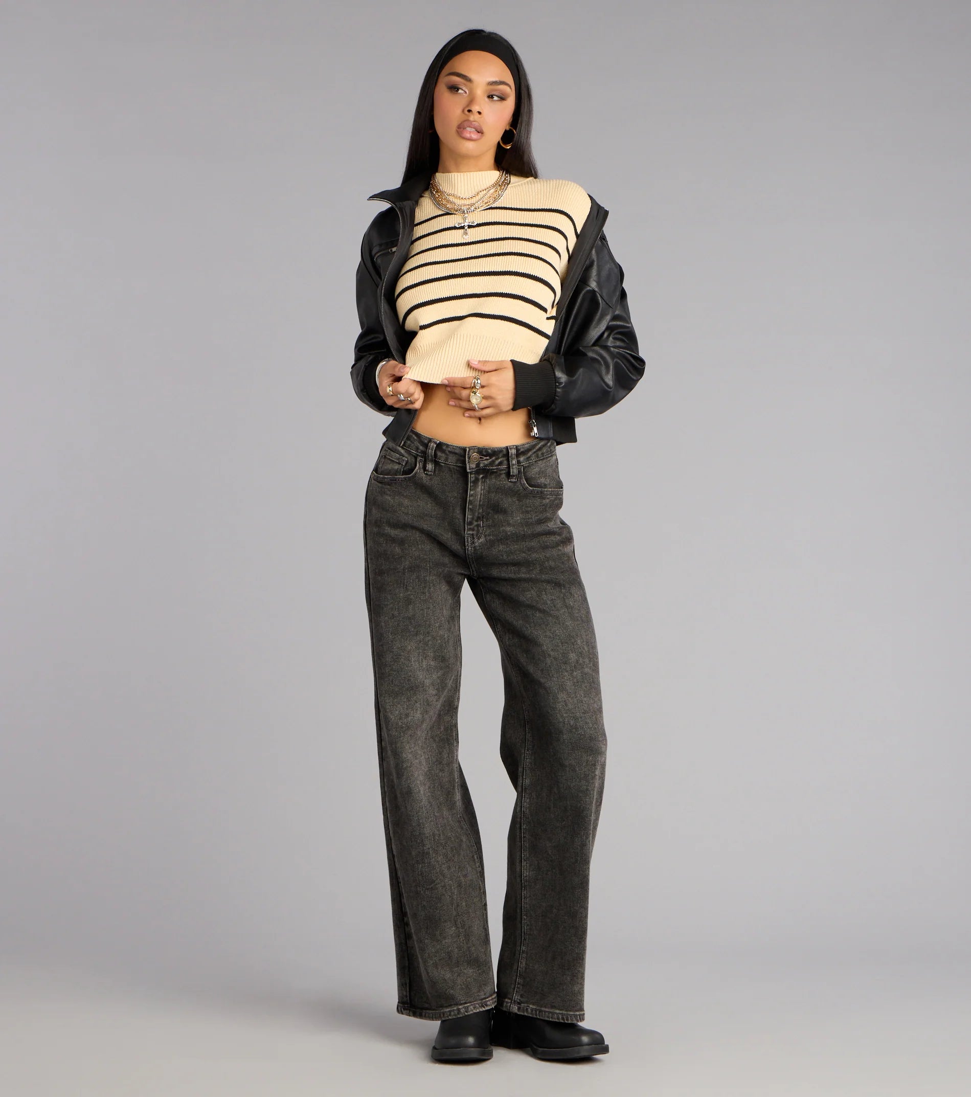 Stripes that never miss. This mock neck dolman sweater pairs soft knit comfort with a relaxed crop hem with slit accents that pair perfectly with fall and winter styling!