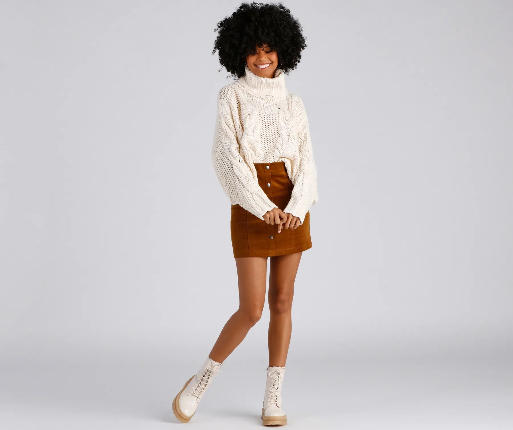 Get all the cozy vibes in this chunky knit sweater! It features a trendy turtleneck, long dolman-style sleeves, and a mid-length hem with a relaxed fit. Style this cable knit sweater with high-rise jeans and ankle booties.
