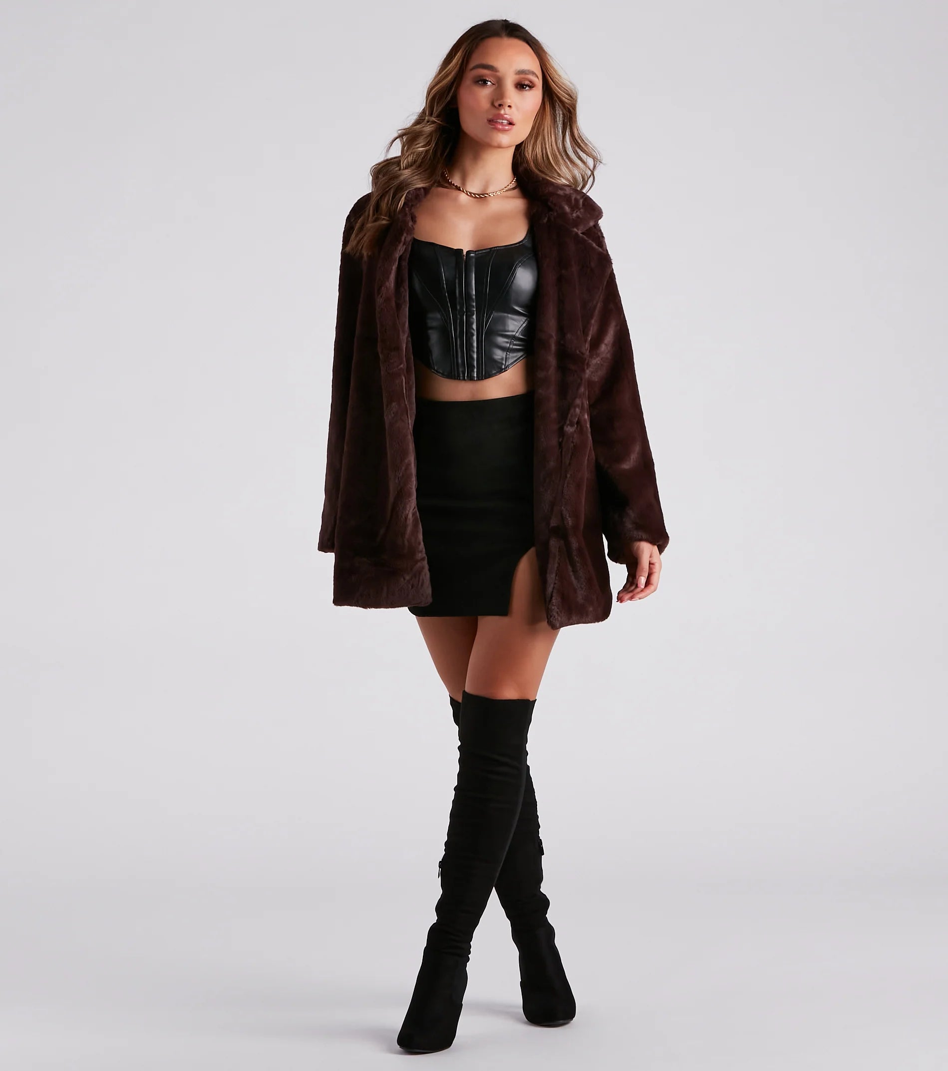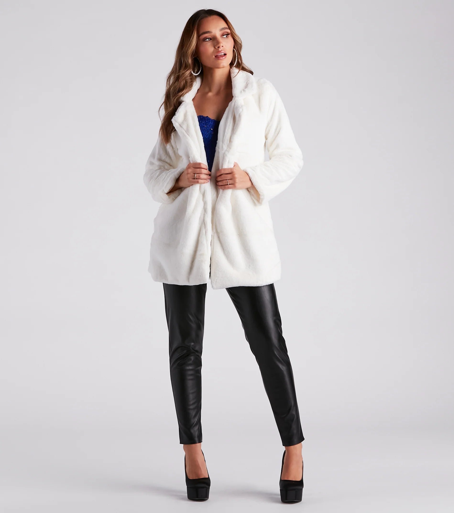 You'll always look luxe when you layer your 'fits with this sophisticated faux fur coat! Featuring a lapel collar, long sleeves, an open front, lined side pockets, and a long-length hem, this coat will elevate your winter wardrobe. The ultra-soft faux fur fabric includes a smooth lining. Style over a mini dress with knee-high boots.