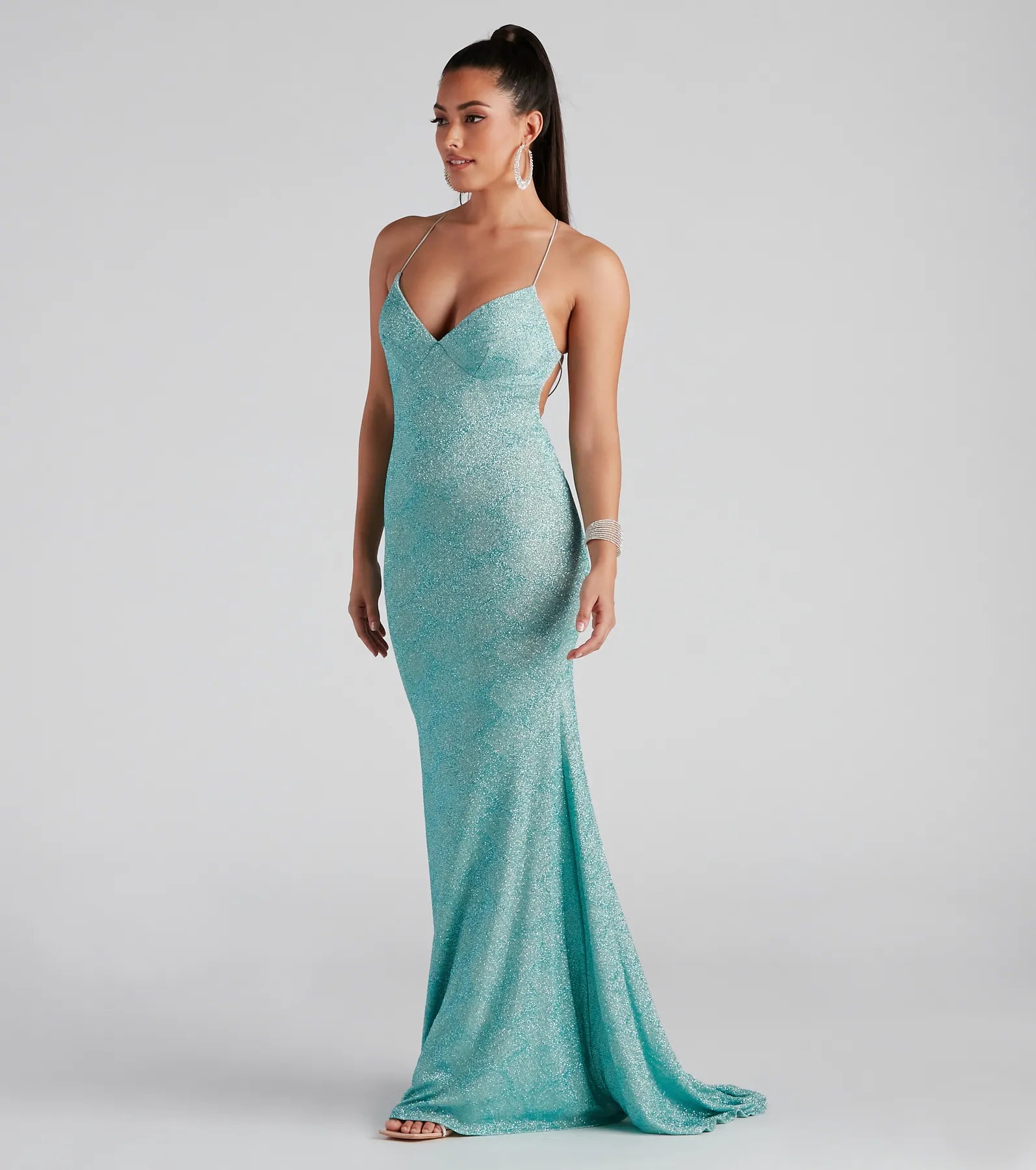 Andrea brings the glam to prom in a sparkly array of glitter. She flaunts your femme figure on a sleeveless V-neckline with sleek bungee spaghetti straps that lead to her sultry open-back with strappy detailing. Her curve-hugging silhouette gracefully leads to the floor-length hem that elongates your figure. The formal dress is composed of a stretch-knit-lined fabric with a gorgeous glitter design. Finish your prom look with statement earrings.