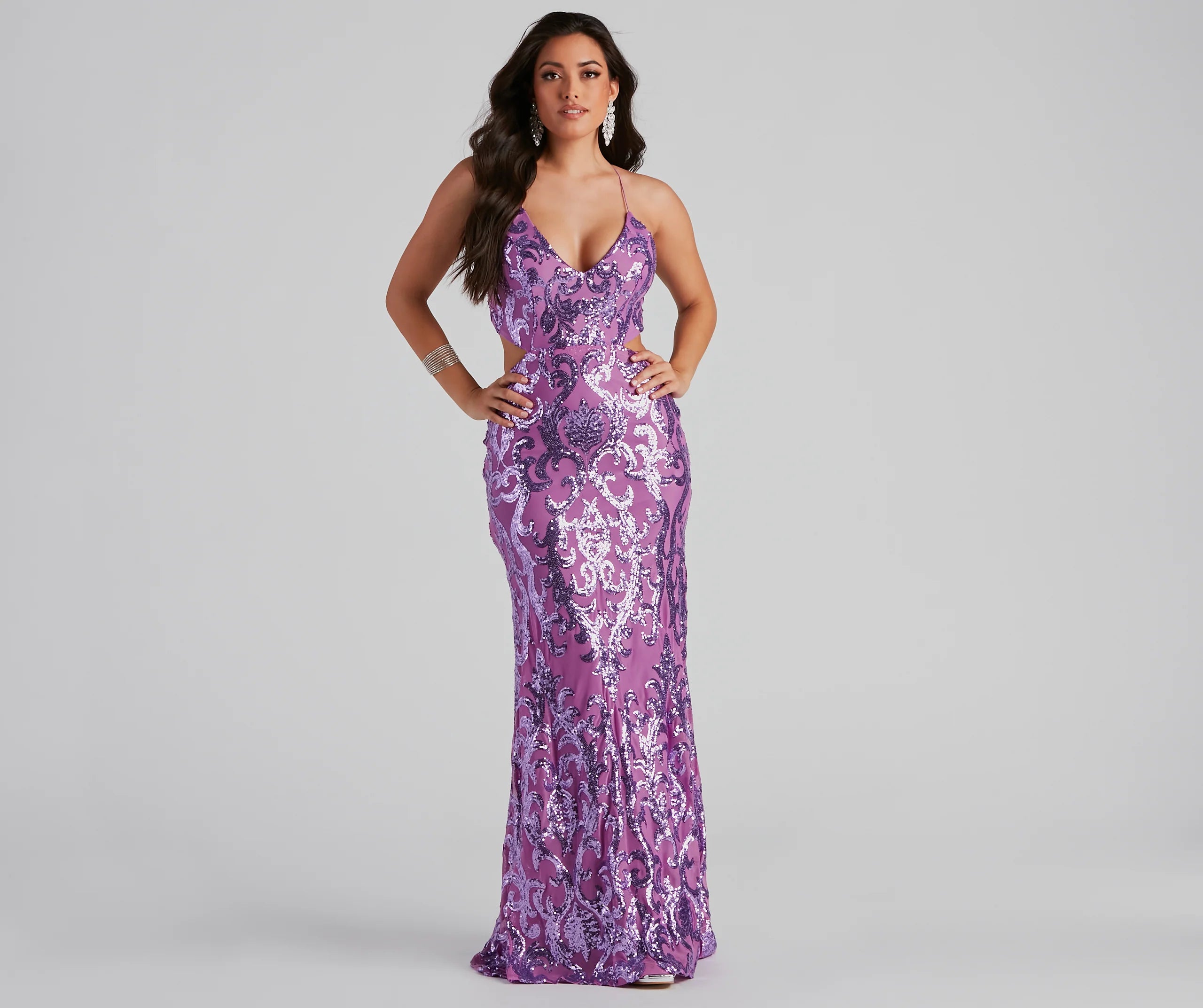 Bring the sparkle and shine with a formal dress that illuminates at your special event. Anisa features a sleeveless V-neckline with padded cups, bungee spaghetti straps that cross at the back, and a bold open back with a sleek bungee bar strap. Her slim-fit bodice features dual cutouts at the waist and an A-line silhouette. The dress is composed of a lined mesh fabric with a damask sequin pattern. Complete your formal outfit with rhinestone heels.