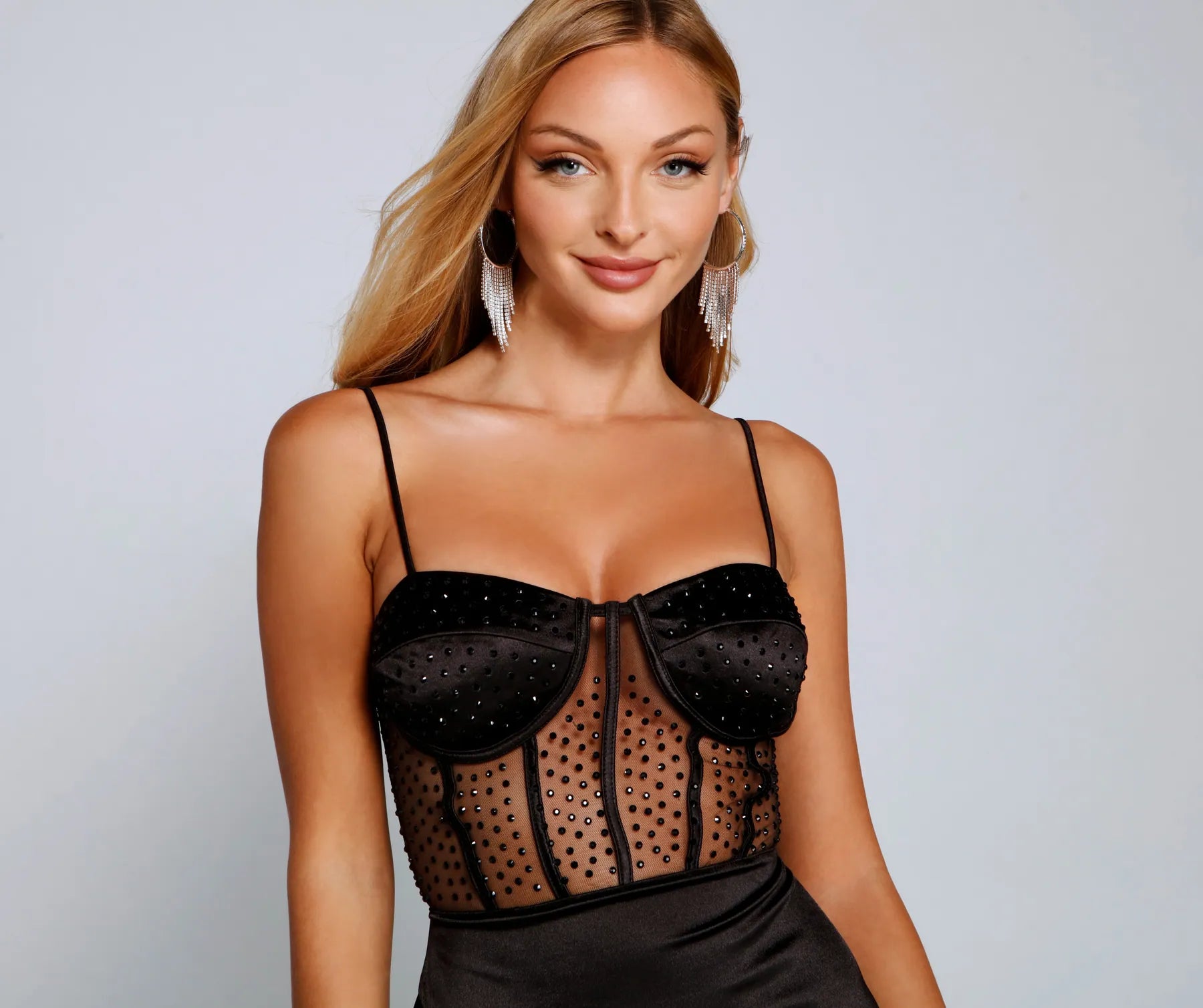Bring the sparkle with the Aubrianna formal dress! She'll put you in the spotlight with all eyes on you. Aubrianna features a sleeveless sweetheart neckline, adjustable spaghetti straps for a customized fit, a bustier-like bodice, and lined and padded cups. Her sheer mesh illusion bodice features heat stone embellishment, contrast piping, and a high waist seam leading to a flirty ruffled satin skater skirt. The dress is composed of a combination of mesh and satin fabric that offers a fit and flare silhouette with minimal stretch. Complete the look with rhinestone heels.