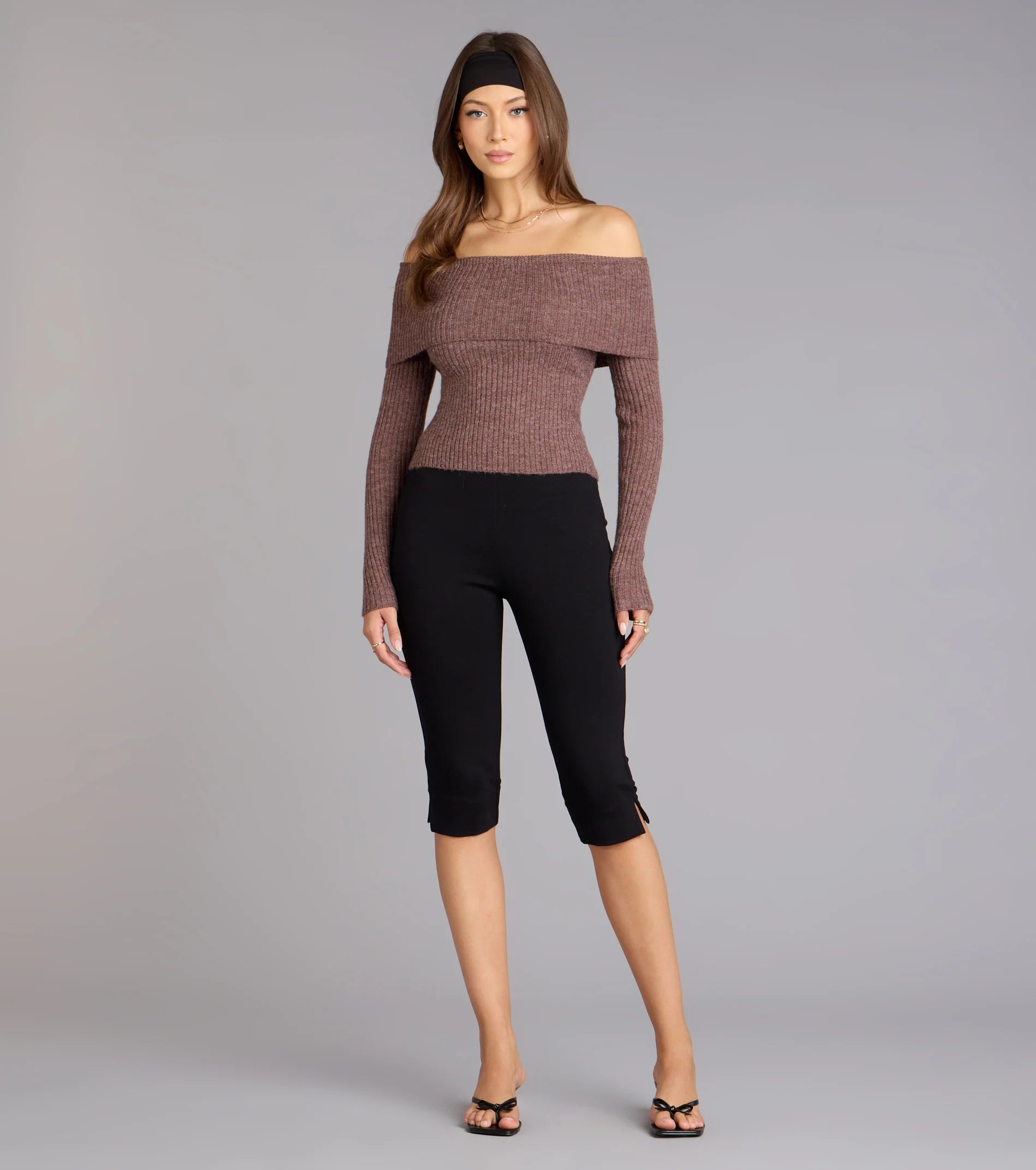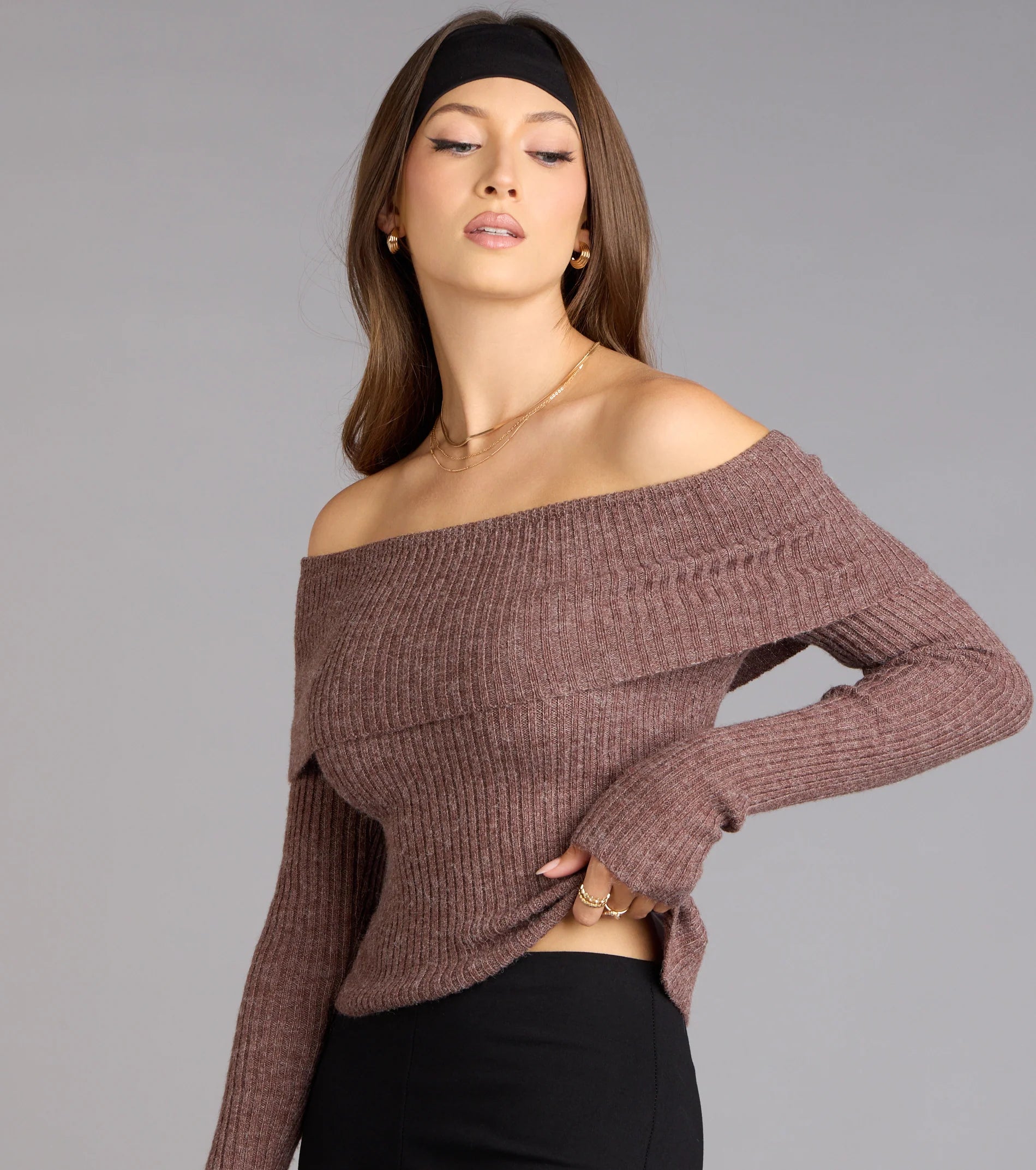 The sweater that nails cozy and confident. This off-the-shoulder sweater features a foldover neckline and a fitted, flattering shape that feels effortlessly chic. Perfect for pairing with capris, denim, or the classic skirt and tights combo.