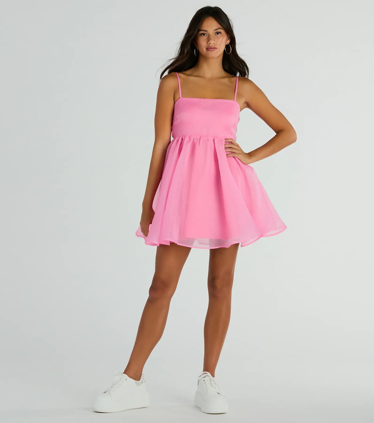 Everyone will know you're the babe of the hour in this sleeveless babydoll dress at parties and celebrations! Featuring a square neckline, adjustable spaghetti straps, and a stretchy smocked back adorned with a cute bow tie. The babydoll silhouette, mini-length hem on organza woven fabric will have you feeling confident and playful! Complete the look platform shoes.