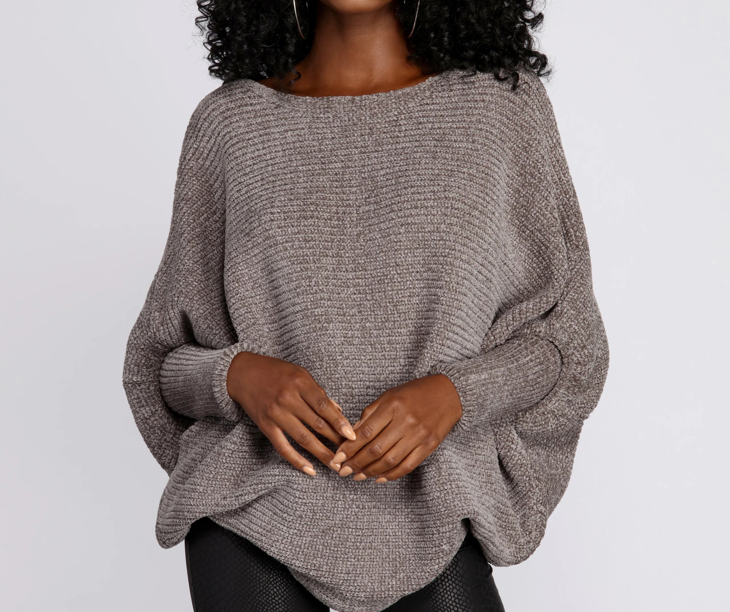 Add a touch of cozy to your winter attire! This chenille knit sweater is designed with long dolman style sleeves, a boat neckline, and a hem that hits past the waist. It has a comfy over-sized fit and is composed of a chenille knit material that offers moderate stretch.