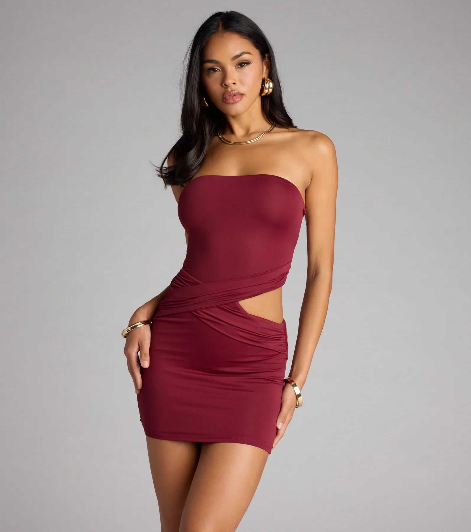 Warning: may cause jaw drops. With a sleek tube neckline and a sultry cutout, this bodycon mini dress is serving curvy drama all night long!