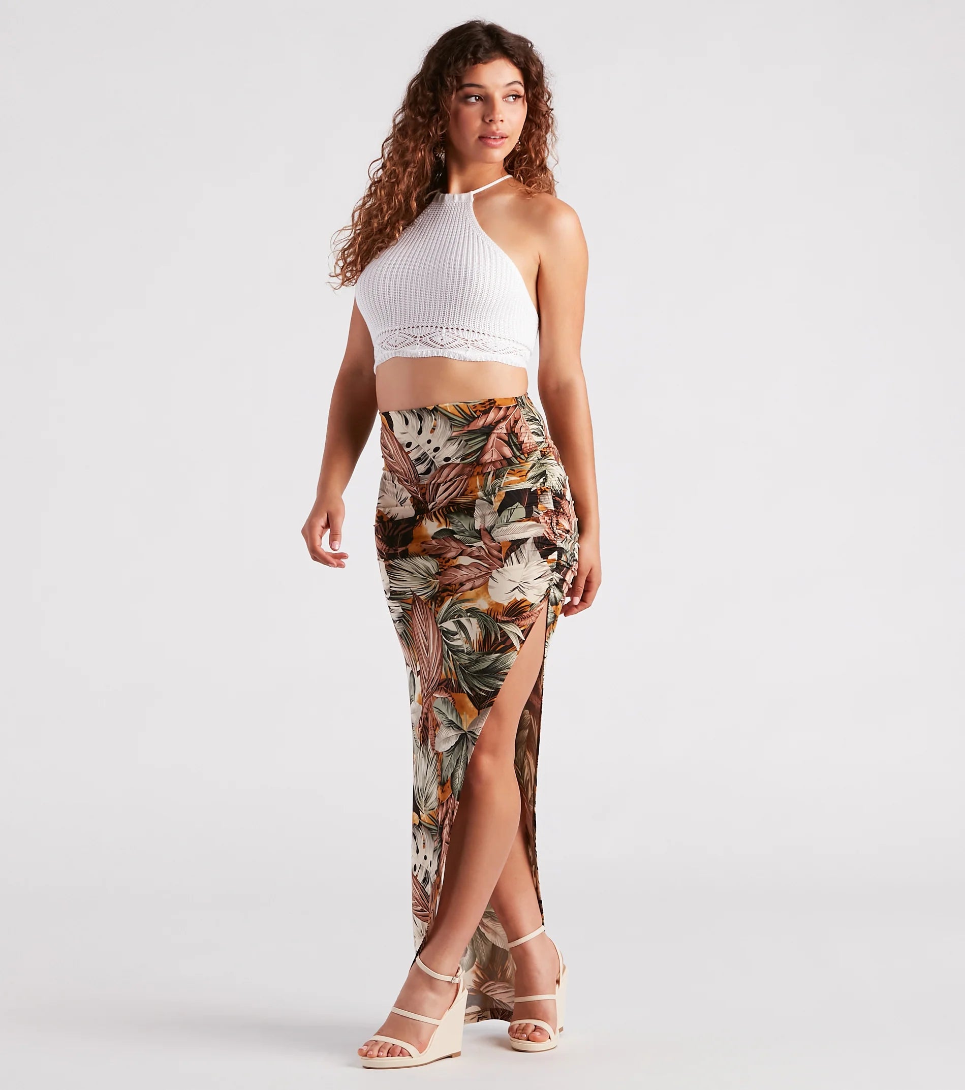 Create a dreamy bohemian-inspired look with this sweater knit crop top. It features a sleeveless halter neckline with spaghetti straps, an open back with cross-back straps and a lower lace-up strappy design, and a fitted, cropped hem with a dainty eyelet pattern. Style with a printed maxi skirt and strappy sandals.