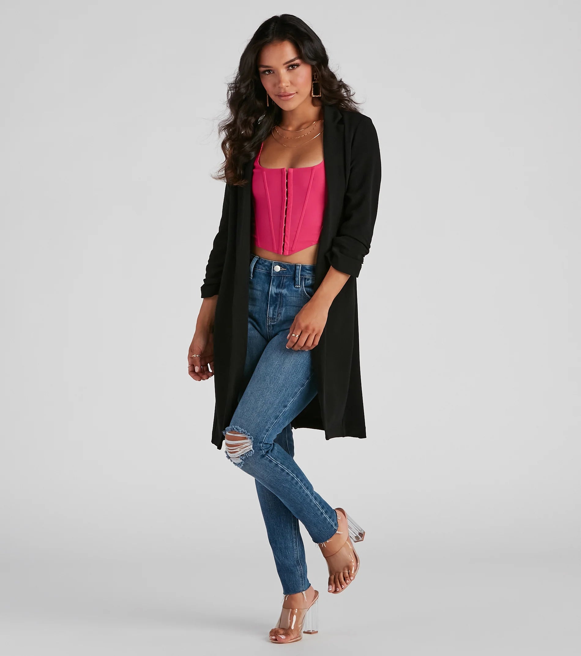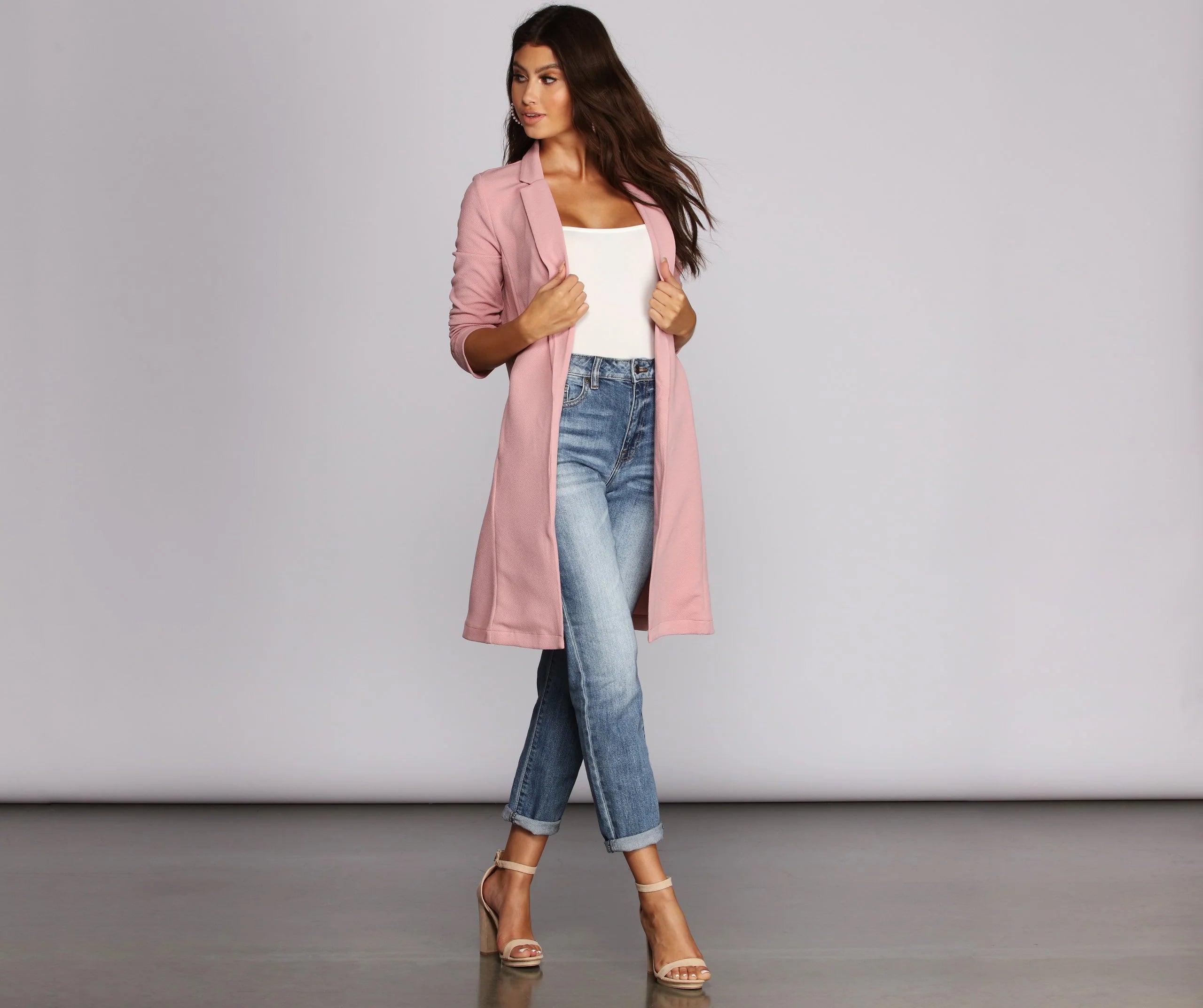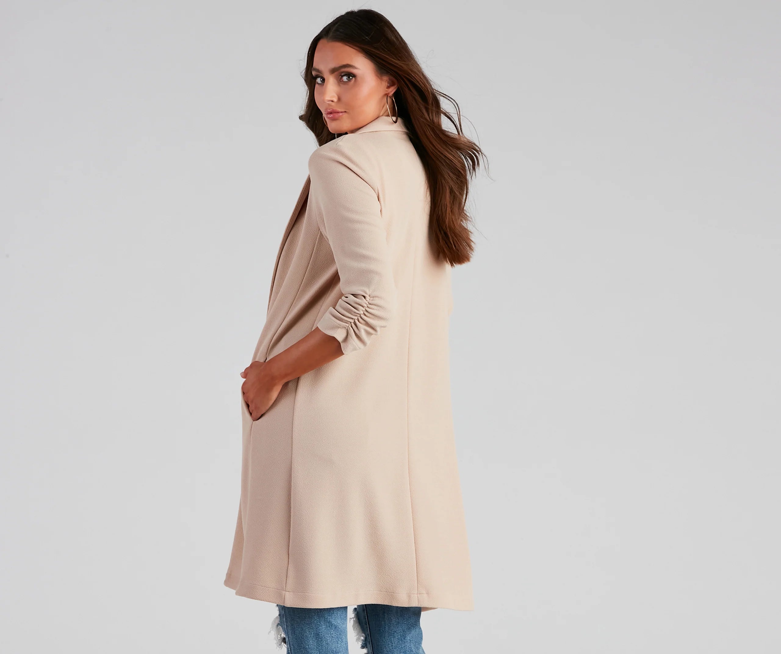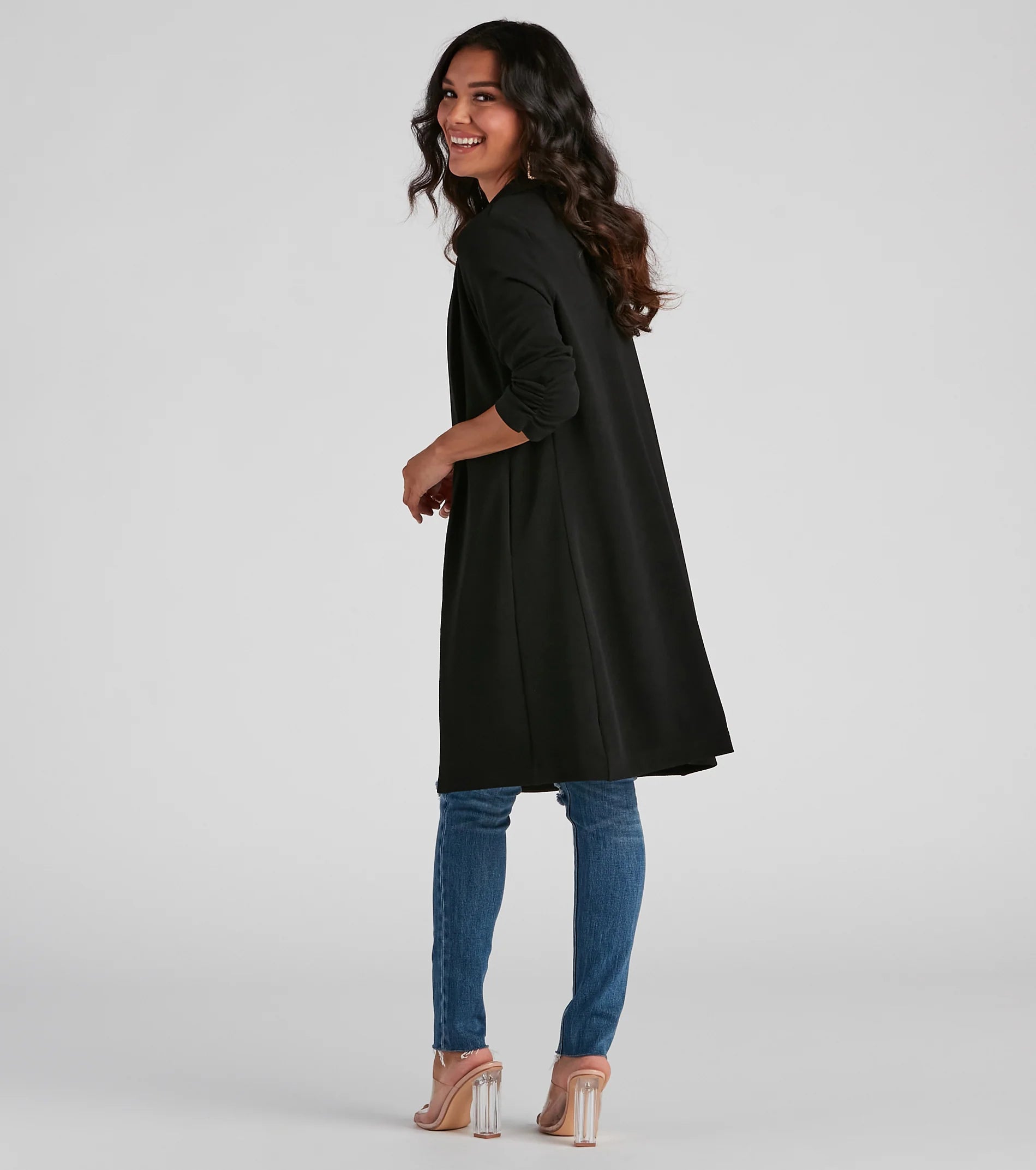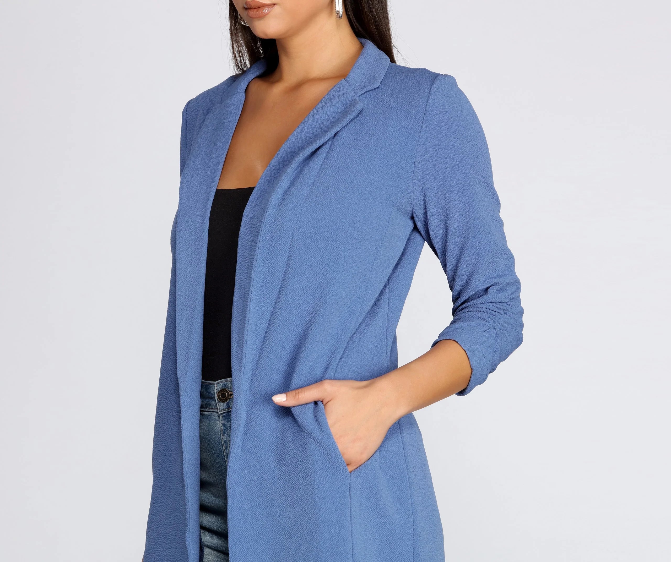 Command the boardroom like the boss you are in this crepe blazer! It features three-quarter length ruched sleeves, a flat collared neckline, and a longline design. Layer over high-rise bottoms and a chic blouse.