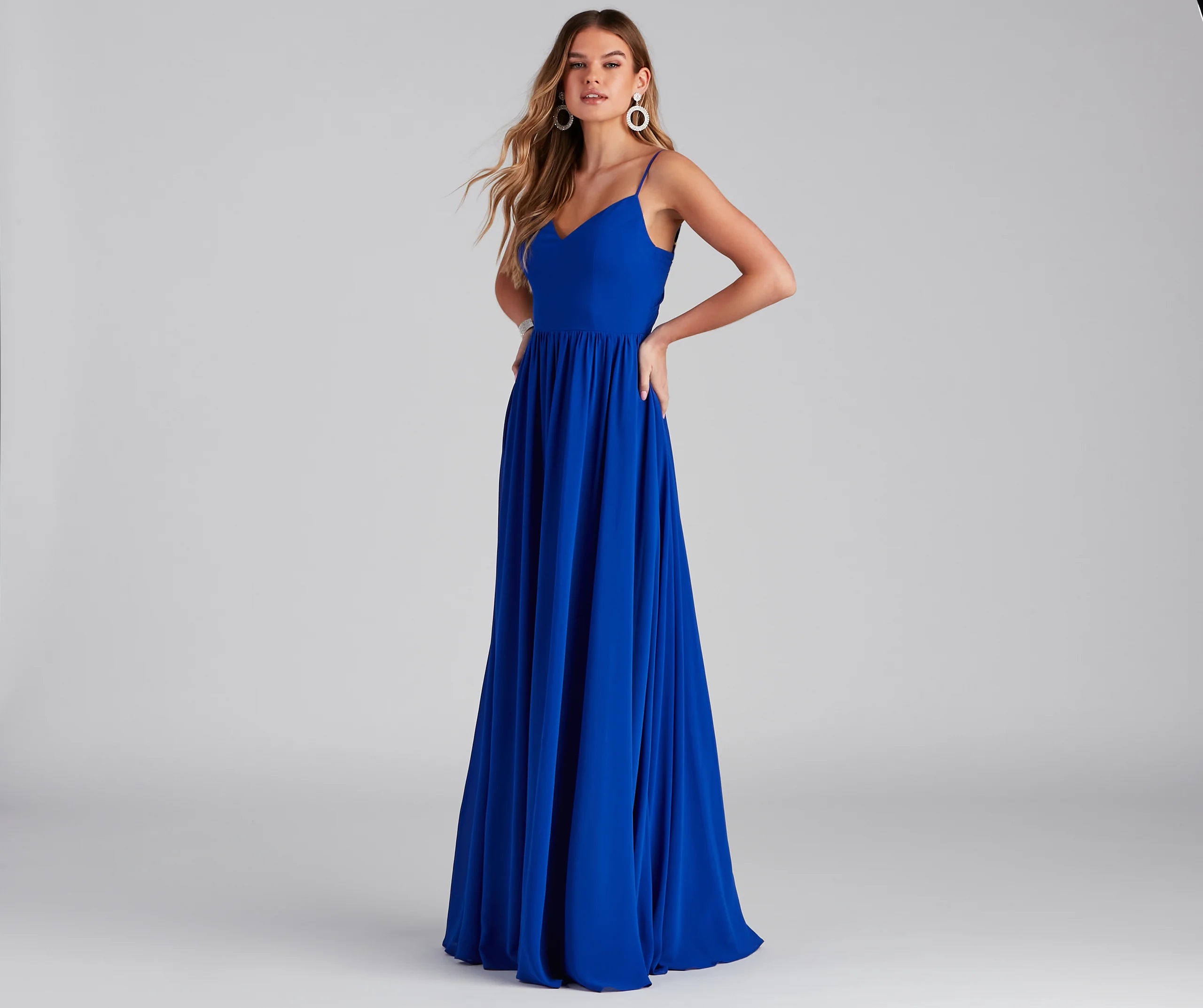 Make an impressive exit in the open-back style of the Brailey Formal Chiffon A-Line Long dress! She's sure to make you feel and look royal for your next formal occasion in her sleeveless padded V-neck, customizable spaghetti straps, and delicate pleat detailing. Accentuate your figure in her A-line silhouette that effortlessly flows into a floor-length hem. The formal dress is composed of flowy chiffon fabric with an inner lining and a convenient back zipper closure. Complete the look in a sparkly tiara to look like the queen you are!
