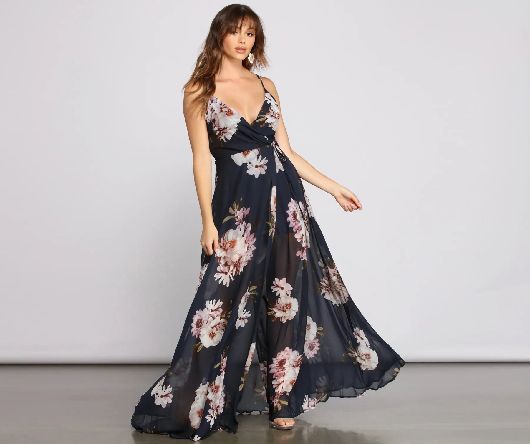 Give our gorgeous Breanne dress a twirl with her flowy floral A-line skirt! She features a wrap front V neckline, a flattering high waist, and a sheer skirt with a short lining. Stun as the guest of honor at your next fall wedding and pair with some sleek heels and gold hoop earrings.