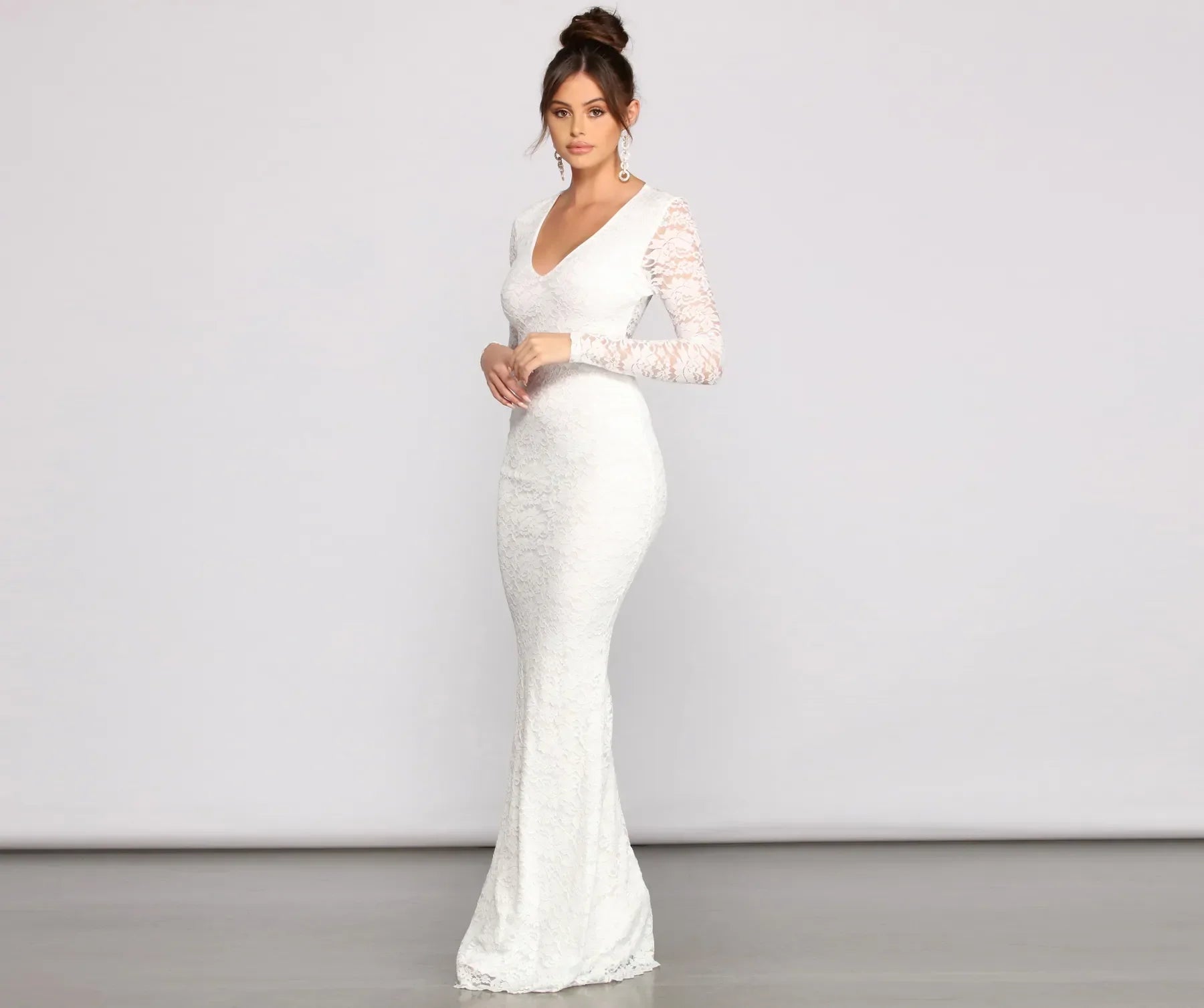 Get an effortlessly beautiful look in our stunning Brooke lace formal dress! She features a V neckline, long fitted sheer lace sleeves, a sheer lace back with a keyhole and lower back cut out, and a floor-length, curve-hugging mermaid silhouette. Complete your gorgeous look with rhinestone statement earrings and a sleek ring pack.