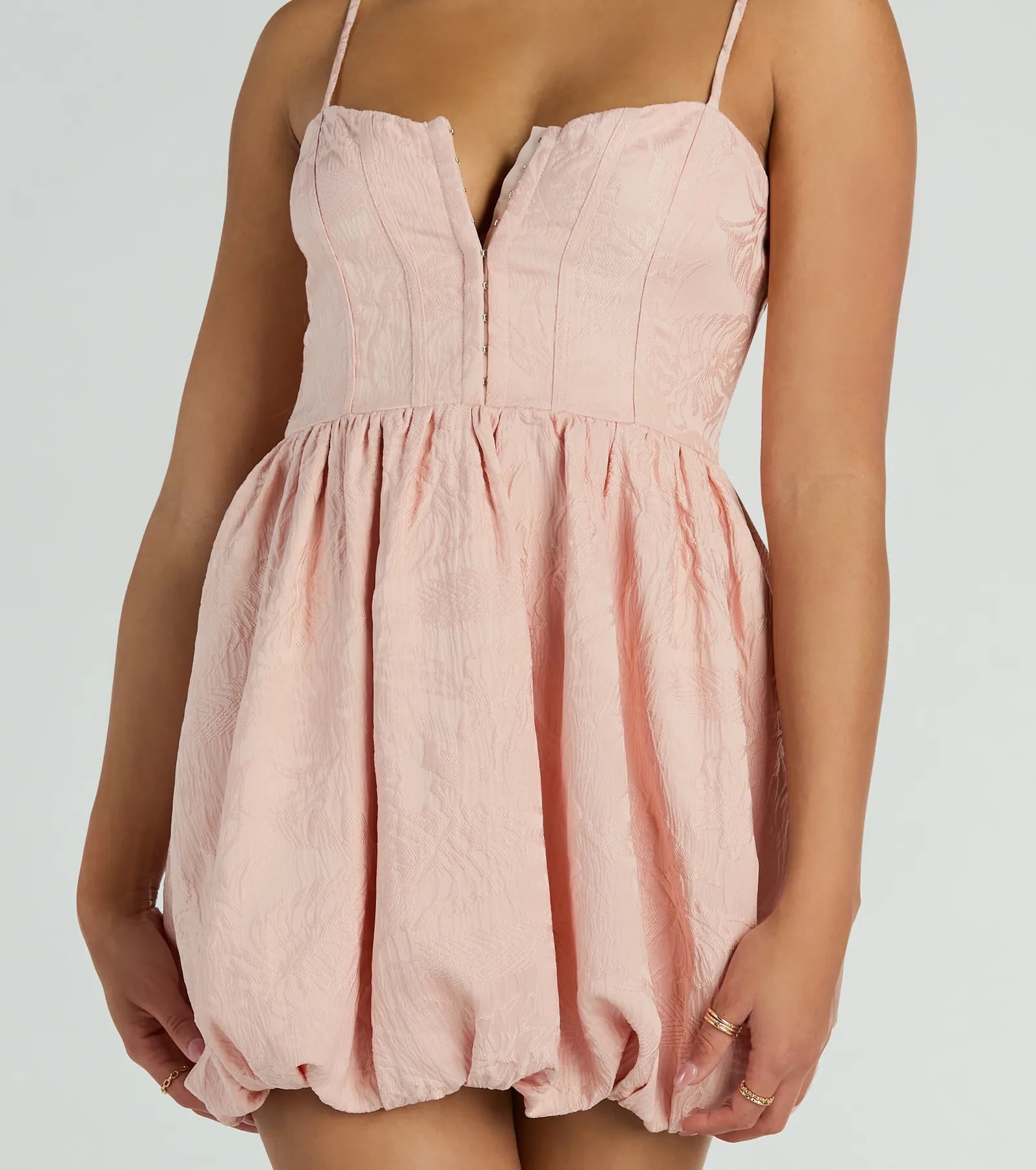 You'll always have people falling for you in this corset skater party dress at parties! The square neckline and adjustable spaghetti straps keep it trendy while the corset bodice and hidden front hook and eye fasteners provide a flattering silhouette. The stretchy smocked back and embroidered woven fabric add style to this playful bubble hem dress. Complete the look with earrings.