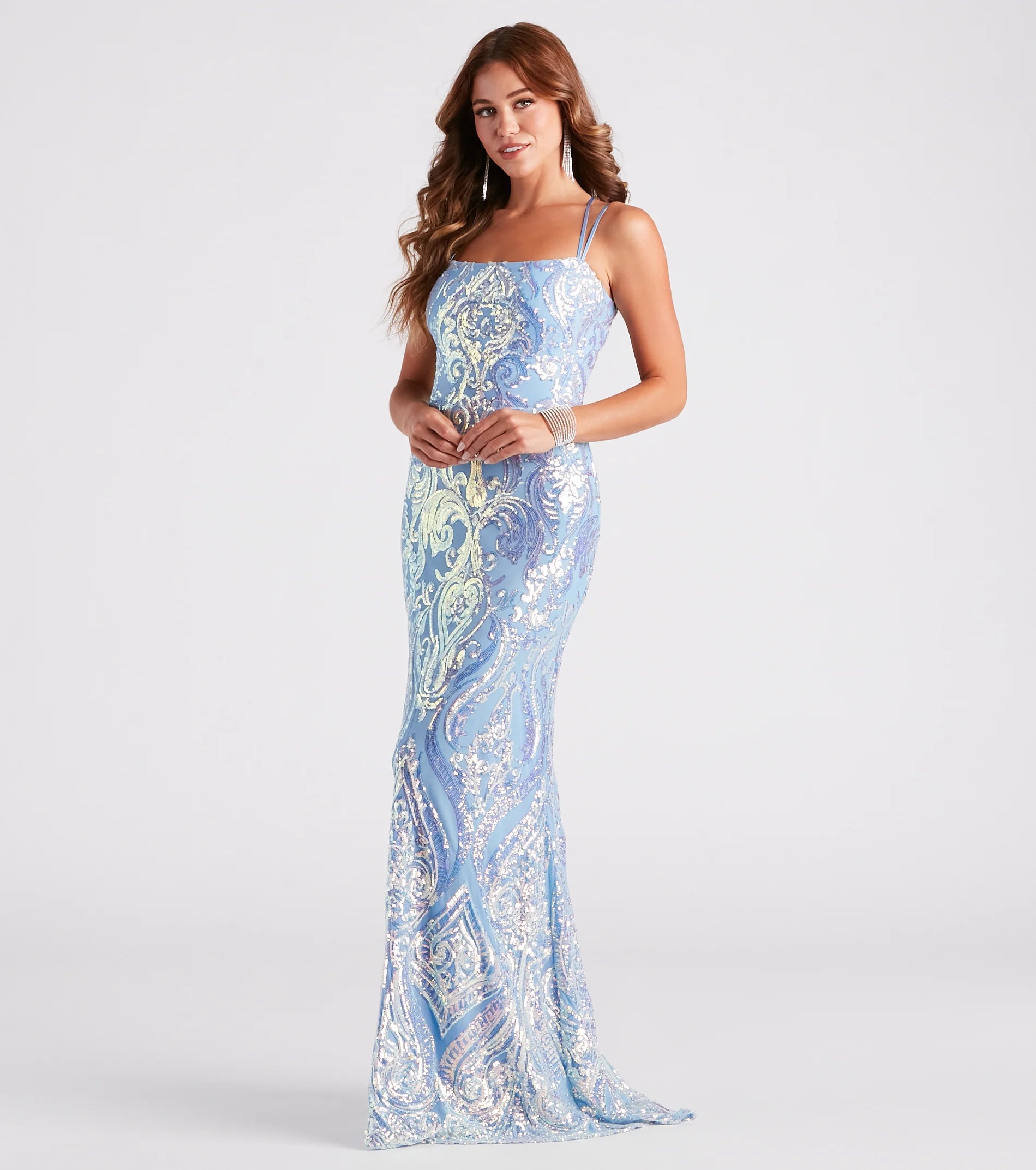 Shine like the star you are in the Camilla formal sequin dress to strike a stunning impression! Perfect for school dances, celebrations, and weddings she shines under all the lights. Featuring a sleeveless square neck, adjustable dual spaghetti straps, a lightly padded bust, a lace-up back tie design, and a mermaid silhouette that flows into a floor-sweeping hem. The formal dress is composed of a sequin-embroidered scroll pattern on mesh fabric with a stretchy knit lining. Style with a chic clutch and bracelet to complete the look!