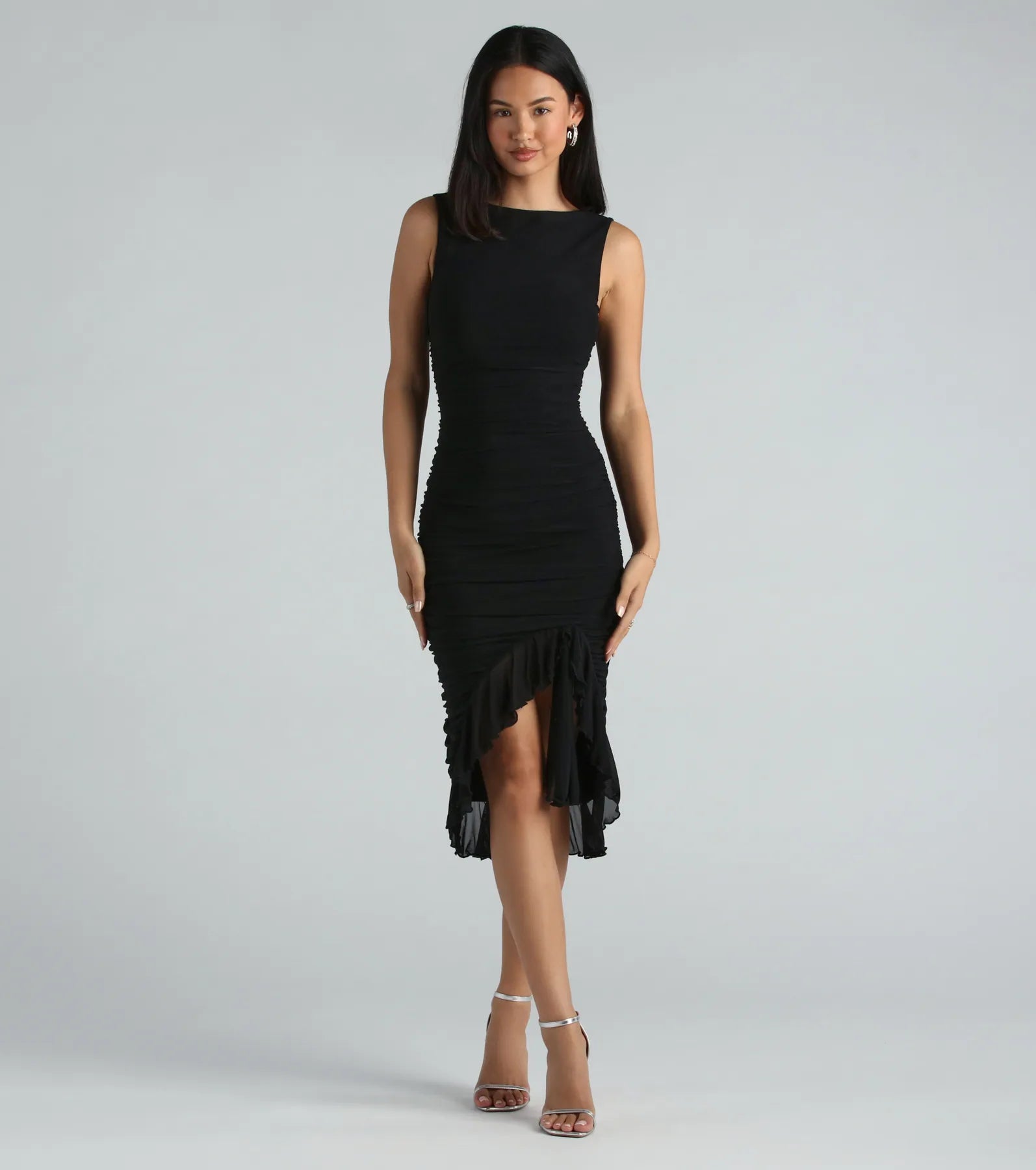 The Casey formal mesh dress will have you looking tasteful and elegant for banquets or rehearsal dinners! She features a sleeveless high neckline, a square-cut back, side, and back ruching to accentuate your gorgeous curves, a bodycon silhouette, and a playful surplice ruffled midi-length hem. The formal dress is crafted from a sheer mesh fabric with a sewn-in knit lining and plenty of stretch. Complete the look with earrings and stiletto heels.