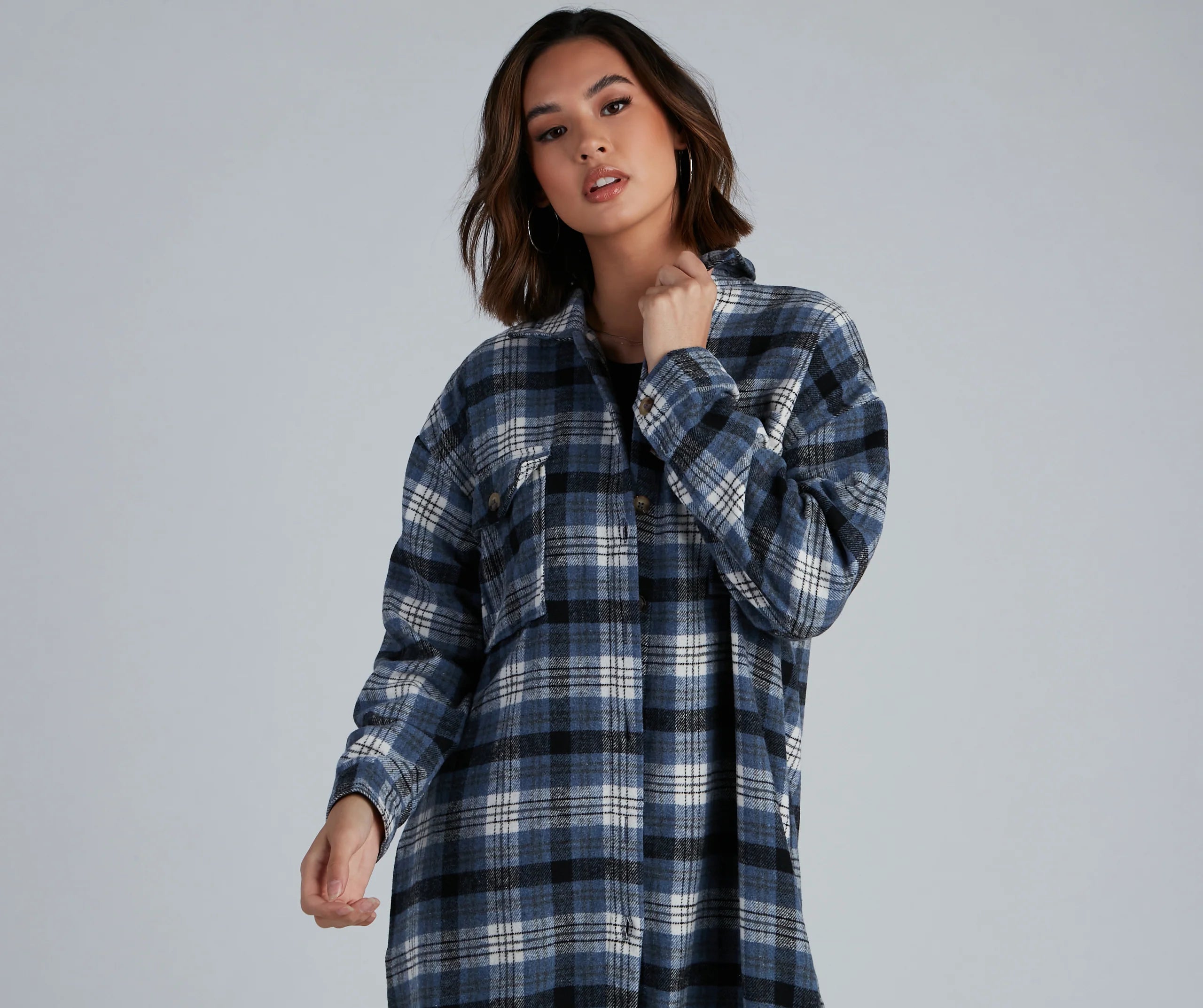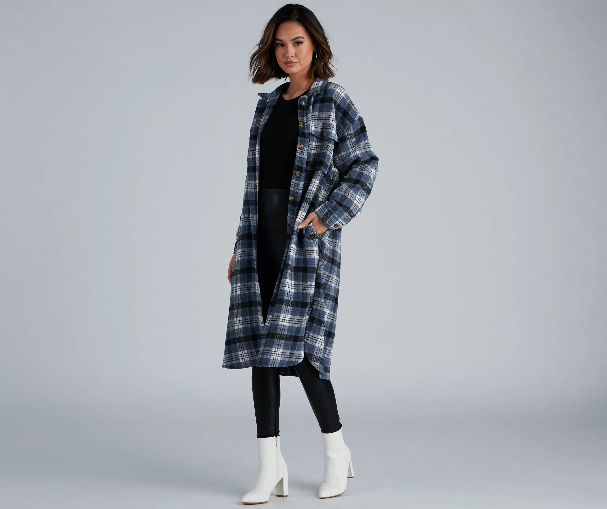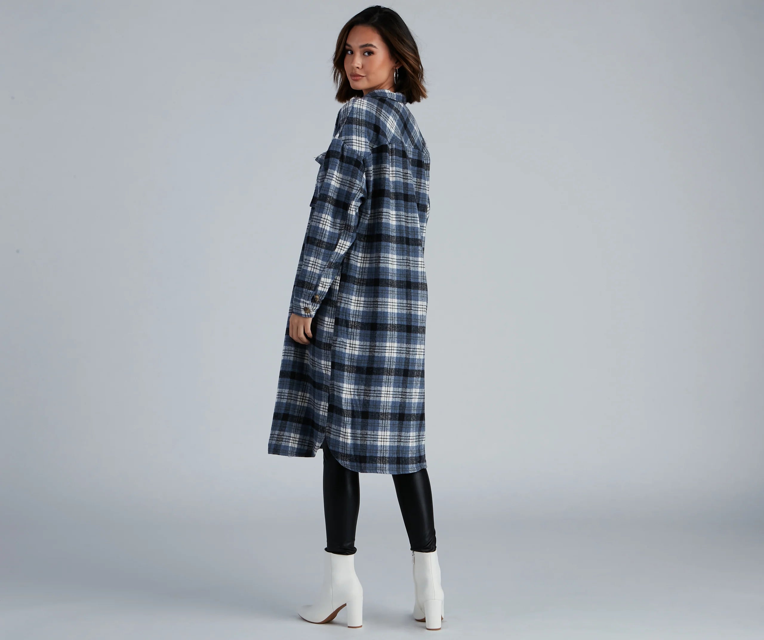 Layer on this casual-cozy shacket for an effortlessly stylish look! It features a collared neckline, long sleeves, a complete button-down front, hidden side pockets, and a long line silhouette with a relaxed fit. Wear this shacket with ankle booties.