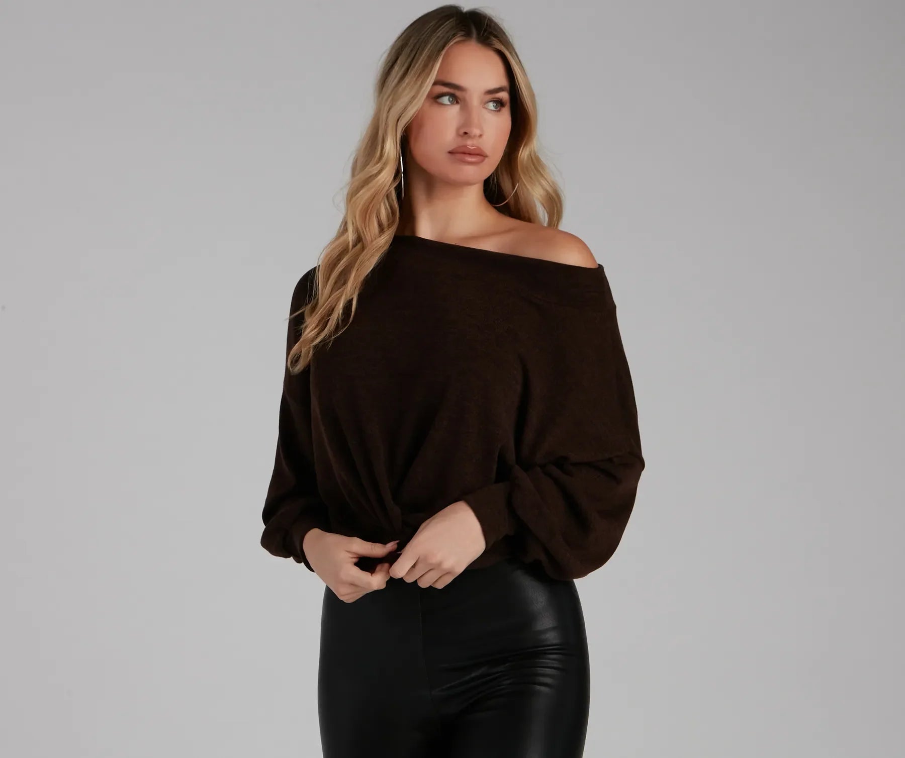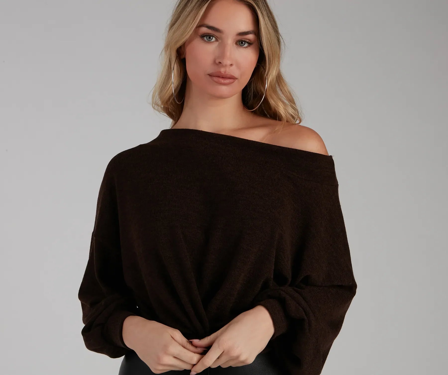 Showcase a casually elevated look in this soft knit top. Featuring an off-the-shoulder neckline, long dolman-style sleeves, and a center twist-front design at the hem, this top can be stylishly dressed up or down. Pair with faux leather pants and chic mules for date night.