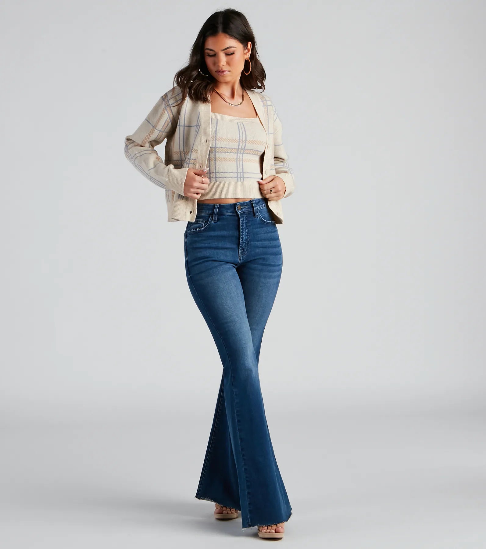 Step up your fall wardrobe with this casually preppy cardigan! Featuring long sleeves, a button-down front, a mid-length hem, a relaxed fit, and an all-over plaid print, this sweater knit cardigan is perfect for keeping it chic. Style with the matching crop top.