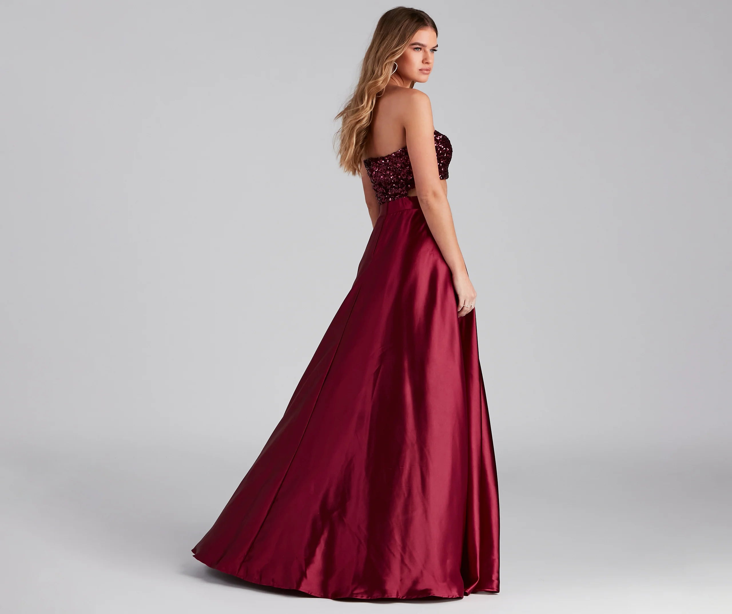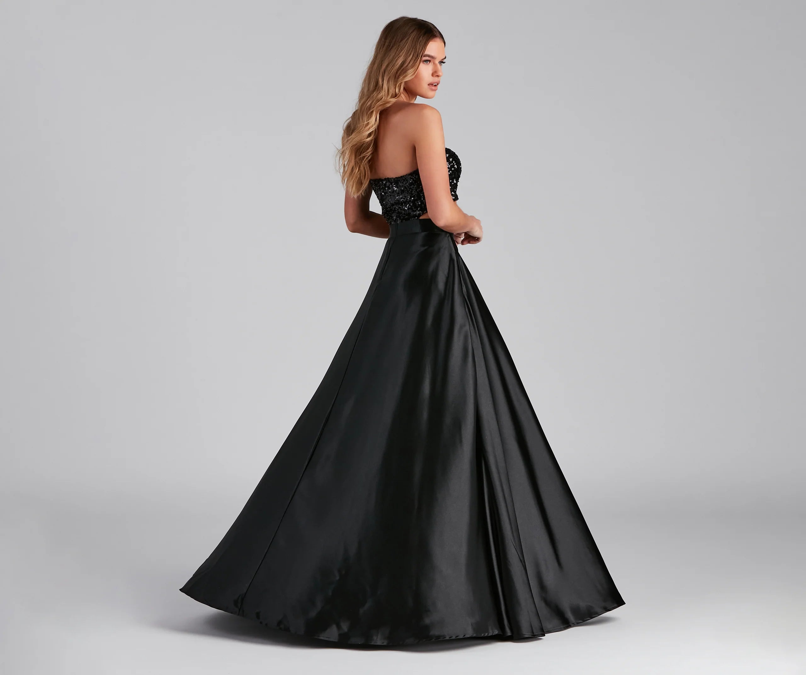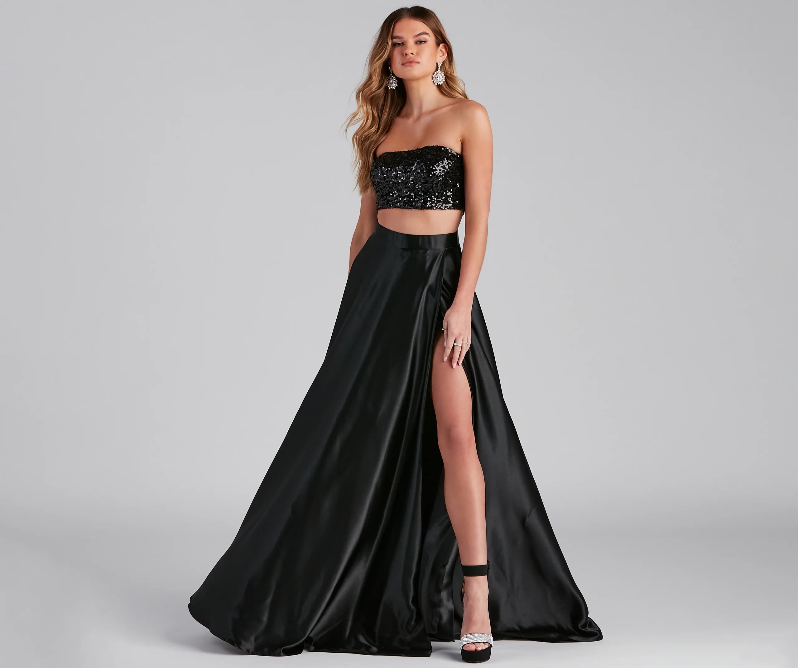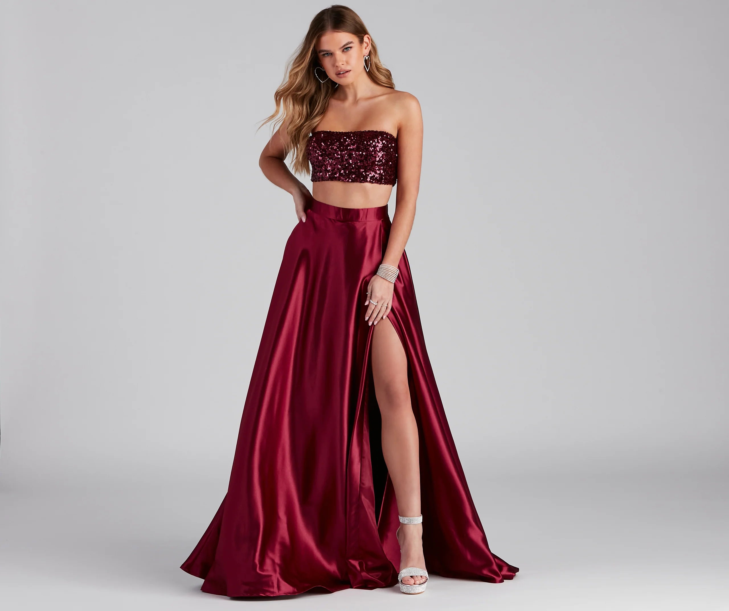 Make your grand entrance at prom in the Celia Formal Sequin Two-Piece A-Line dress sure to leave the room wonderstruck! She's designed in a two-piece silhouette with a strapless, tube sequin embroidered top with a built-in padded bust. Bring the drama to the night in her A-line satin skirt featuring a floor-sweeping silhouette with a slit accent that's perfect styling with glitzy heels to add extra shine to your prom night ensemble!