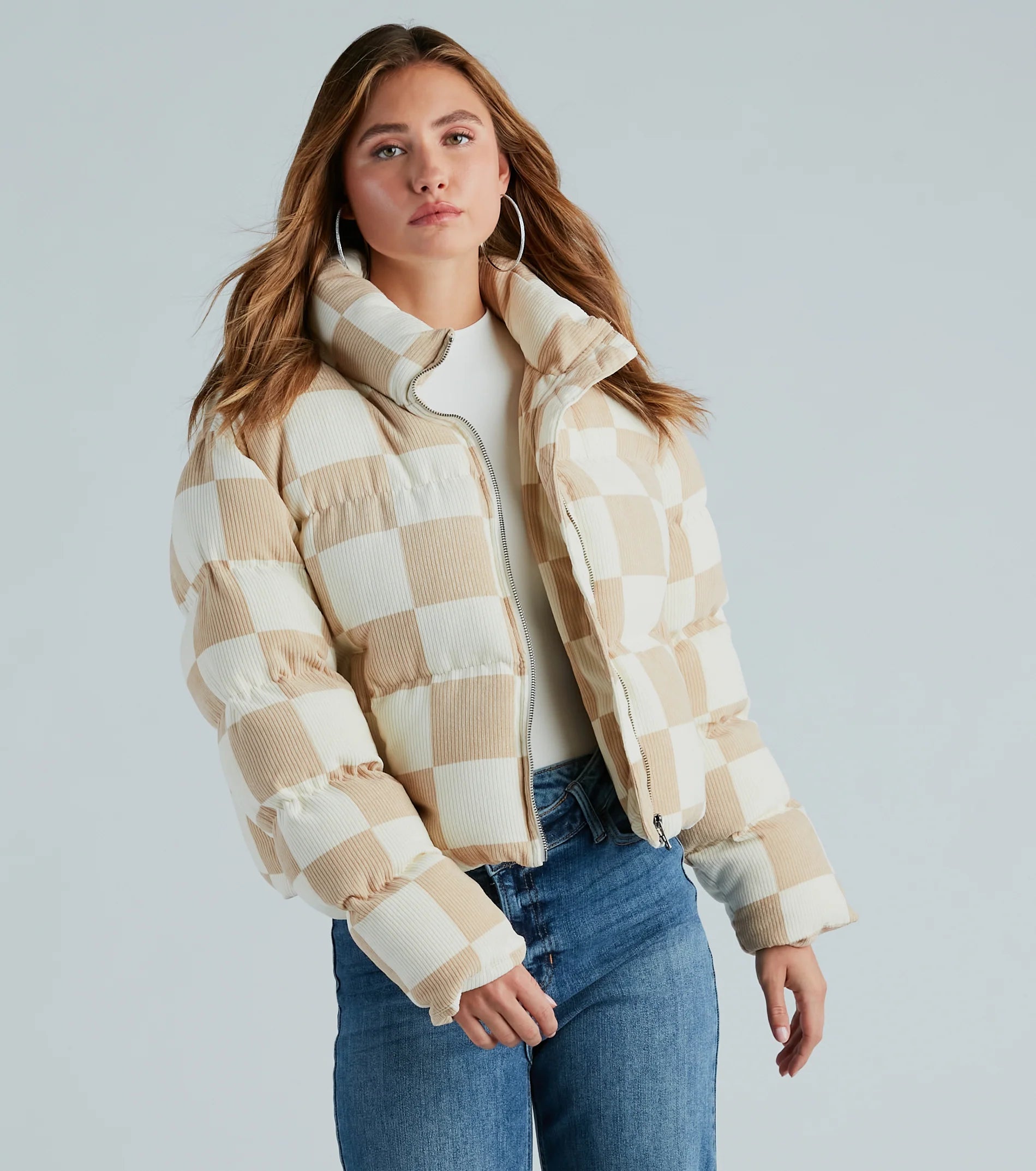 This puffer jacket will keep your style in check! With a unique checkered pattern and soft corduroy fabric, this jacket features a trendy and cozy feel with long sleeves, a standing collar neckline, front pockets to keep your hands warm, and a cropped hem. The jacket is composed of an insulated nylon-woven lining designed to help keep you warm. Complete the look with a knit beanie for a snow day or grabbing coffee!