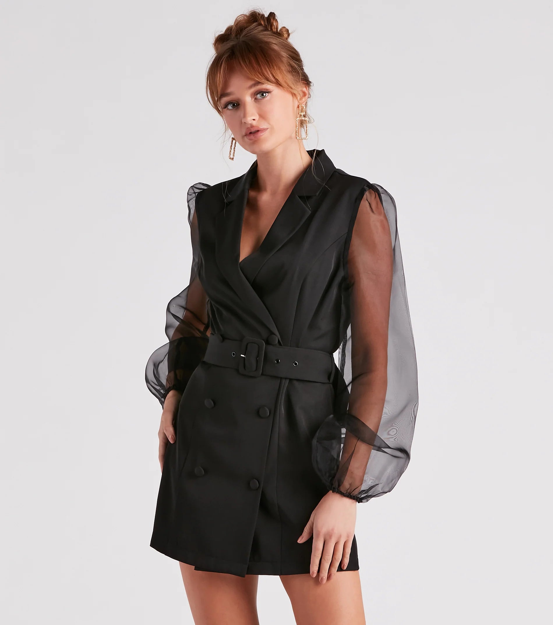 Chic and fab, this structured blazer dress is a must-have for winter parties! It features a lapel collar with a V-neckline, long sheer organza puff sleeves, double-breasted button closures, a bold belt to cinch your waist, and a short, fitted silhouette. Style alone as a dress or with faux leather leggings.