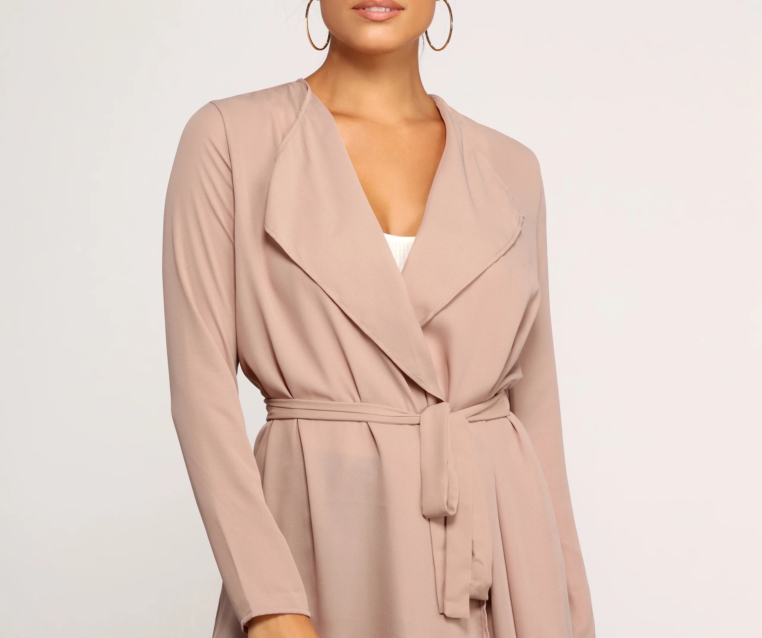 Turn heads with this chic and sophisticated trench! It features a drape front with a flat lapel collar, long sleeves, an elastic banded back with a tie front, and a relaxed, flowy fit. The trench is composed of a sheer woven fabric with no stretch.
