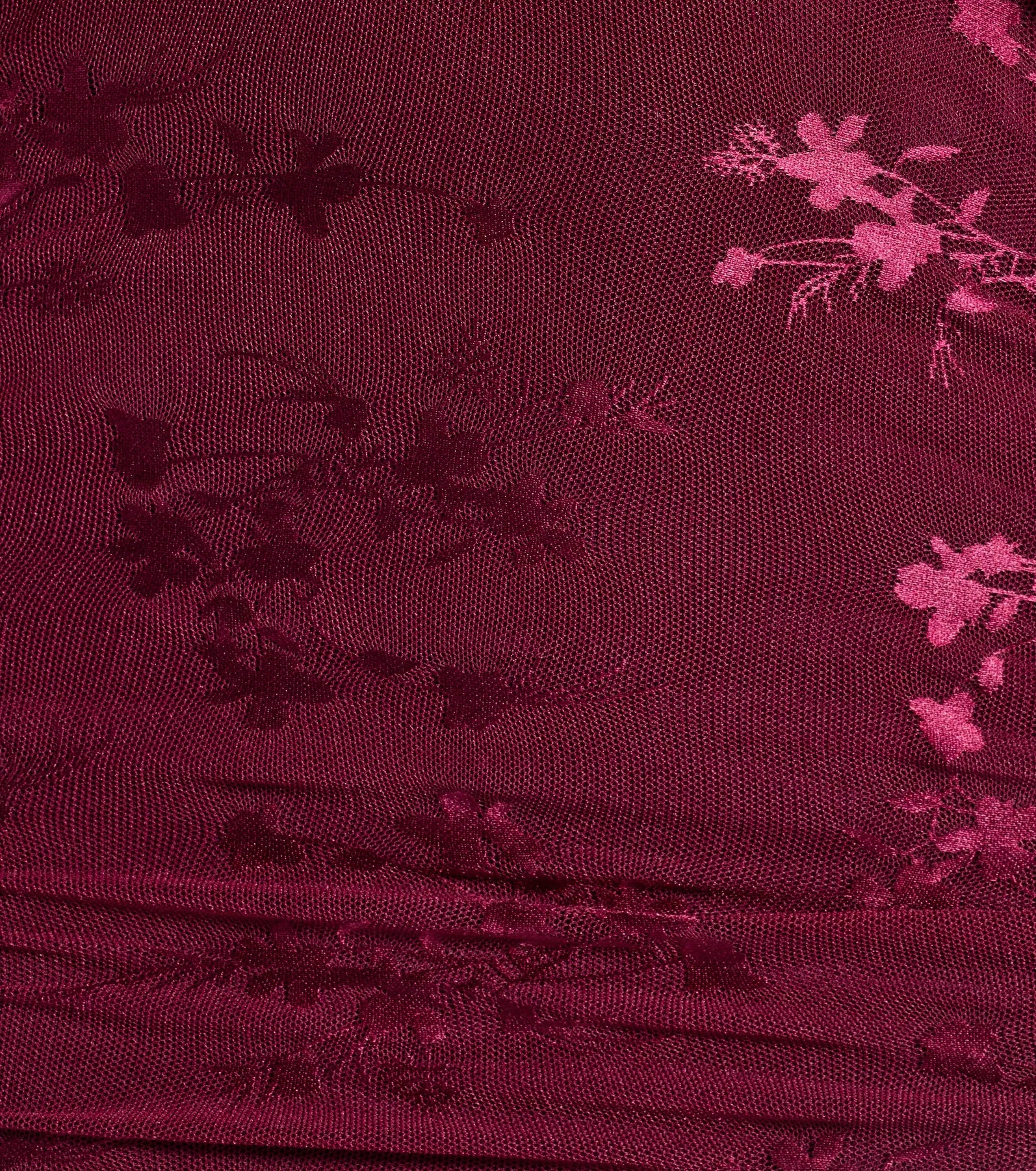 Catch all the glances in this alluring corset mini dress designed with a sheer knit fabric with a partial lining and a foiled floral pattern for a chic feminine look. The short dress features an off-the-shoulder neckline with short sleeve cuffs, a sheer corset-style bodice with contrast piping and flexible boning, and ruched side and back seams to accentuate your stunning curves along the bodycon silhouette.