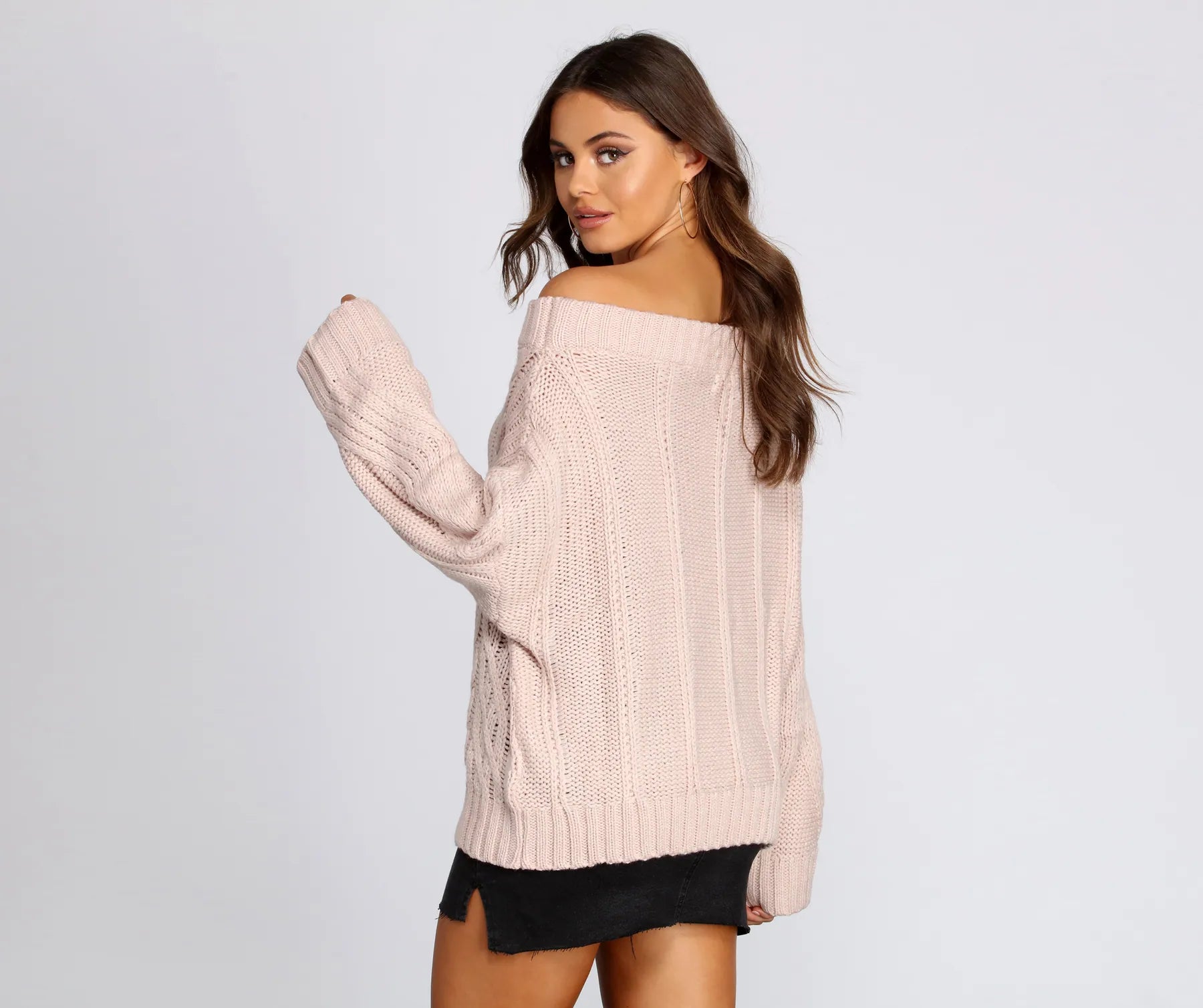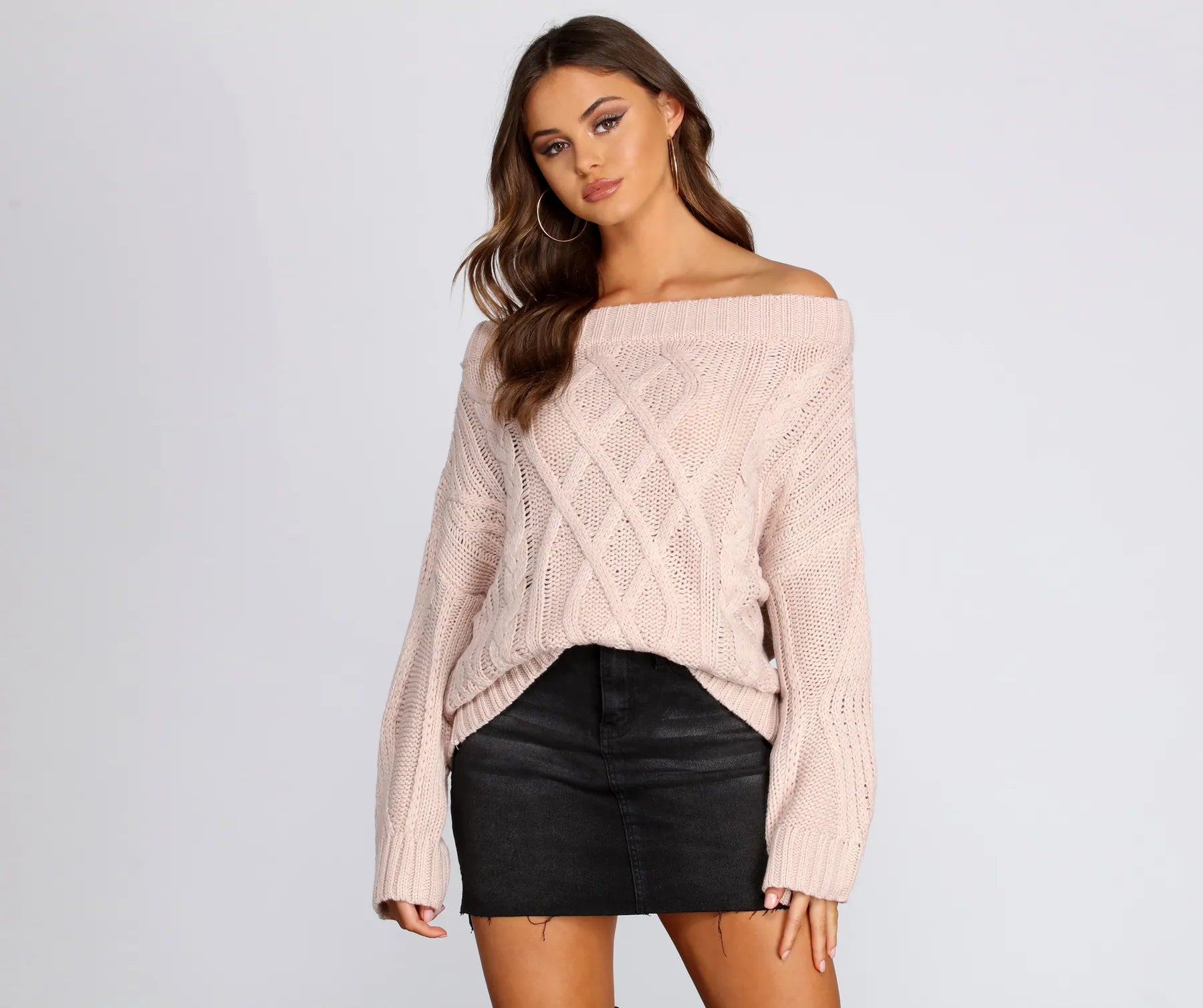 Cozy and chic, this cable knit sweater is a must have for colder days. It feautres an off the shoulder square neckline, long dolman styles sleeves, and a mid-length hem with a relaxed fit. Dress is composed of a thick cable knit fabric with moderate stretch.