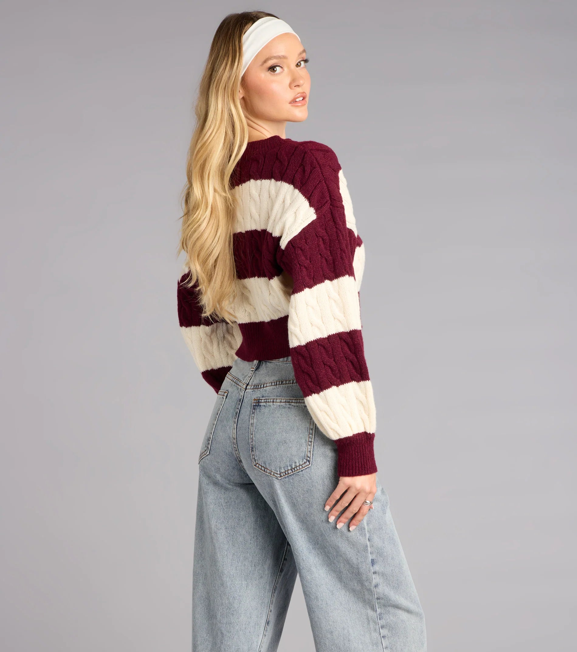 Classic stripes meet cute cable knit in this cropped sweater. Wear it with jeans for a relaxed vibe or dress it up with a midi skirt for a cute look.