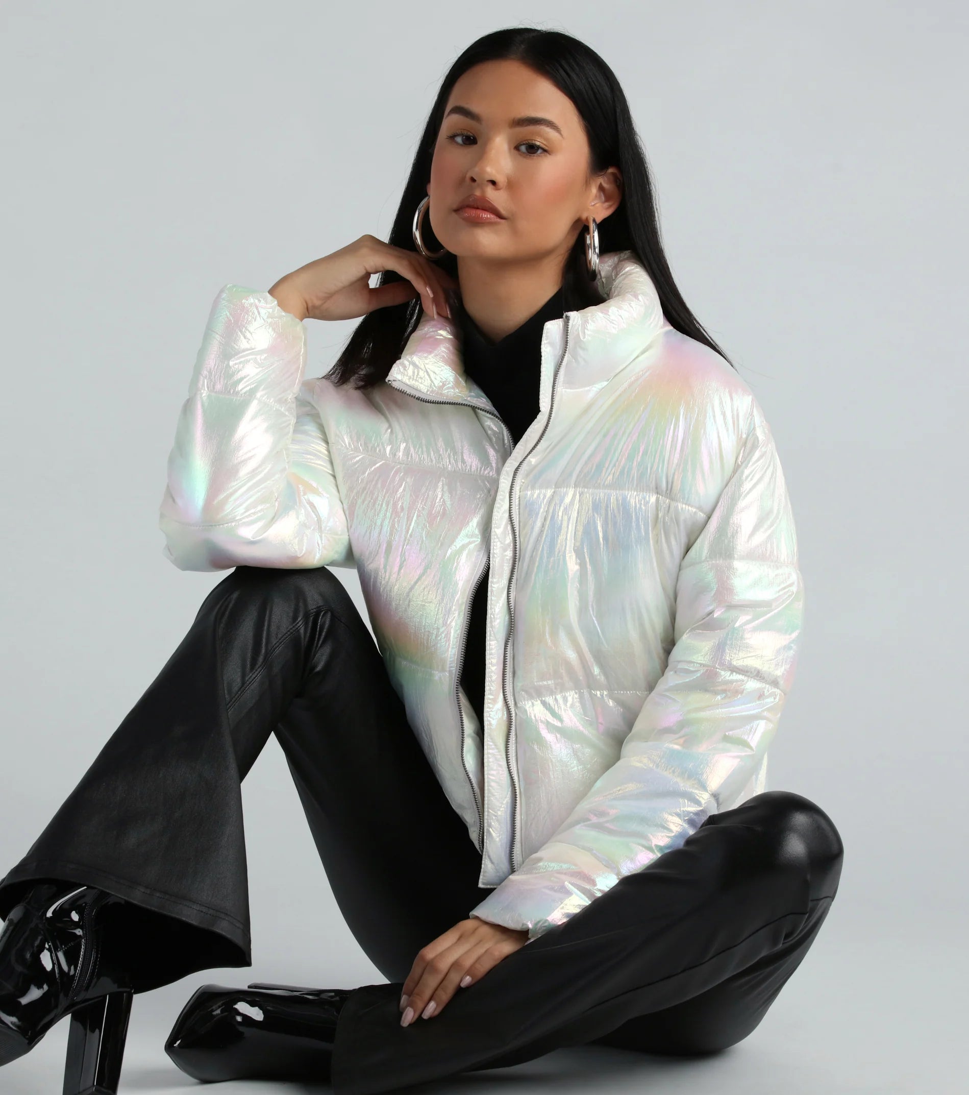 Your future is looking chromatic! Create a total babe vibe with this iridescent puffer cropped jacket featuring long sleeves, a standing collar, a front zipper, side pockets, and a back drawcord to customize the fit. The jacket is composed of an iridescent chrome insulated nylon-woven fabric designed to help keep you warm and protected from the elements! Complete the look in sleek booties.