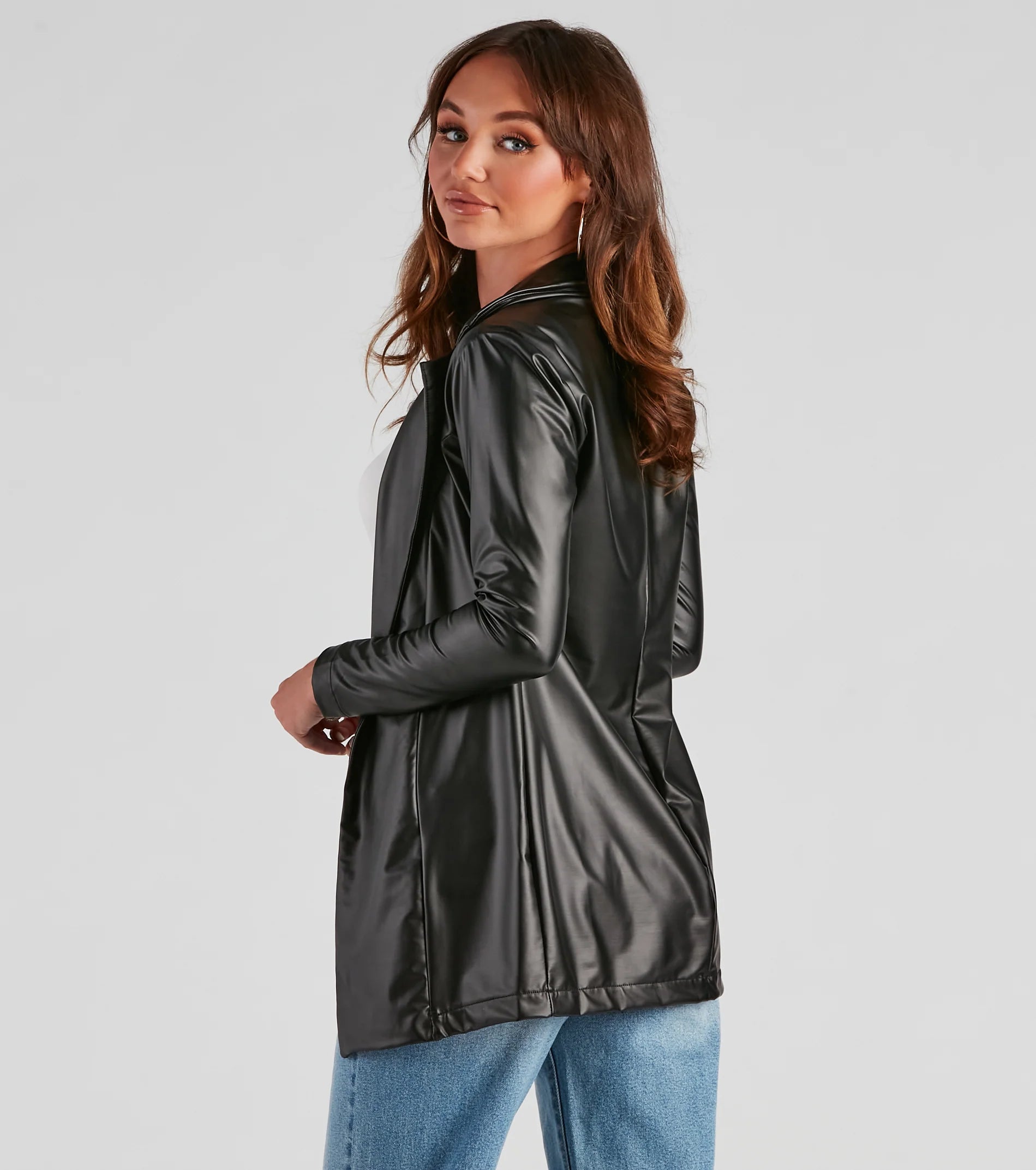 Get a chic and sophisticated look in this trendy faux leather blazer! It features a flat lapel collar, a center hook and eye front closure, long fitted sleeves, and a near mid-thigh length. Blazer is composed of a faux leather fabric with a moderate stretch. Layer this blazer over a pair of mom jeans for a casual-chic vibe.