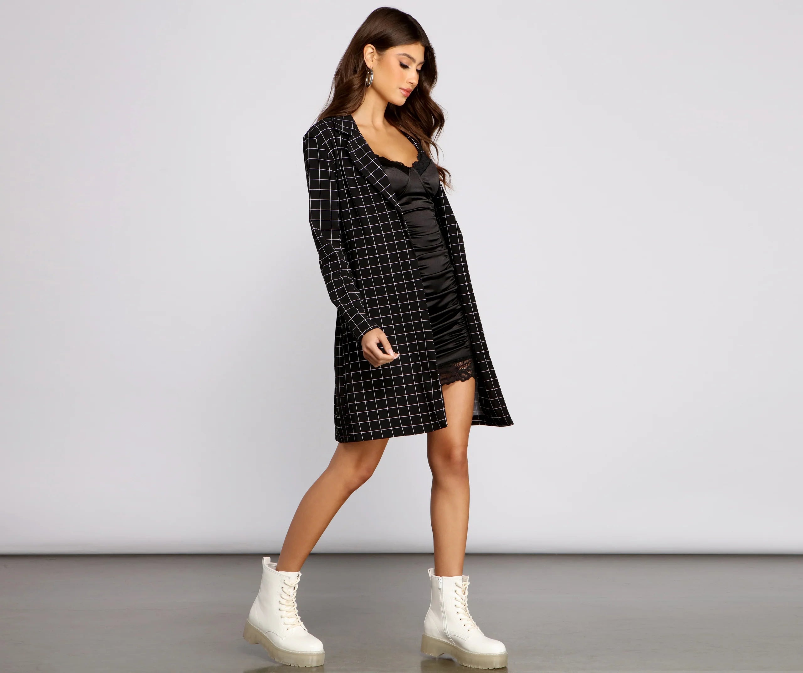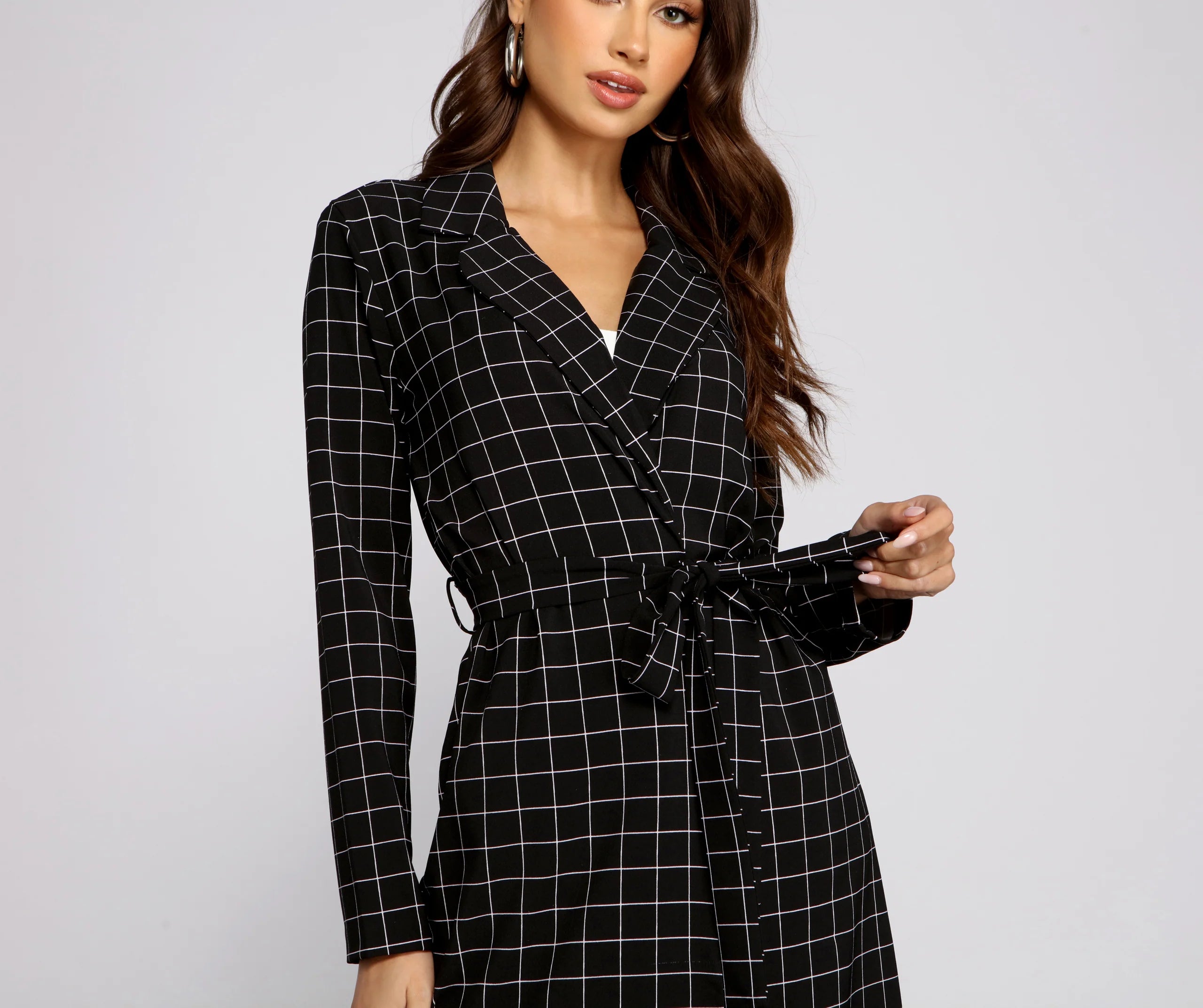 Strike a classic impression with a trench coat that is perfect for nailing those sophisticated vibes. The trench coat features a windowpane design, a collared neckline, long sleeves, a belted waist, and a mid-thigh length. Complete look with a satin midi dress and mules.