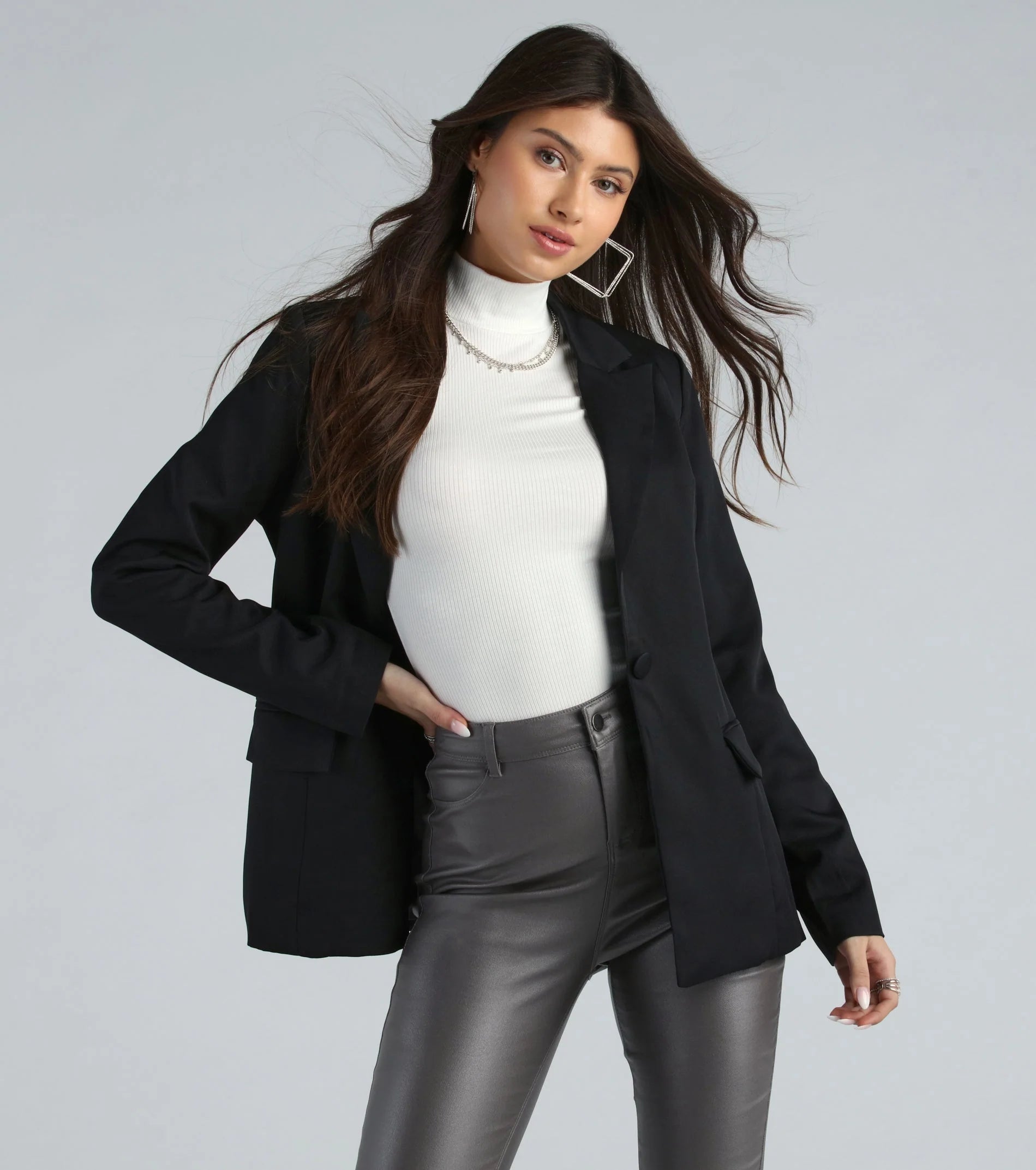 Layer on this woven blazer for a classy night style or for daytime meetings! It features long sleeves, a lapel collar neckline, a single front button closure, faux front pockets, and a relaxed slim silhouette. Complete the look in sleek stiletto heels.