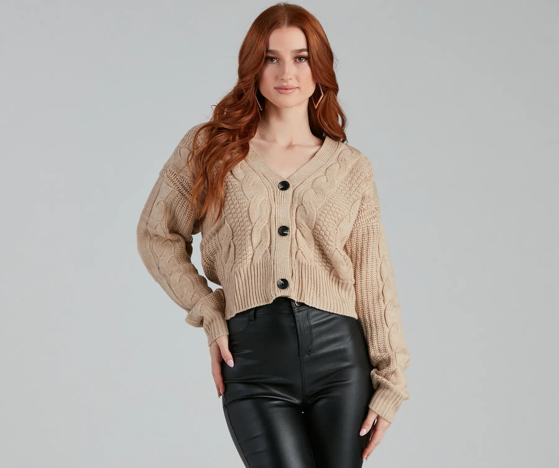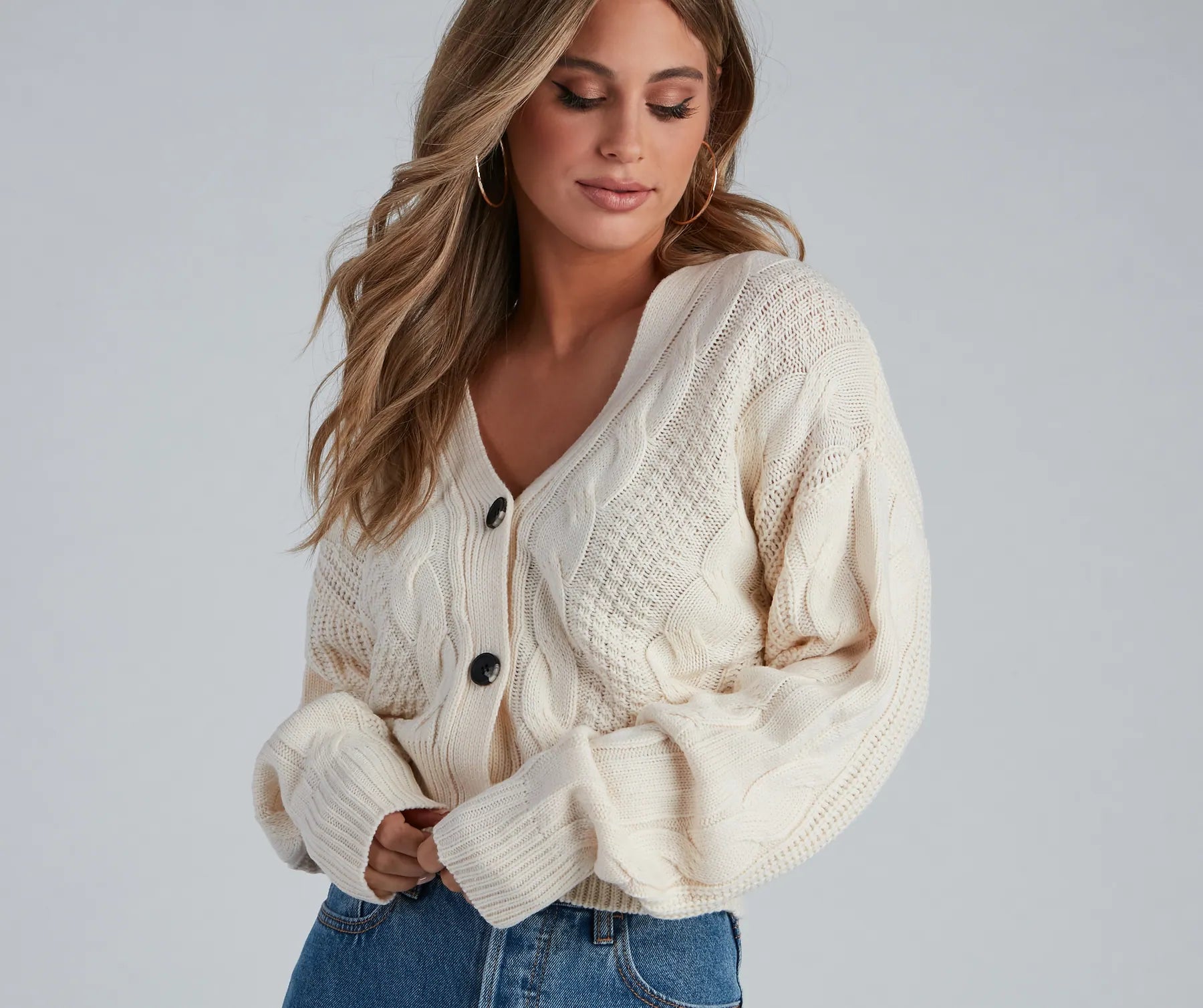 The perfect cable knit cardigan to look cute on chilly days. It features dolman long sleeves, a v-neckline with button closures, and a relaxed silhouette. Style with ankle booties.