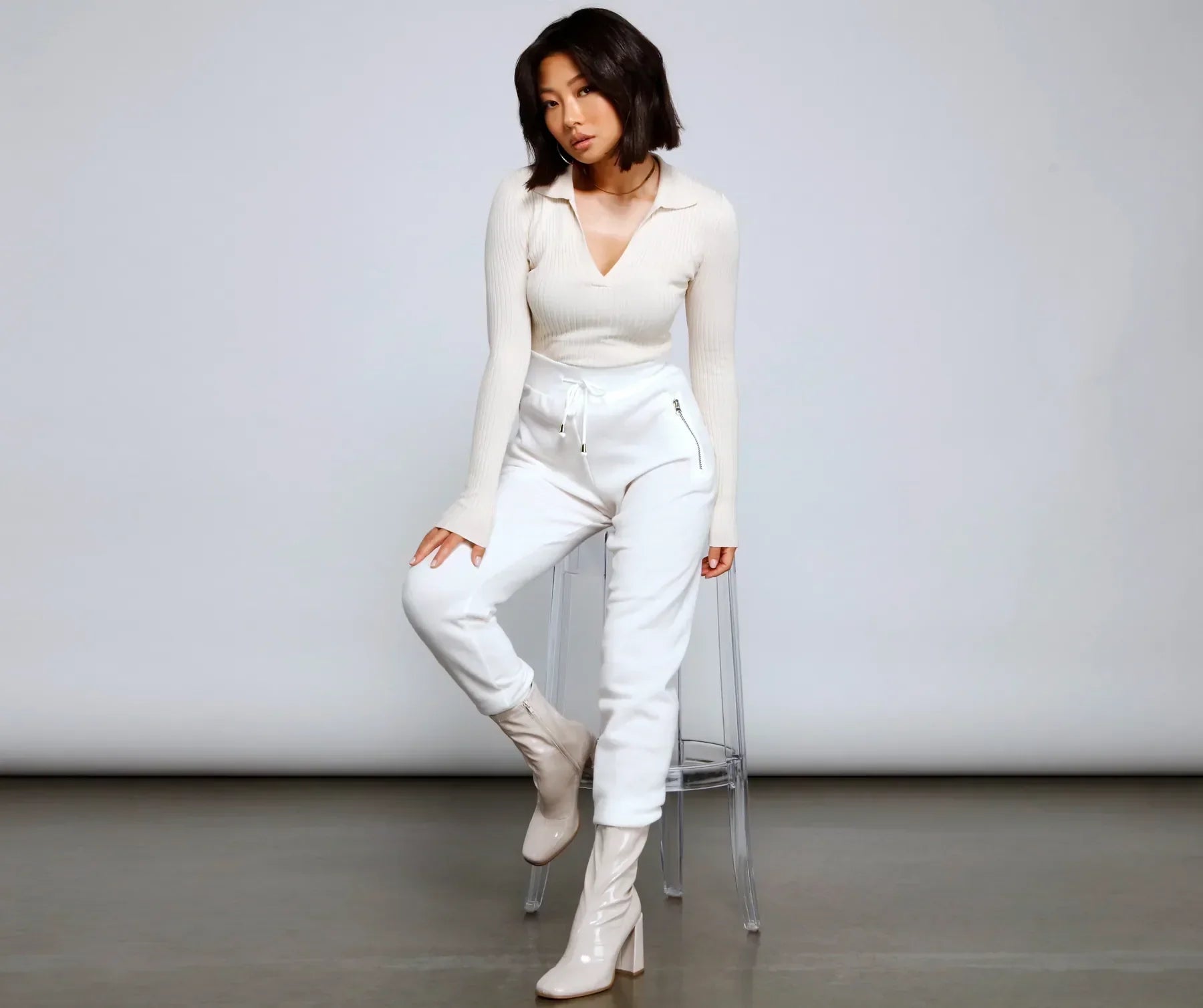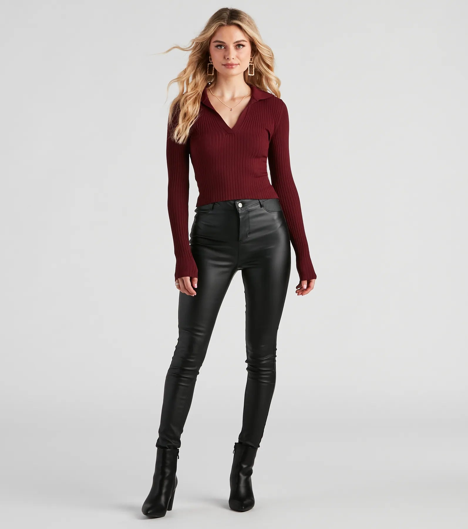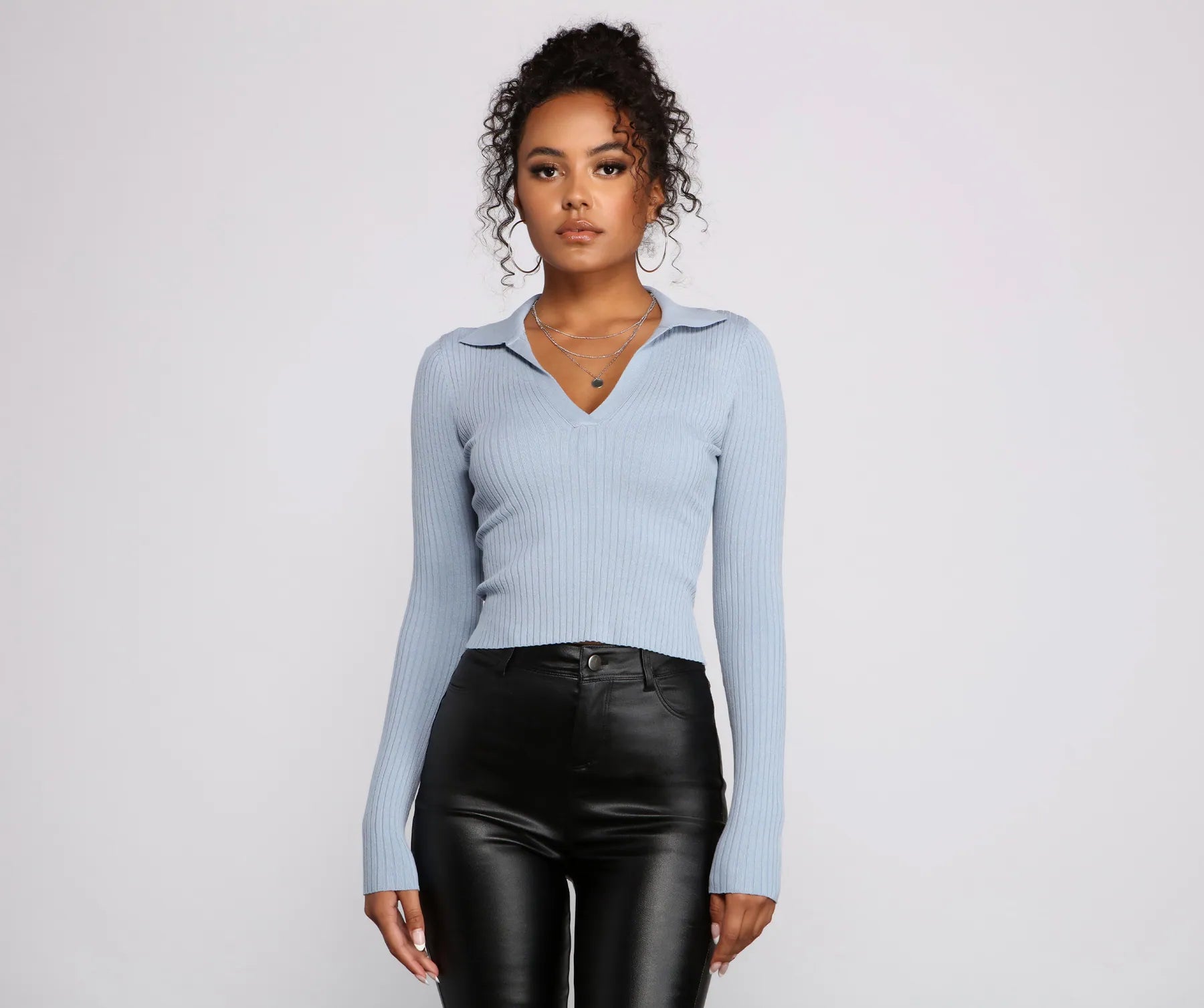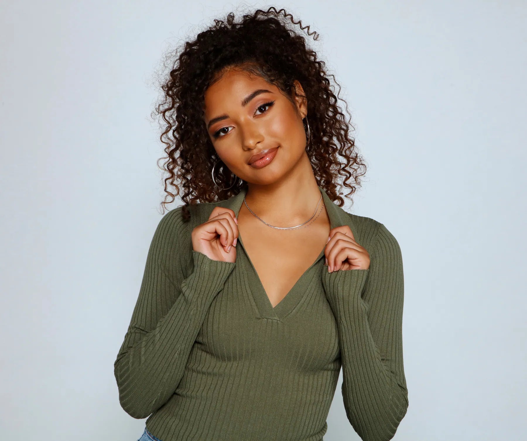 Keep it chic in a collared top that is perf for keeping it effortlessly stylish. The top features a collared neckline, long fitted sleeves, and is composed of a ribbed knit fabric that offers a relaxed fit with a moderate stretch. Complete look with tie waist pants.
