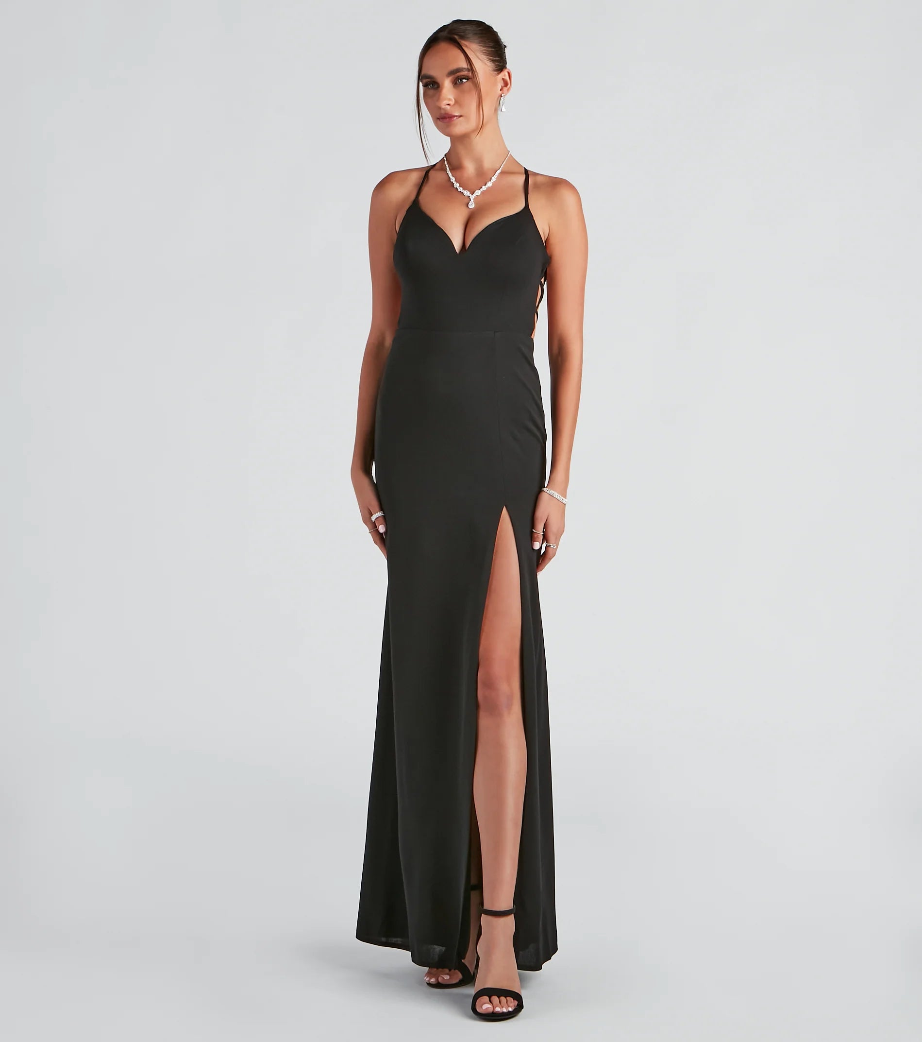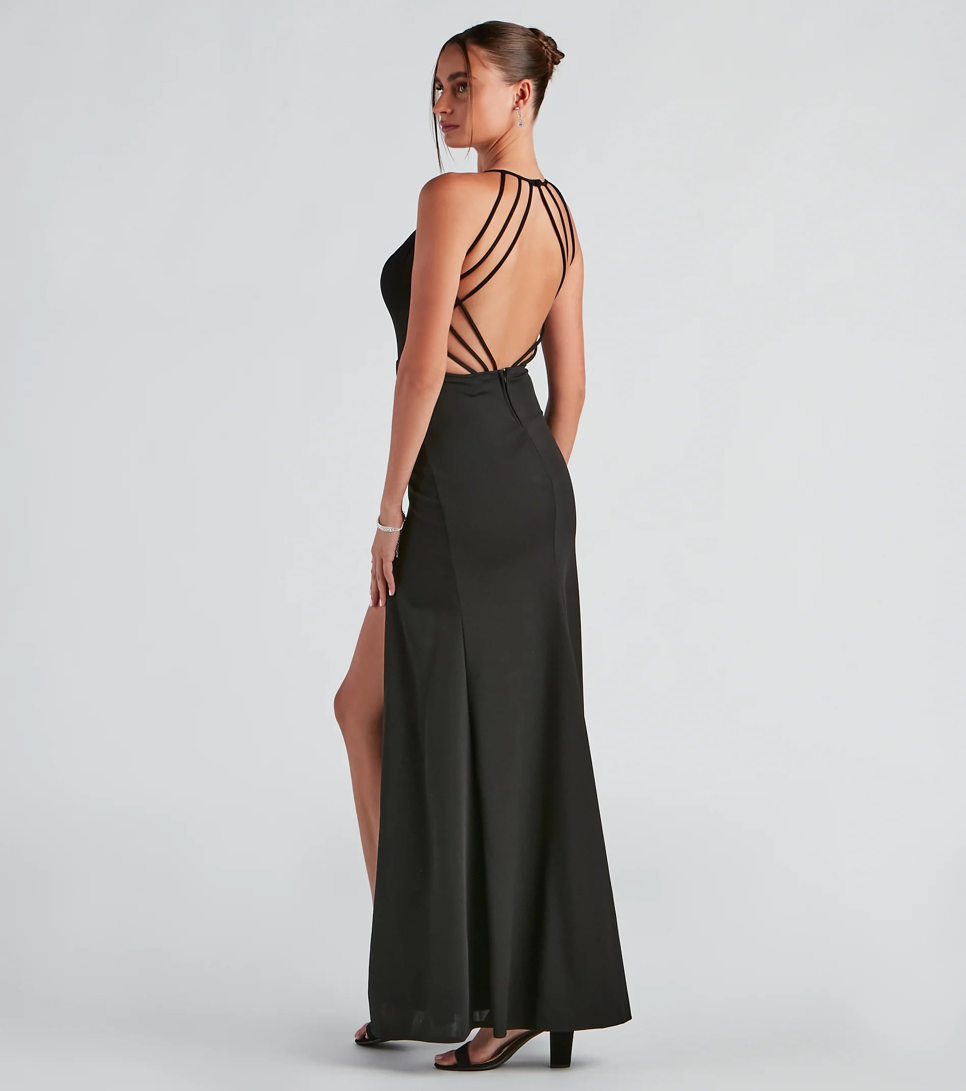 Show some skin. Cornelia is all class with sultry appeal in her sleeveless, plunging V-neckline, built-in padded bust, princess seams along the bodice, and open-back allure with caged-strap detail. Her figure-flattering, A-line silhouette leads to a floor-length hem with a sexy front slit perfect for showing off a pair of glam heels to complete your dressy look.