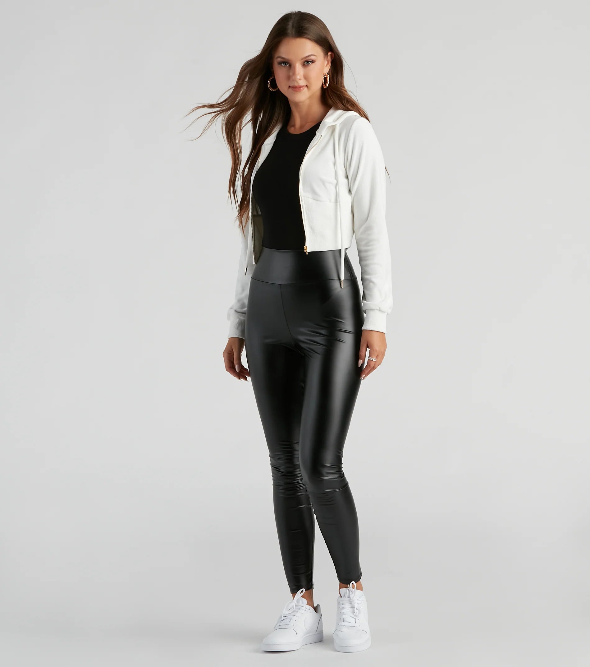 This adorable velour hoodie is the cozy basic you need in your life! It features a drawstring hood, a complete zip-front, long sleeves, a cute ribbed knit design at the waist, and a cropped, form-hugging fit. The hoodie is composed of a soft velour fabric that offers a moderate stretch. Style this hoodie with denim and sneakers.