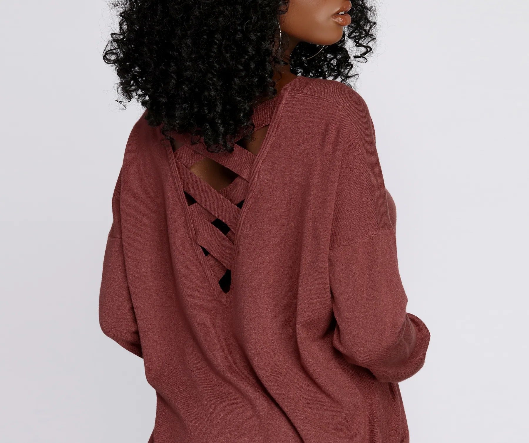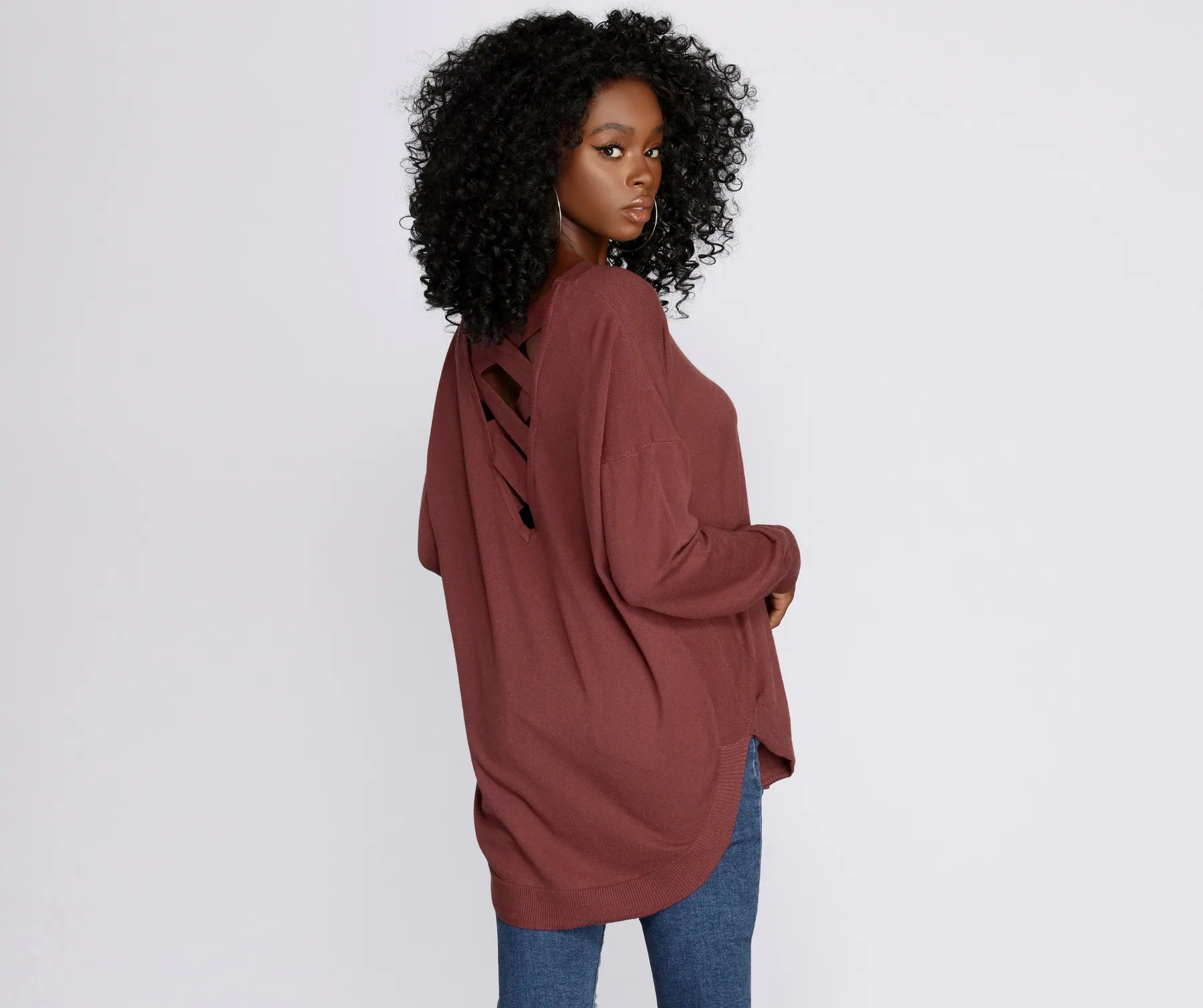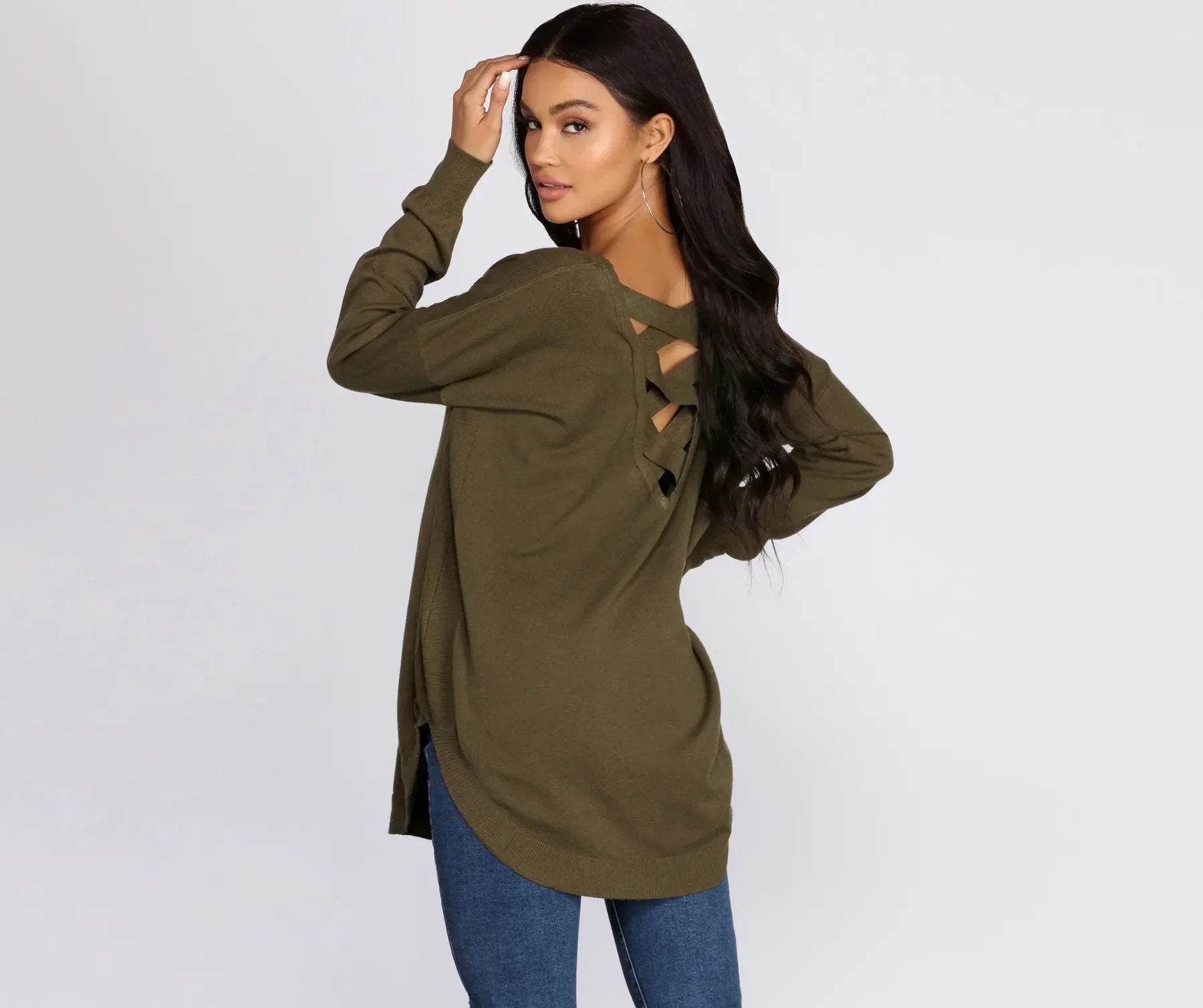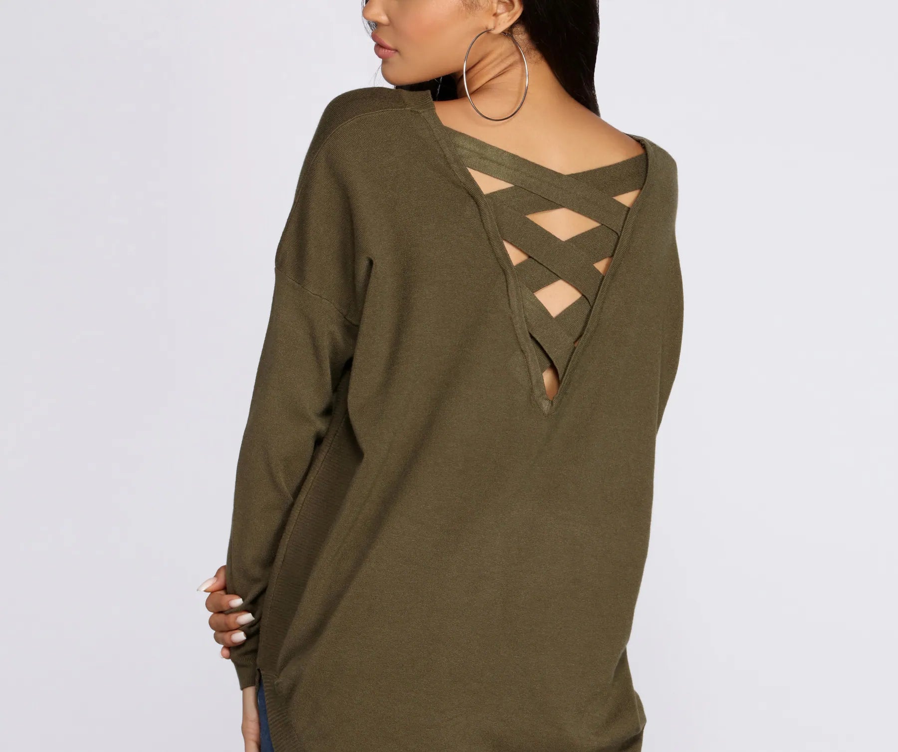 Fall back on this cute basic to layer with your fall staples this season! It features a ribbed crew neck, long sleeves, lattice straps to accent the back and a rounded hem. Tunic is composed of a soft to the touch sweater knit fabric that offers a relaxed fit with plenty of stretch.
