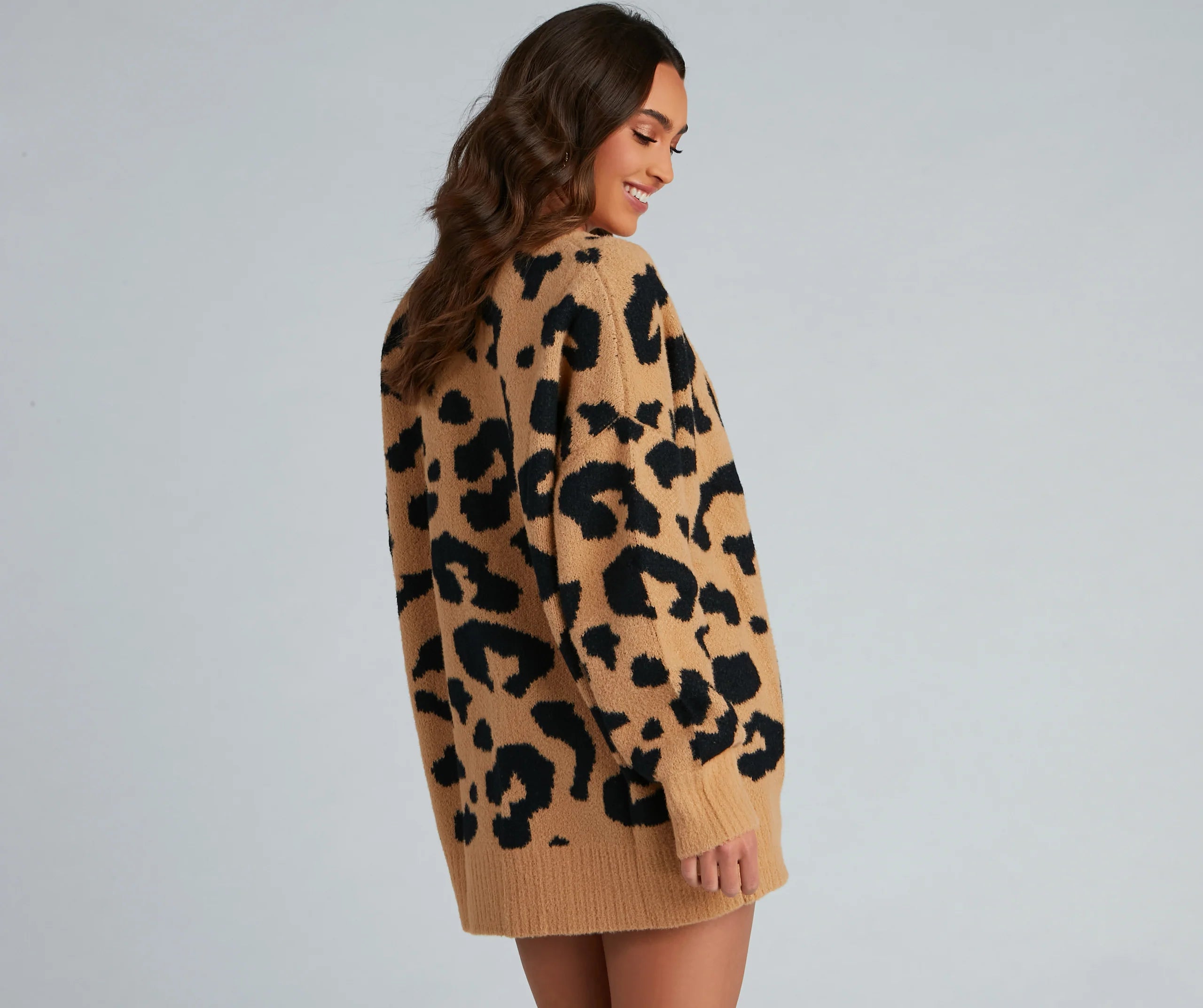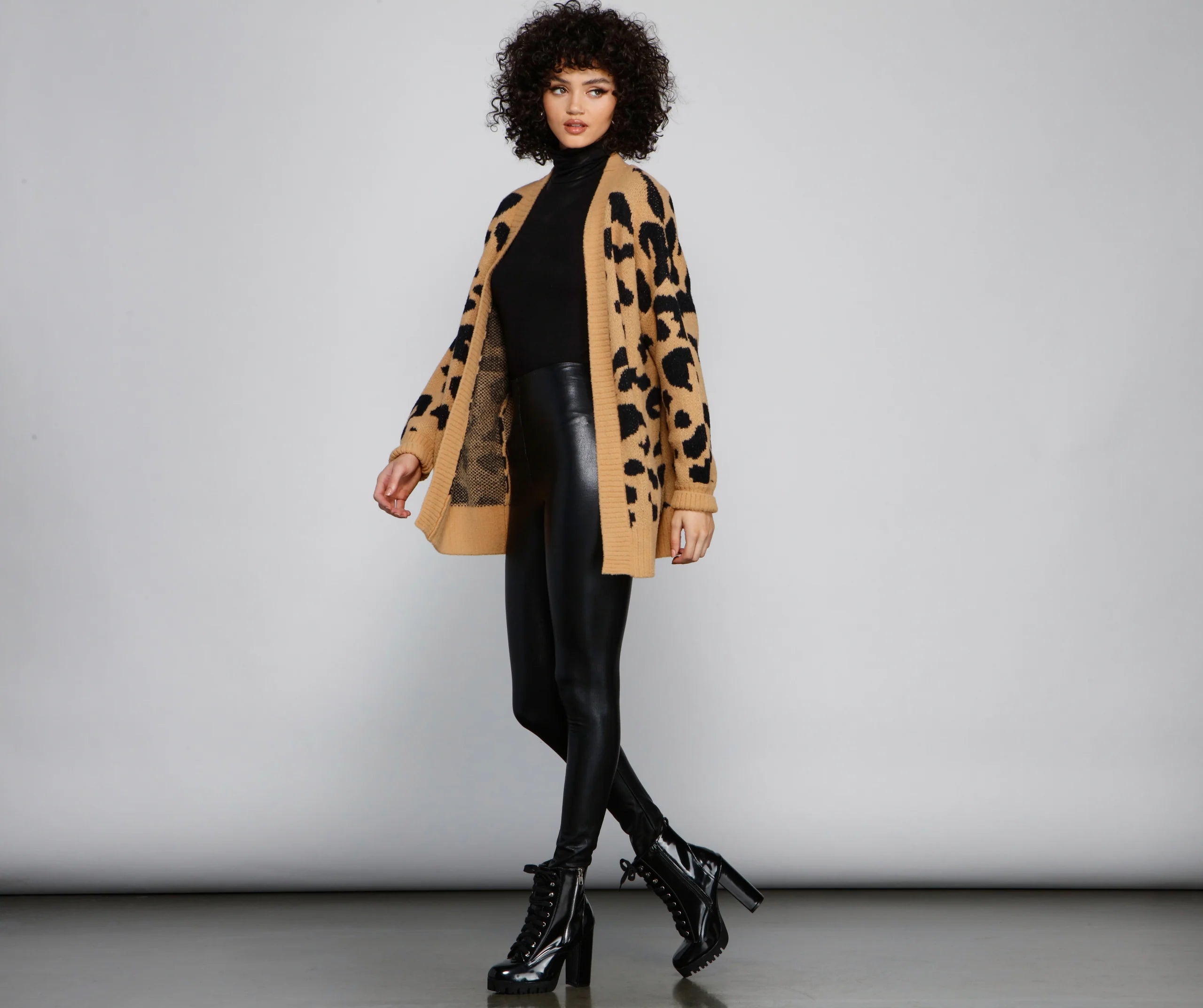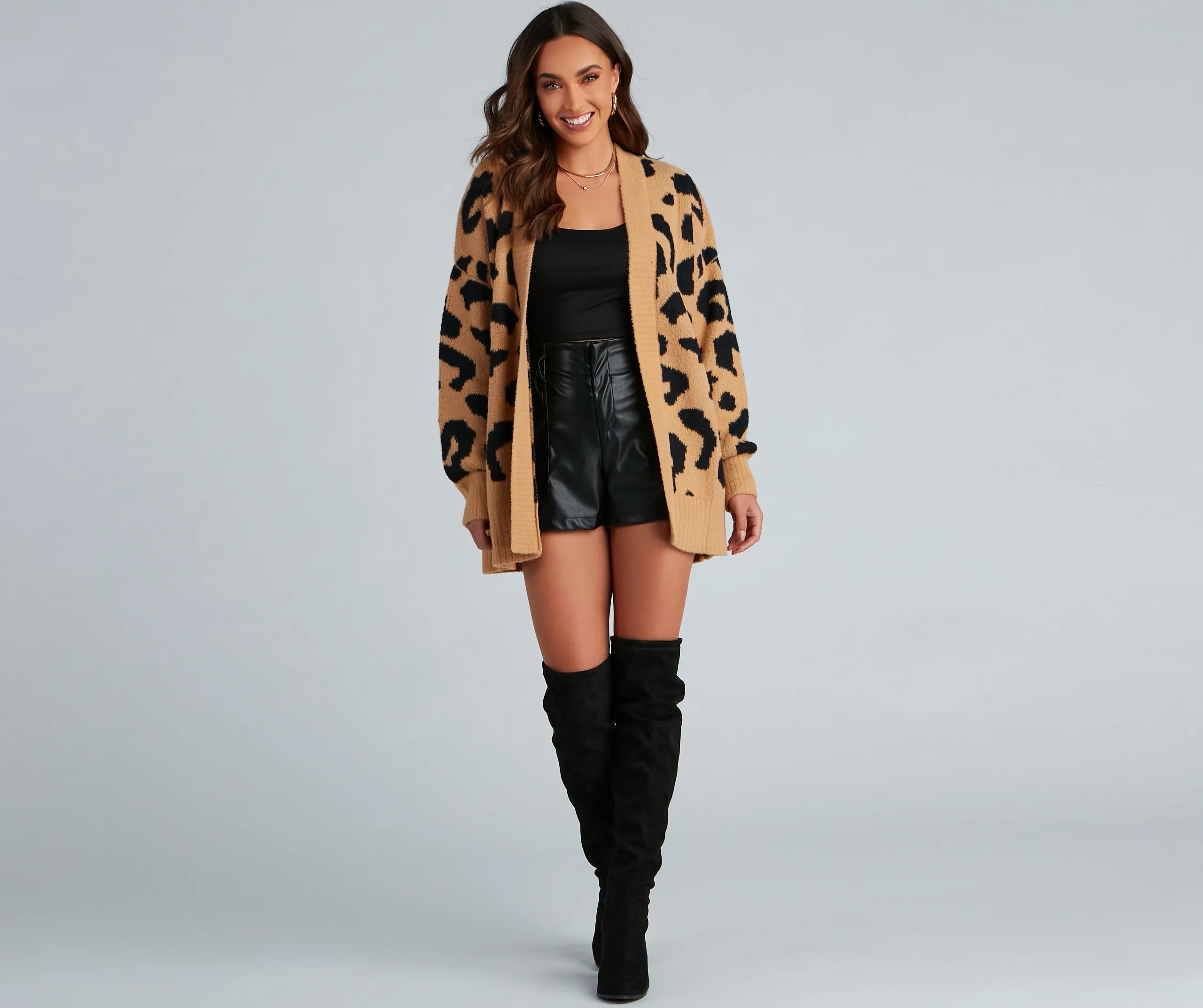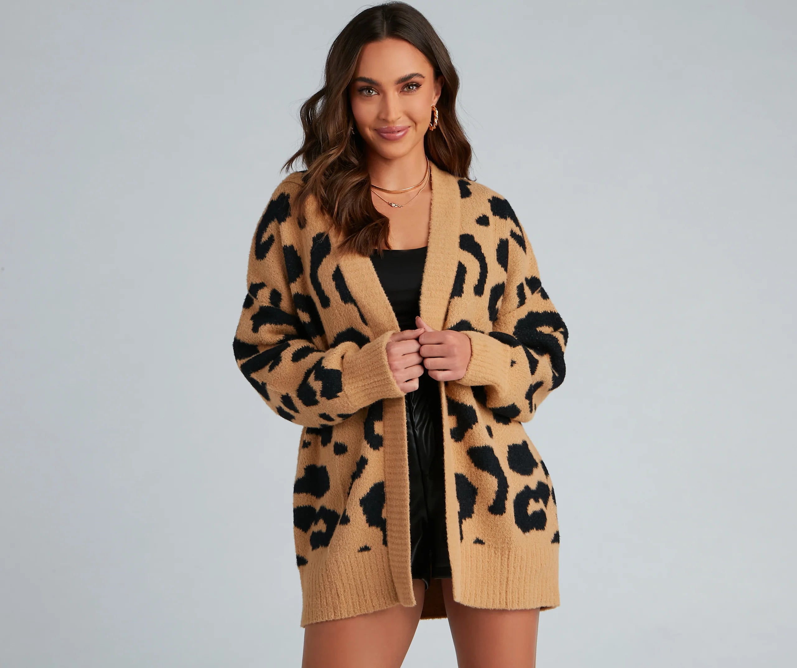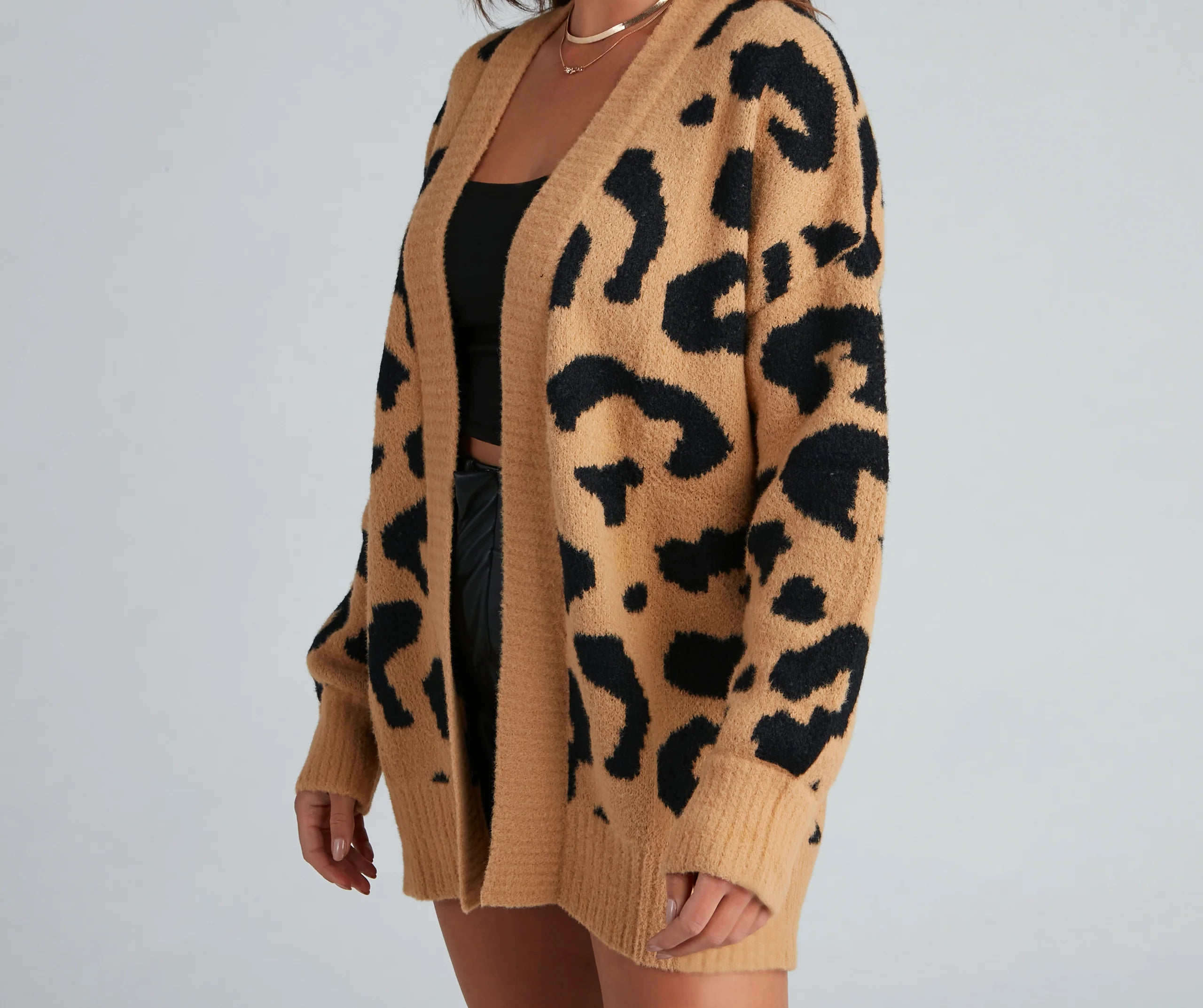 Layer on the cozy vibes with this trendy leopard print cardigan. It features long sleeves, an open front, ribbed hems, and a relaxed and comfortable fit. The fuzzy knit fabric offers a moderate stretch. Style this cardigan with a basic tee and dark wash denim.