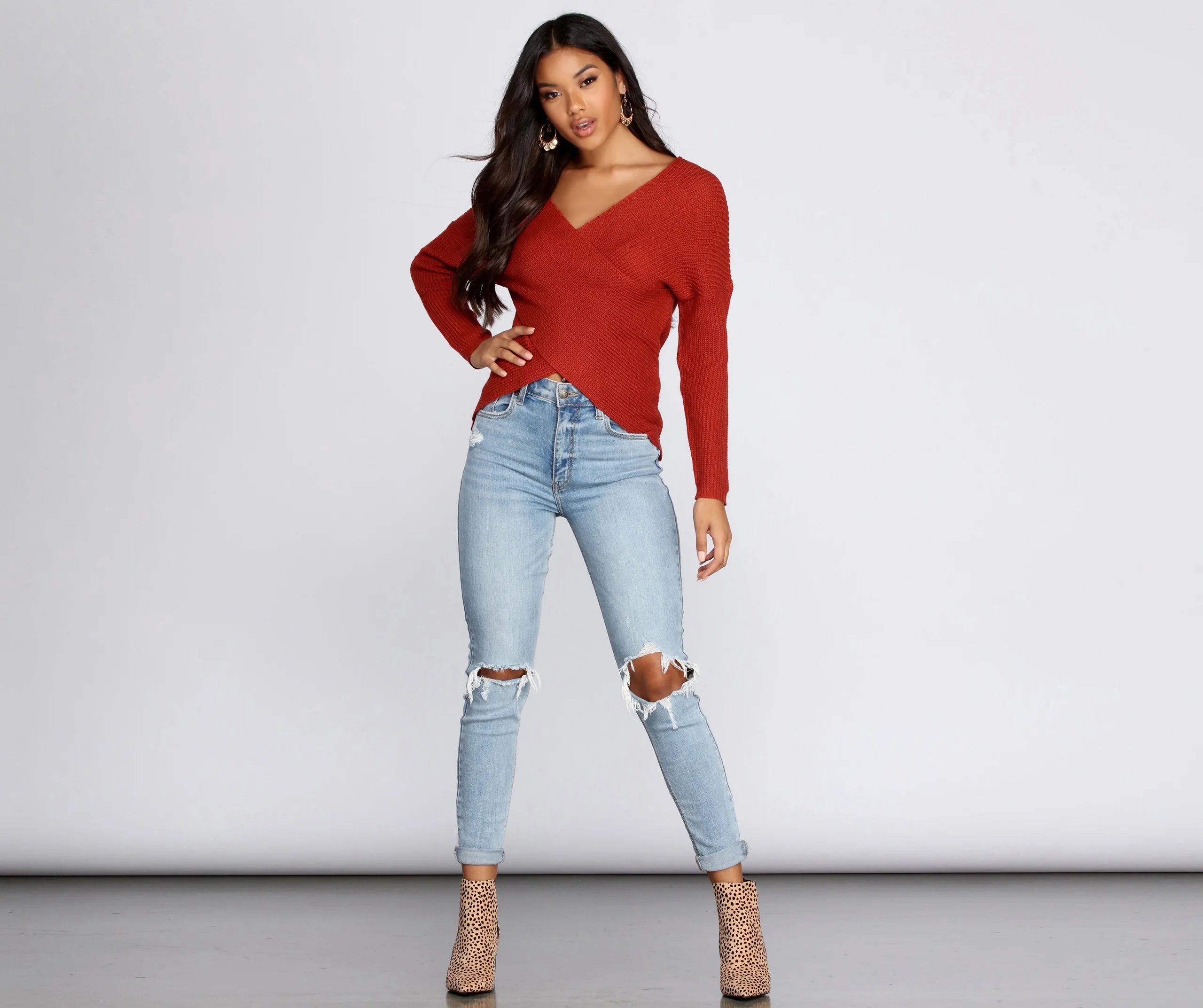 Cross 'em off your list in this classic crossover-style sweater. This piece features a V-shaped neckline, ribbed trim throughout, and has minimal stretch. Pair with jeans and heels for a sophisticated everyday look.