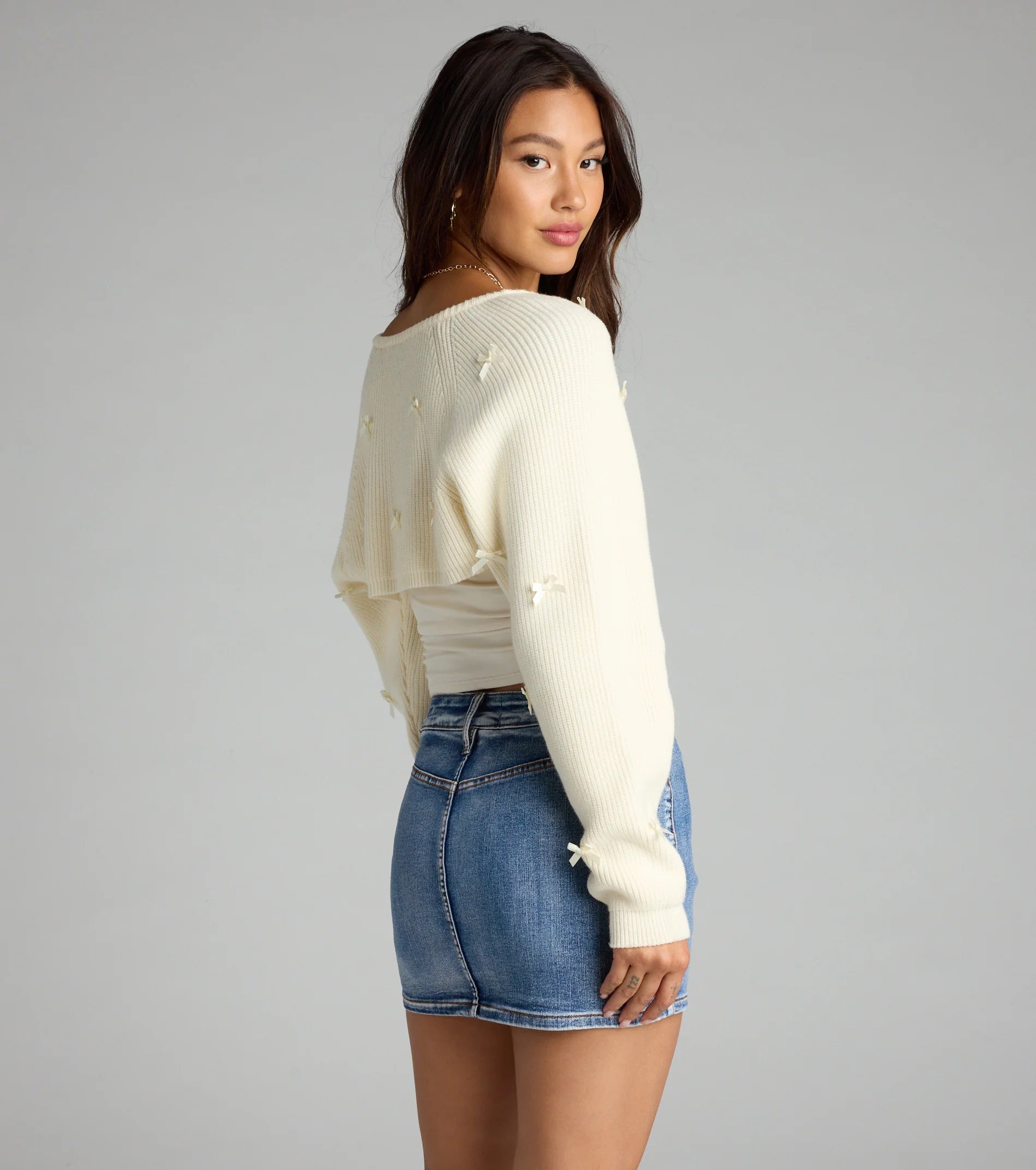 Perfect for those “is it chilly or am I just cute” moments. This bolero is designed with adorable bow trims, cozy long sleeves, and an ultra-cropped hem that flaunts your outfit!