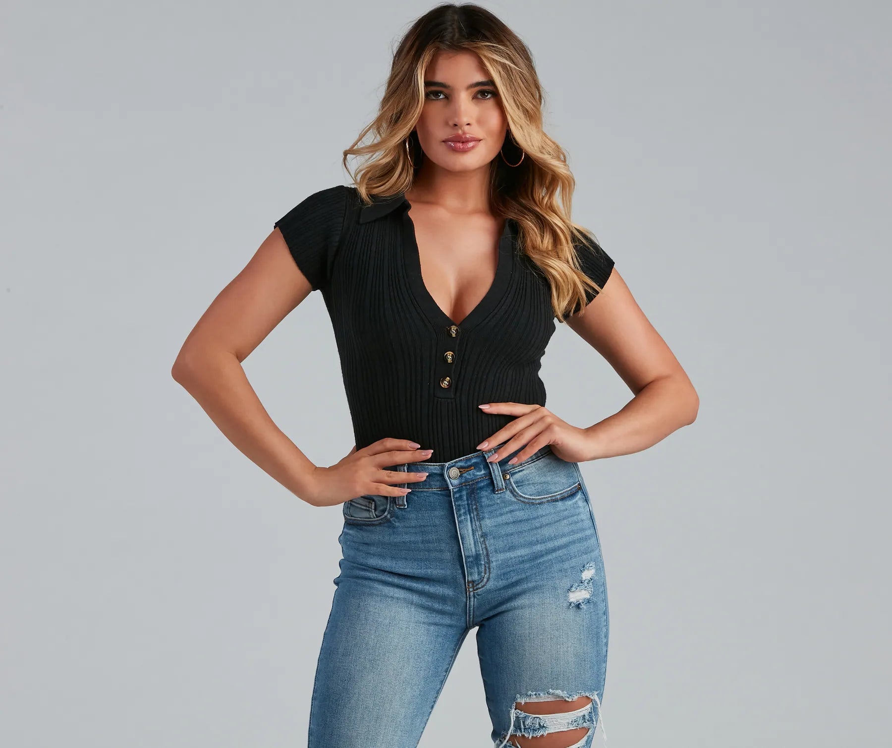 This cute and casual ribbed knit bodysuit is a must-have for trendy everyday 'fits! It features a johnny collar, a V-neckline with a partial button-down front, cap sleeves, a thong bottom, and a form-hugging fit. The ribbed sweater knit fabric offers plenty of stretch. Style with your fave pair of denim.