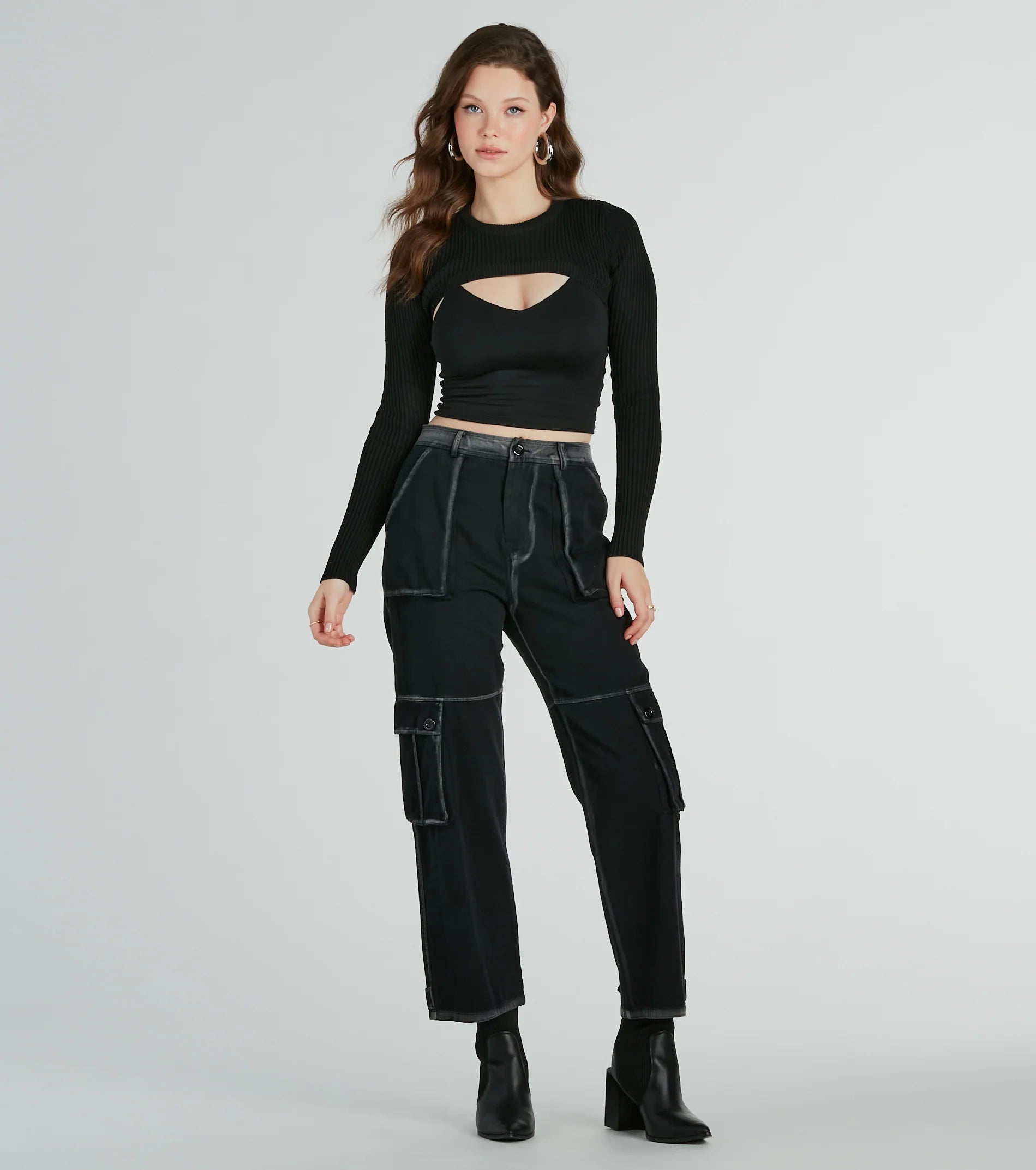 Prepare for cuteness overload with this rib knit sweater topper! It features fitted long sleeves, a crew neckline, and a fitted ultra-cropped hem. Layer over a basic tank top paired with your favorite pants!