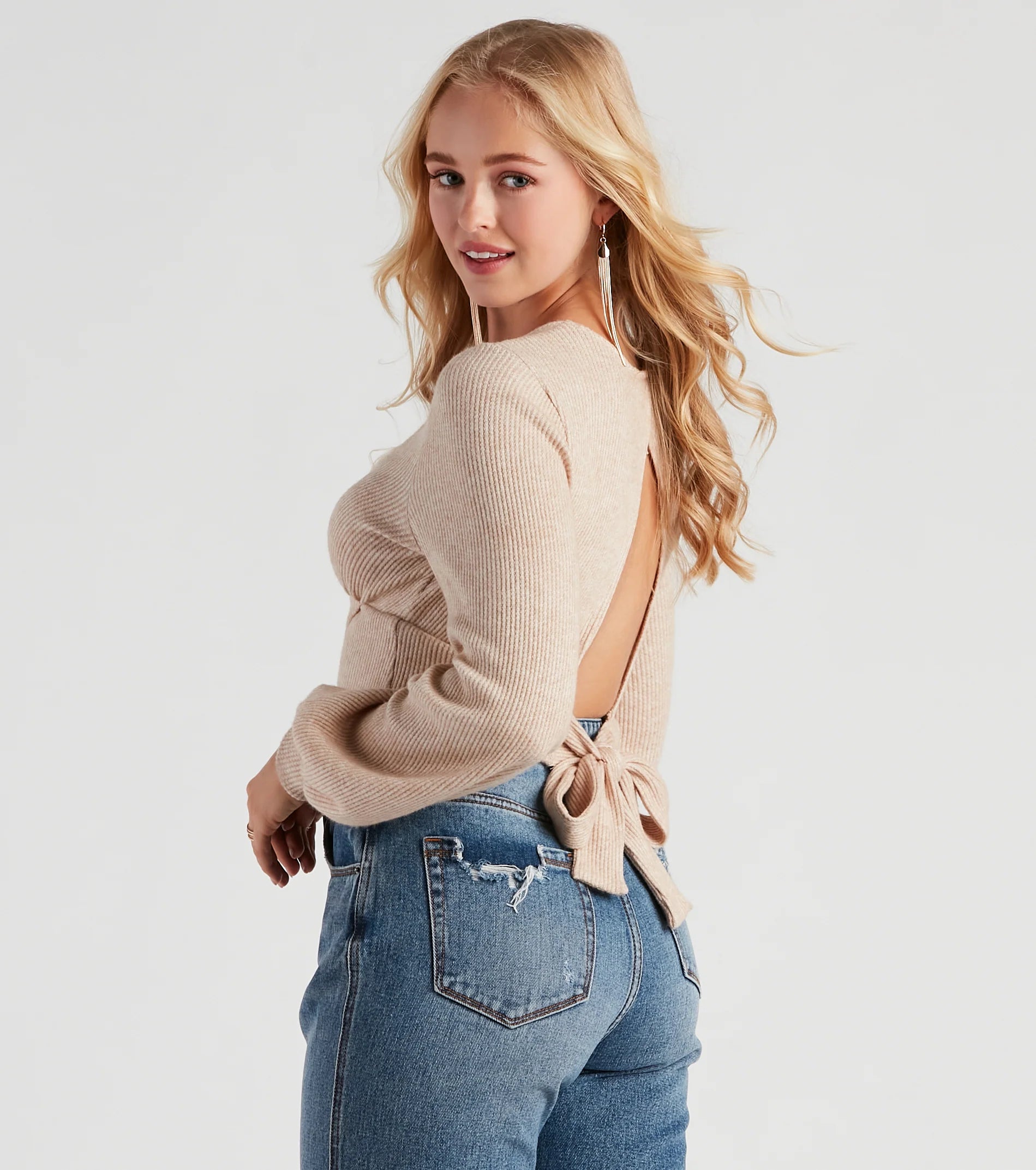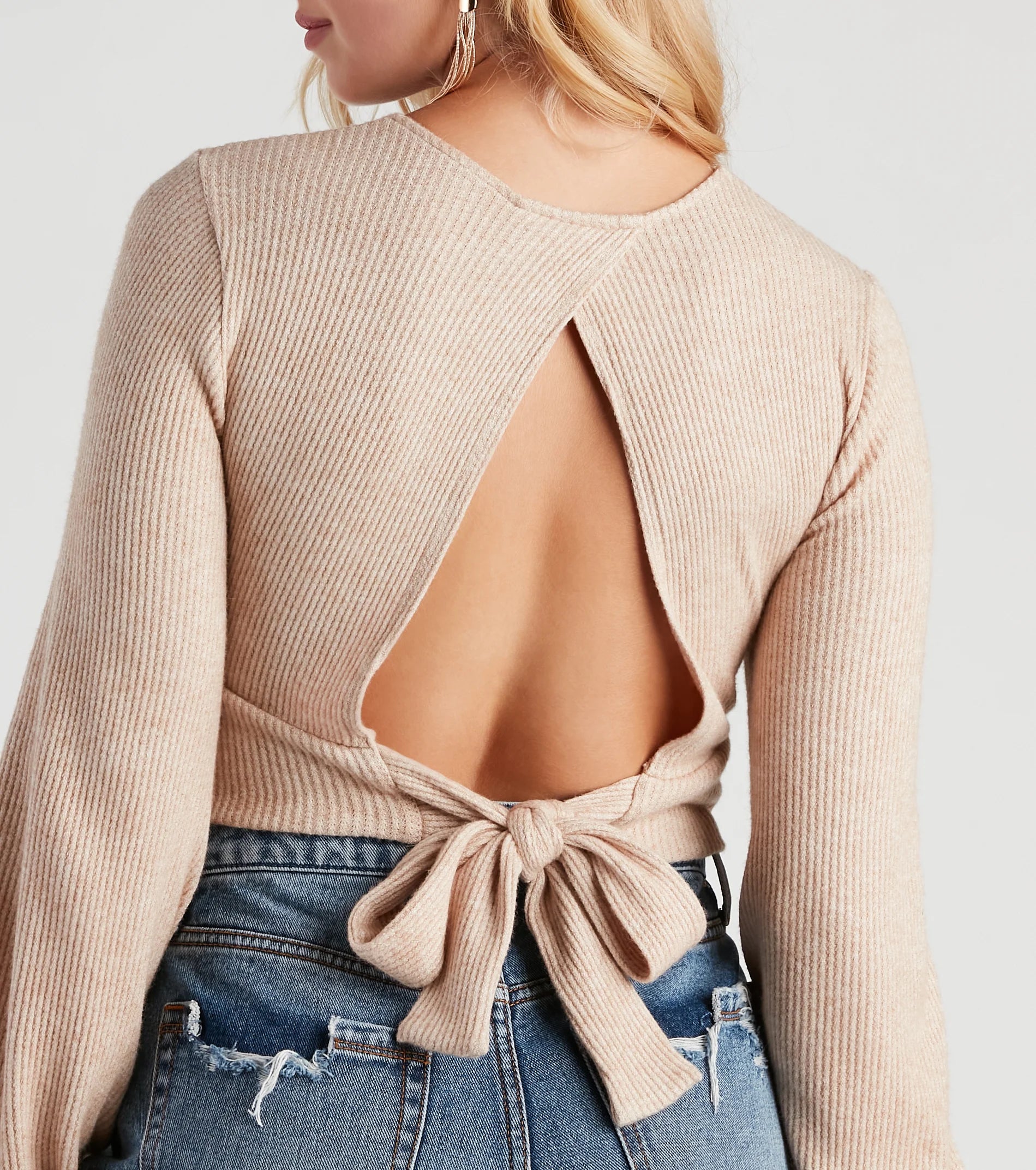 You'll look so darling in this crop top perfect for casual weekend plans or a coffee date! It features bishop long sleeves, a v-neck, and a tie-back closure and cutout on waffle knit fabric. Style with boyfriend jeans to complete your cute look!