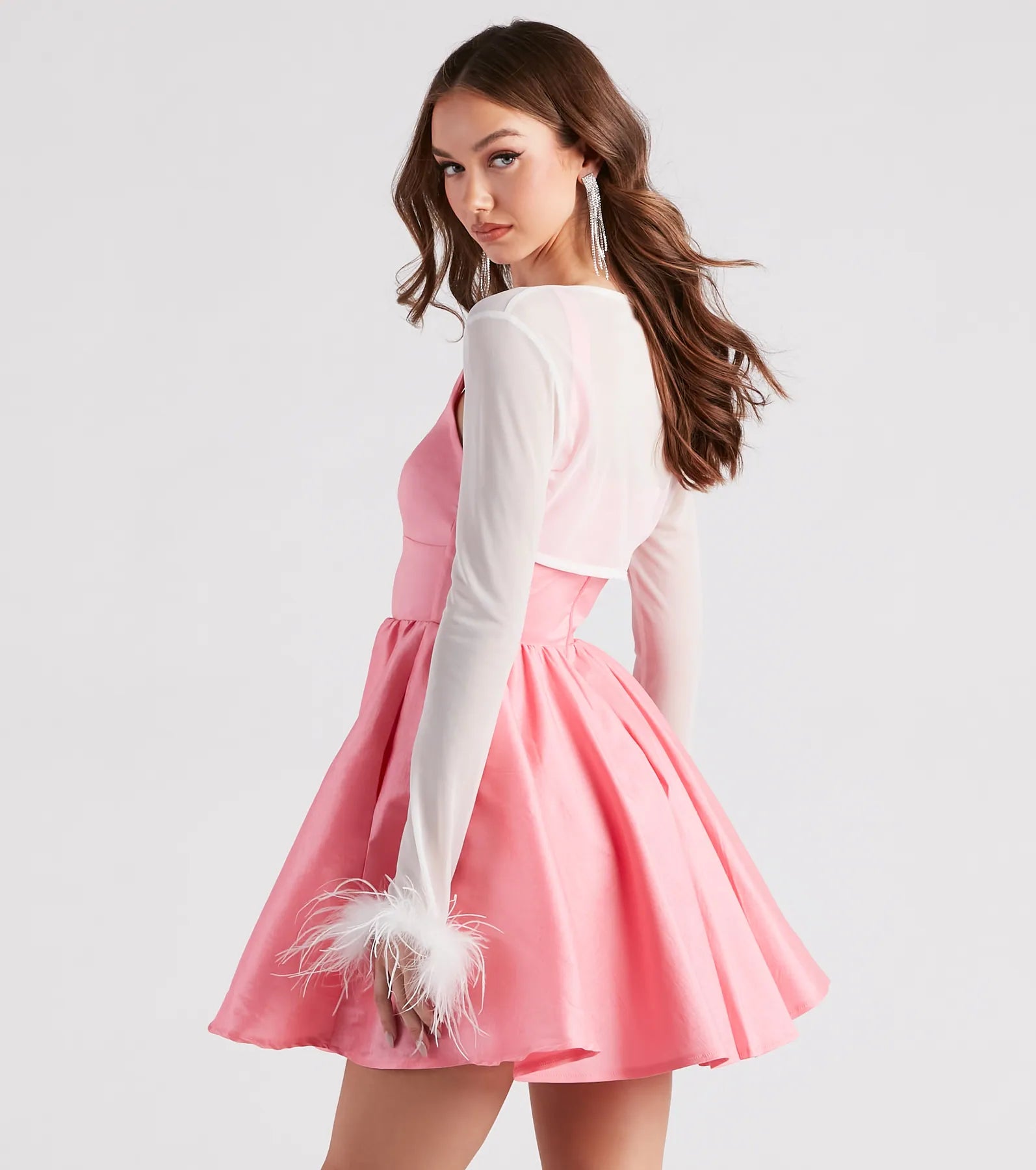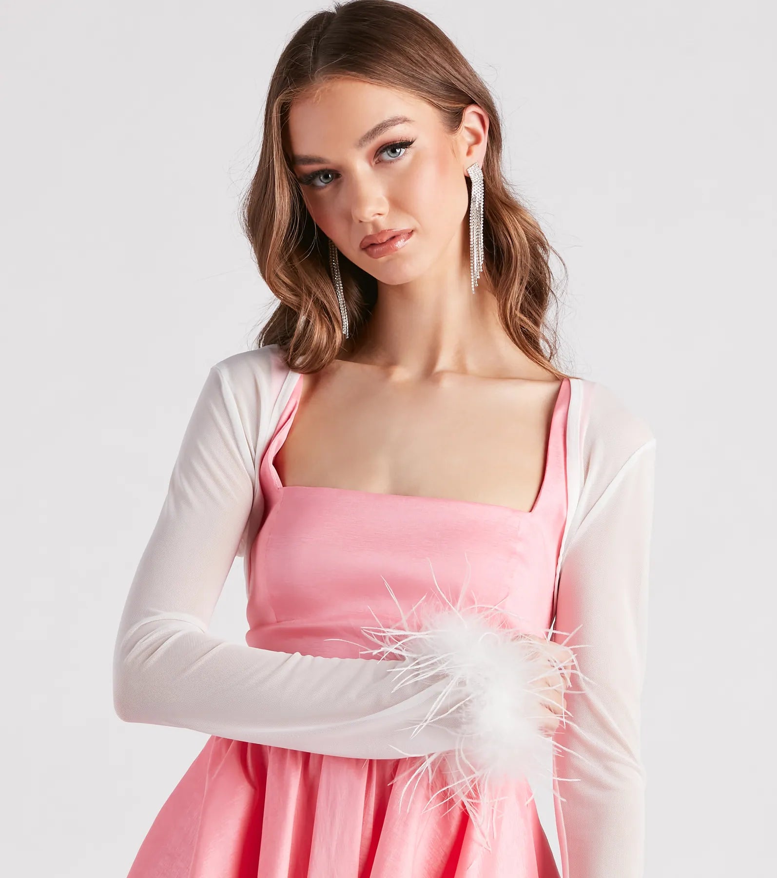 Embrace your diva-darling status by layering on this mesh bolero over your formal dress! It features fitted long sleeves with a marabou feather trim, an open front design, and an ultra-cropped hem. Complete the look with fringe earrings.