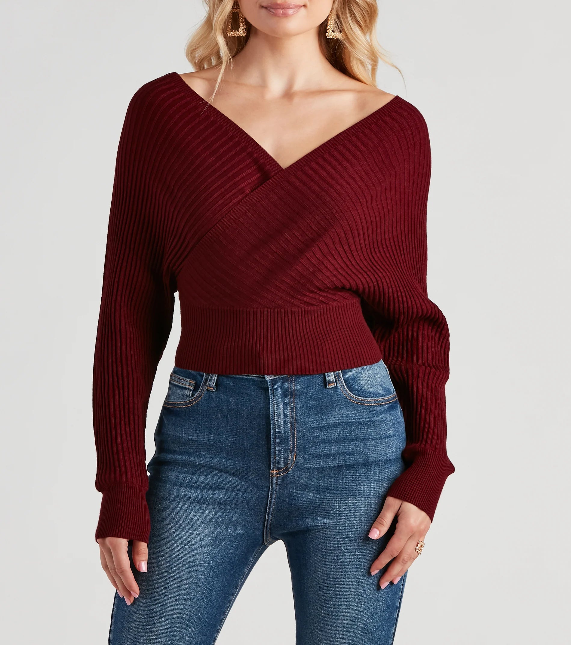 Embrace a modern twist on knitwear with this double V-neck sweater. The deep V-neckline at the front and back offers a hint of allure, while the soft ribbed texture provides both warmth and a flattering fit that accentuates the waist. This long-sleeve sweater is a stylish choice for both casual and sophisticated looks. It's a versatile piece that pairs seamlessly with anything from denim to high-waist trousers, making it a must-have for your seasonal wardrobe.