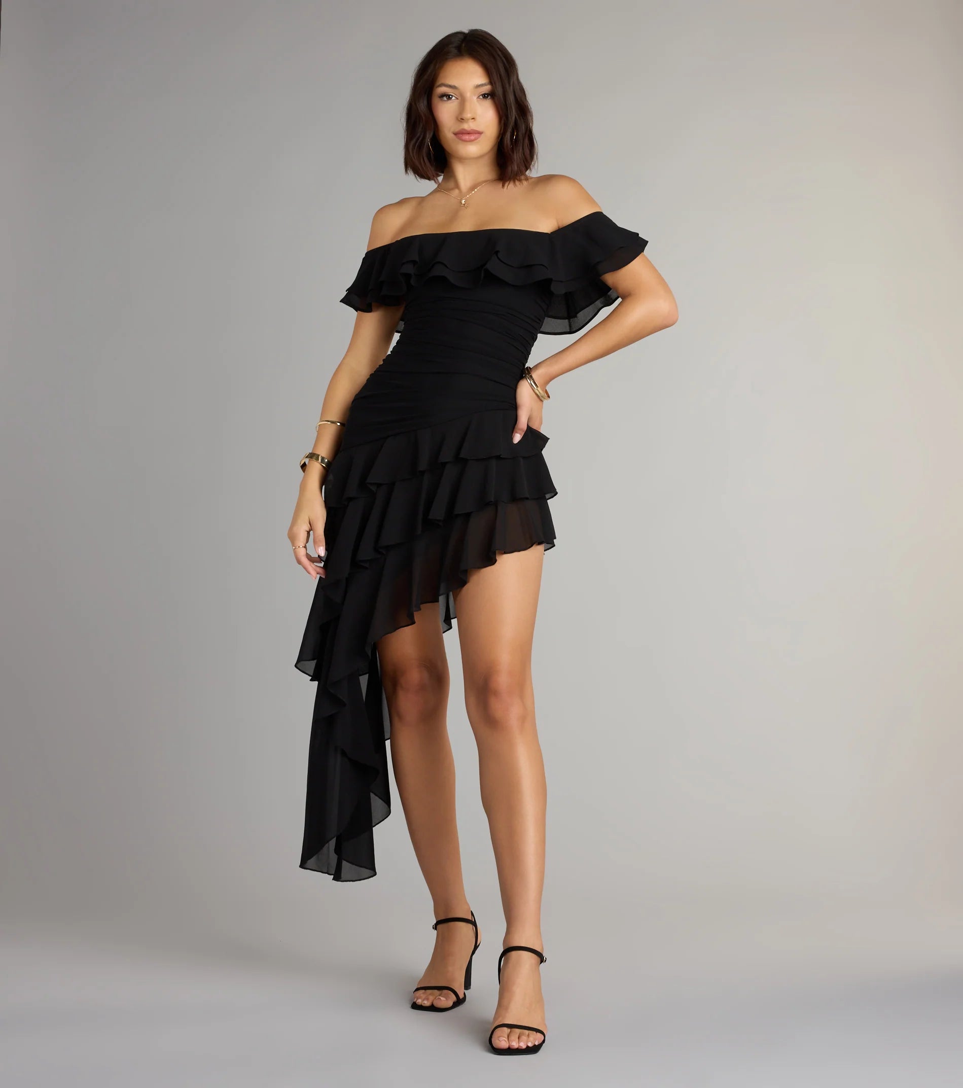 Soft glam, loud entrance. With an off-the-shoulder neckline and fluttery ruffles, this chiffon mini dress was made to float through the spotlight at parties and events!