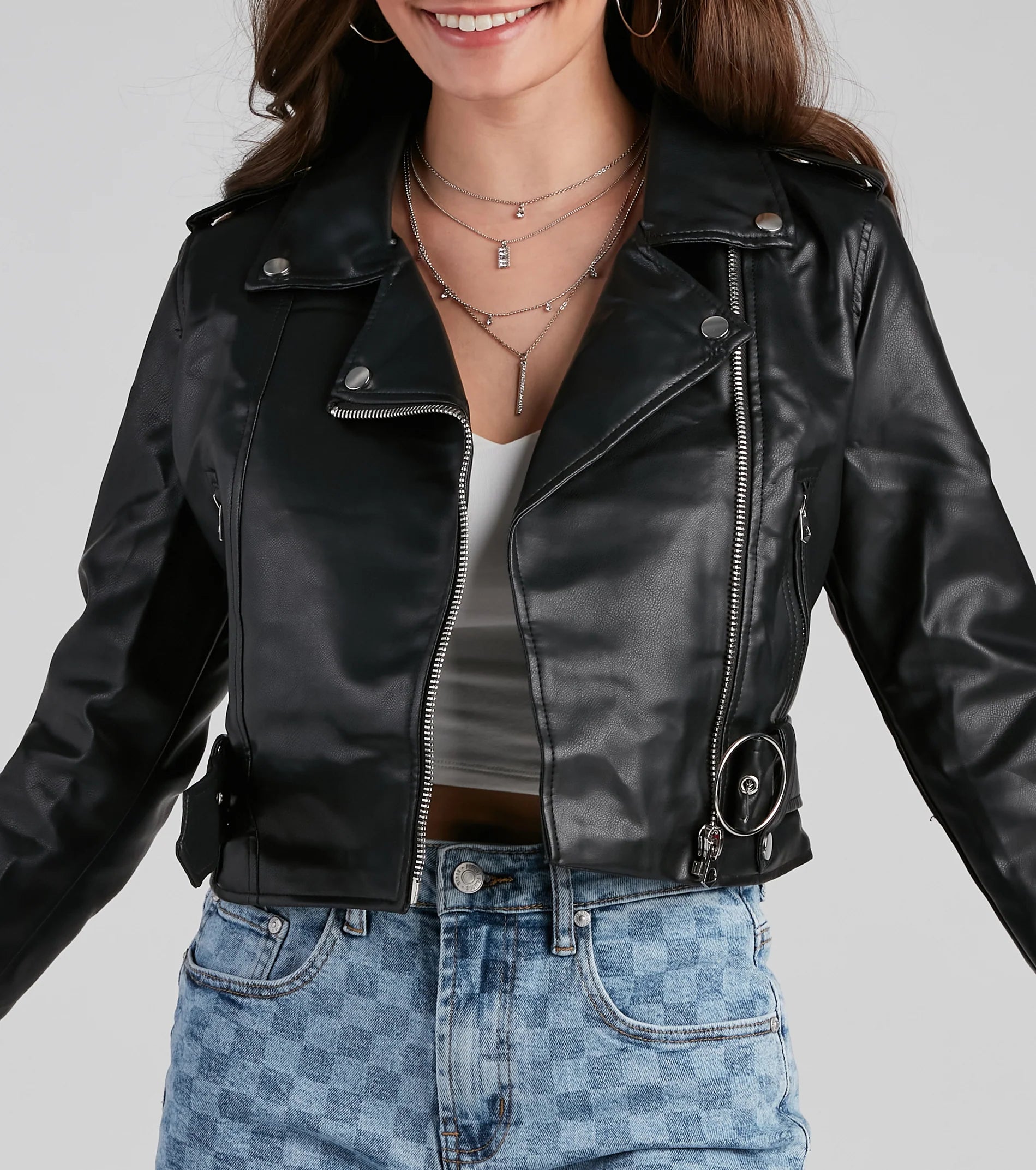 Keep it edgy-chic with a moto jacket to layer over your night-out looks. The jacket features a collared neckline accented with button accents, an asymmetrical zipper front closure, zippered side pockets, long sleeves, and a belted hem with metal grommets. The jacket is composed of a lined faux leather fabric that offers a form hugging fit with minimal stretch. Complete look with a bodycon and heels.